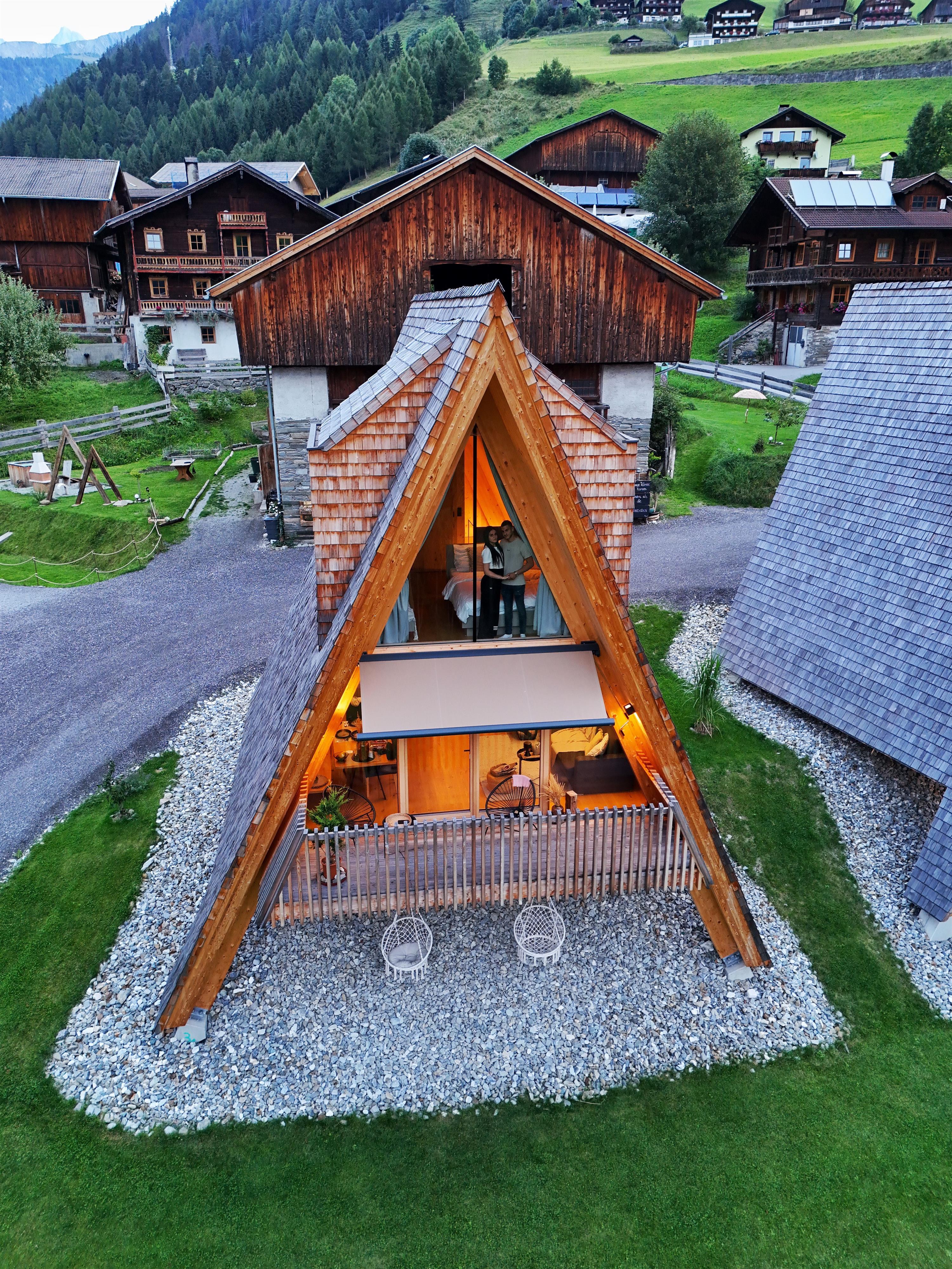 Das COLLIS HILL in Kals am Großglockner erwartet euch. Die Form der dreieckigen Holzbauten ist inspiriert von nordamerikanischen Tipis und genauso von den hoch aufragenden Berggipfeln und Baumwipfeln.