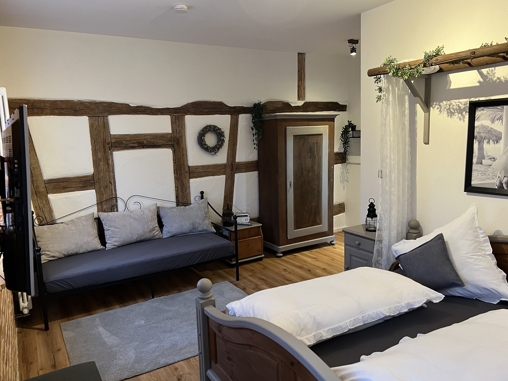 Ziegelstein und Fachwerkwände sind die besonderen Merkmale dieses Zimmers(24 qm). Im Massivholzbett träumen Sie unter einem Betthimmel und können das Fernsehprogramm des Flachbild-TV´s ebenso genießen, wie auf dem nostalgischen Schlafsofa(90x190). Die ebenerdige Dusche hat einen Regenwasserduschkopf und eine Handbrause. Ebenfalls finden Sie im Bad einen Handtuchwärmer und einen Fön! Handtücher, freies WLAN und 1 Flasche Wasser bei Anreise sind im Preis enthalten. Ebenfalls bieten wir einen Wäscheservice an.