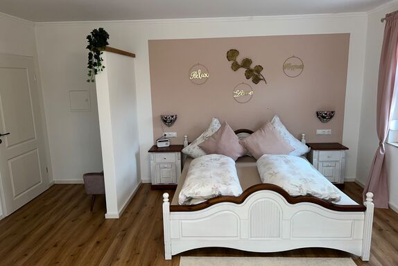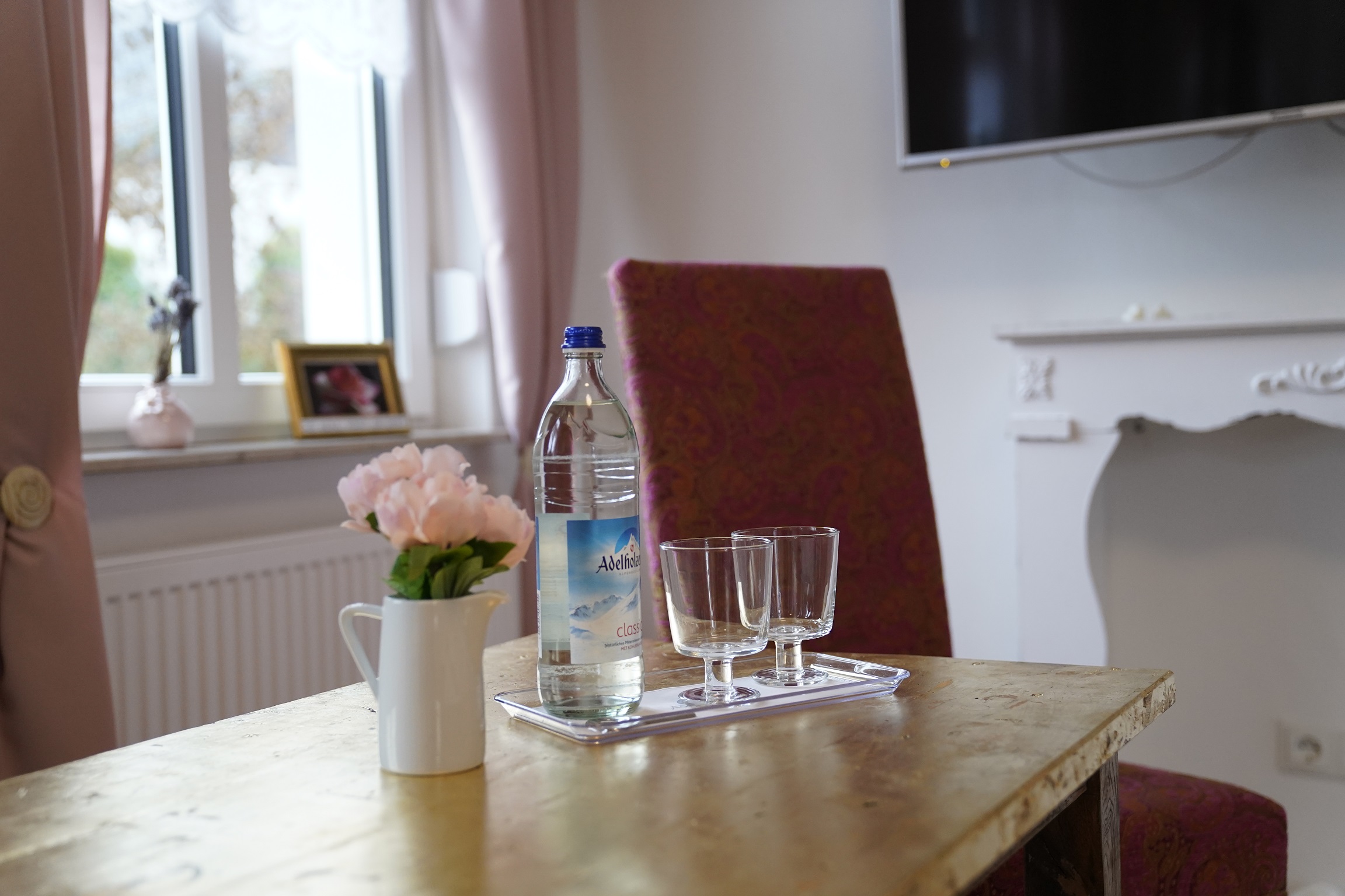 Das romantischste Zimmer, wie der Name schon verspricht, ist großzügig (30 qm), edel, nostalgisch und liebevoll gestaltet. Sie schlafen in einem Massivholz-Bett (180x200) und können auch von der kleinen Sitzgruppe aus das Fernsehprogramm auf dem Flachbildschirm genießen. Im Bad haben Sie eine ebenerdige Dusche mit Regenduschkopf und Handbrause, sowie Handtuchwärmer und einen Fön! Handtücher, freies WLAN und 1 Flasche Wasser bei der Anreise sind im Preis enthalten. Außerdem bieten wir einen Wäscheservice an!