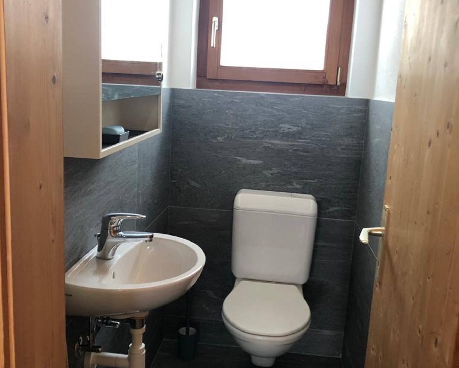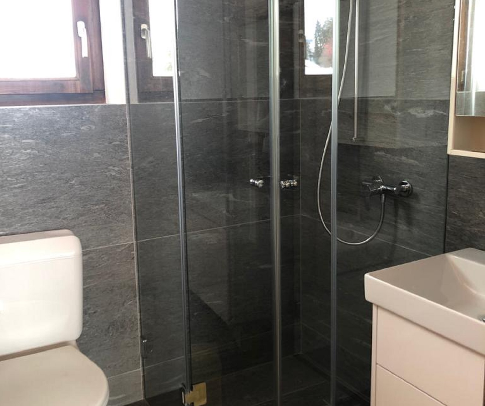 Küche mit Gschirrspüler und Glaskeramik, Backofen. Die Küche ist komplett ausgestattet mit Geschirr, Kaffeemaschine, Raclette- und Fondue-Set können beim Vermieter verlangt werden. Badezimmer: