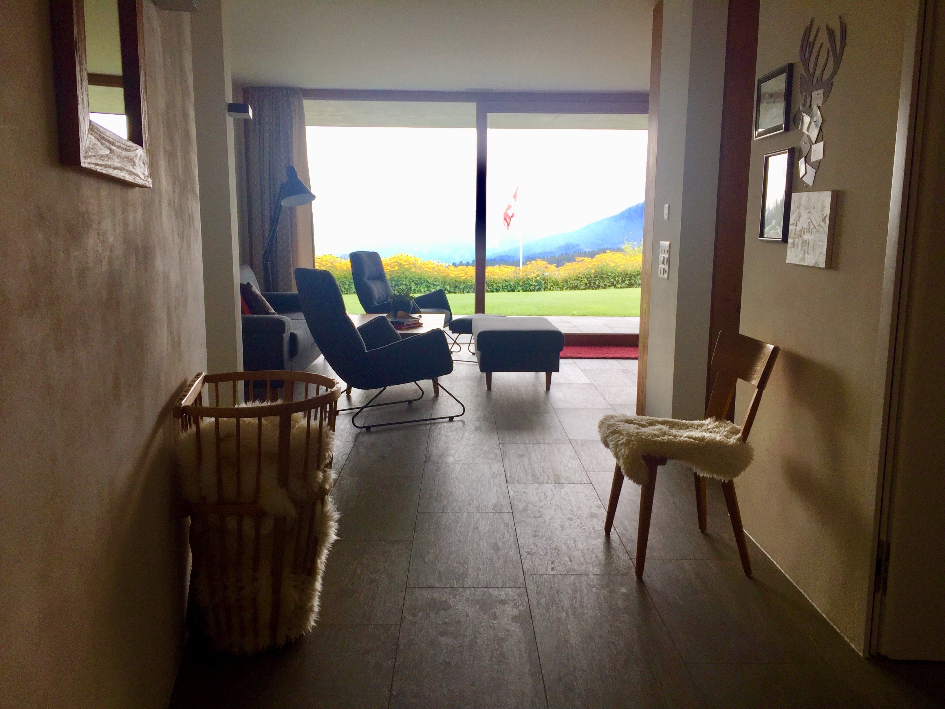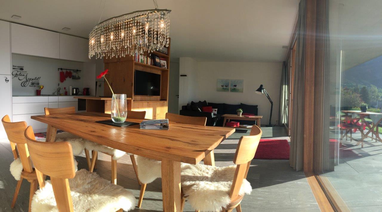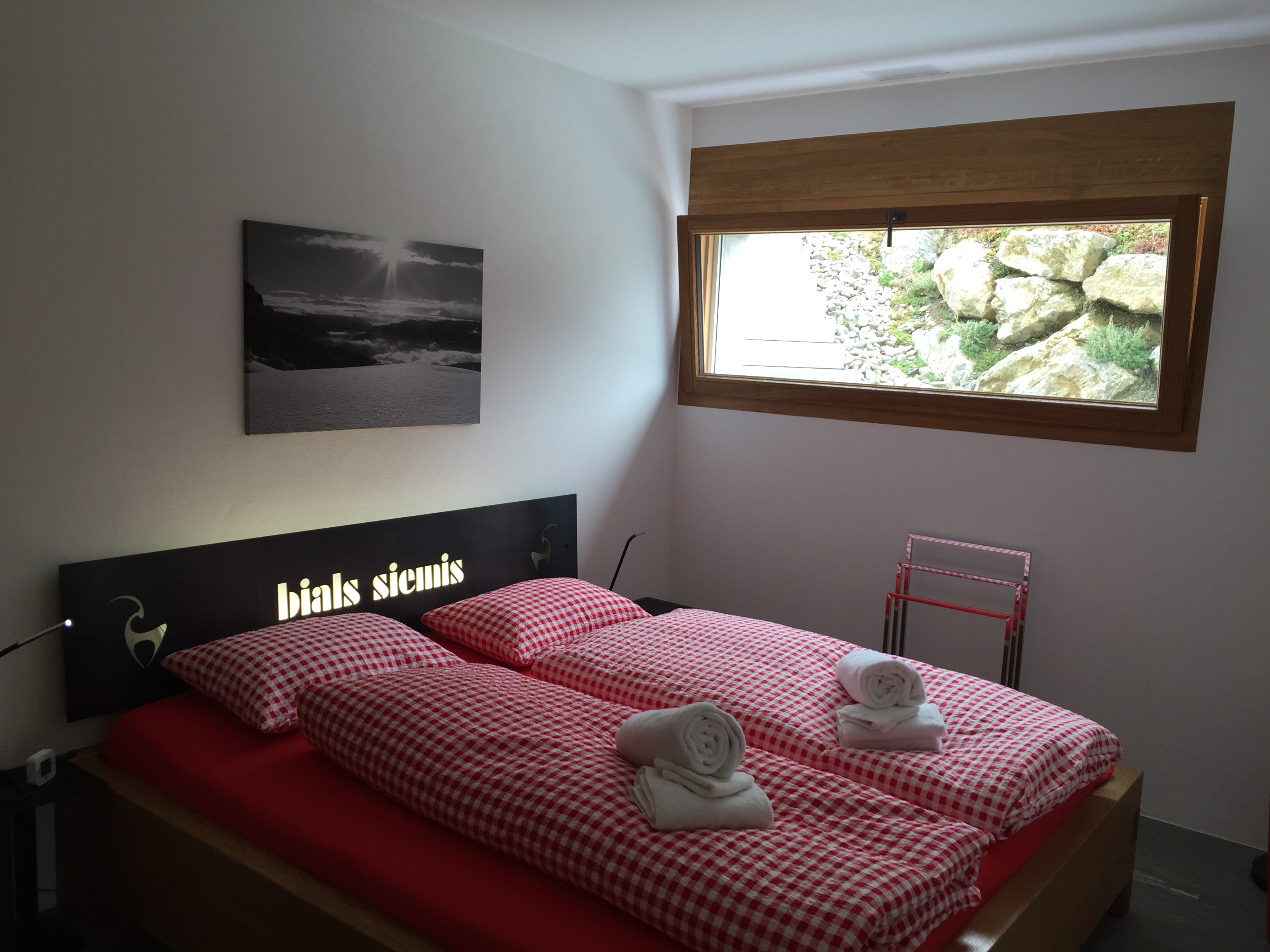 Moderne Ferienwohnung direkt an der Skipiste! Hochwertig ausgestattete gemütliche Wohnung (Valserstein/Eiche). Spektakuläre Aussicht durch Panoramafenster auf Flims und die Bergkette. Die Wohnung verfügt über eine kontrollierte Lüftung, Bodenheizung und Skischuhtrockner. Eine grosszügige Polstergruppe mit einem Couchtisch, ein Flatscreen-TV mit Kabelanschluss und DVD Player sowie ein Schrank mit Spielen und DVDs stellen wir den Gästen gerne zur Verfügung. WLAN ist in der ganzen Wohnung mit gutem Signal kostenlos nutzbar. In einem zusätzlichen Keller befindet sich die Waschmaschine und der Tumbler (wird auch von der Wohnung oberhalb benutzt). Die Wäsche kann anschliessend im Abstellraum getrocknet werden. Auf der grossen, überdachten Terrasse stehen zwei Liegestühle und 4 Stühle mit Tisch für Sie bereit. Ebenso finden Sie einen Gasgrill im grosszügigen Garten vor. Haustiere sind leider keine erlaubt. Das Auto kann am Anreise, bzw. Abreisetag kostenlos in der Tiefgarage gelassen werden. Es hat genügend Platz für Velos, Schlitten und Skis. Ein Zusatzparkplatz kann auf Anfrage für Fr. 10.00/Tag dazu gemietet werden. Im grossen Abstellraum (integriert in der Wohnung) befindet sich ein Gefrierschrank und eine Mikrowelle. Ebenfalls hat es genügend Platz für Skischuhe, Skikleider, Koffer etc.