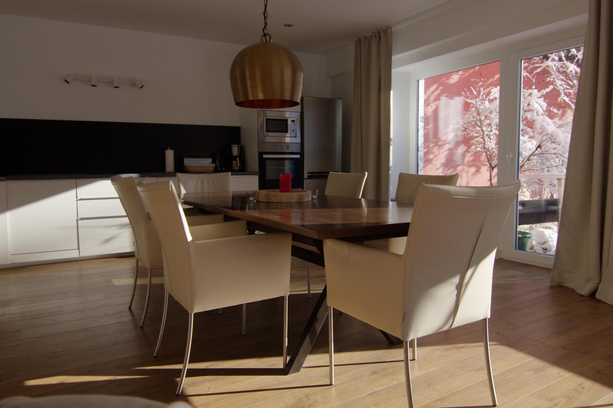 Tolle Erdgeschosswohnung mit riesiger Terrasse/Garten und ca. 45 m² großem Wohn-Esszimmer mit offener Küche. 2 Schlafzimmer mit je 1,60 m breitem Boxspringbett. Küche mit Komplettausstattung.