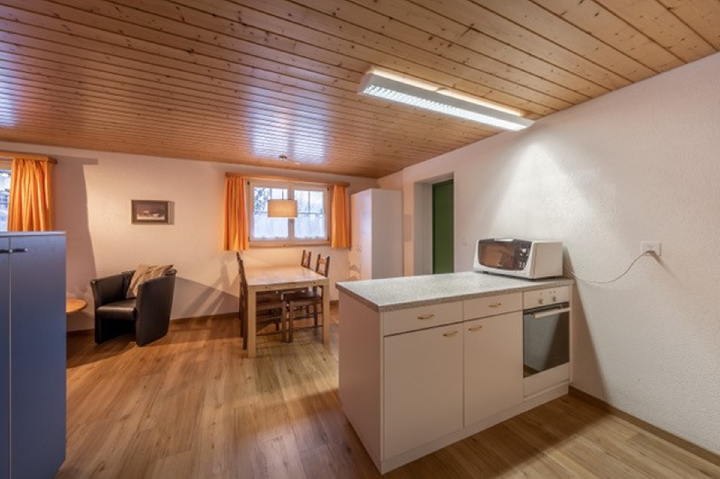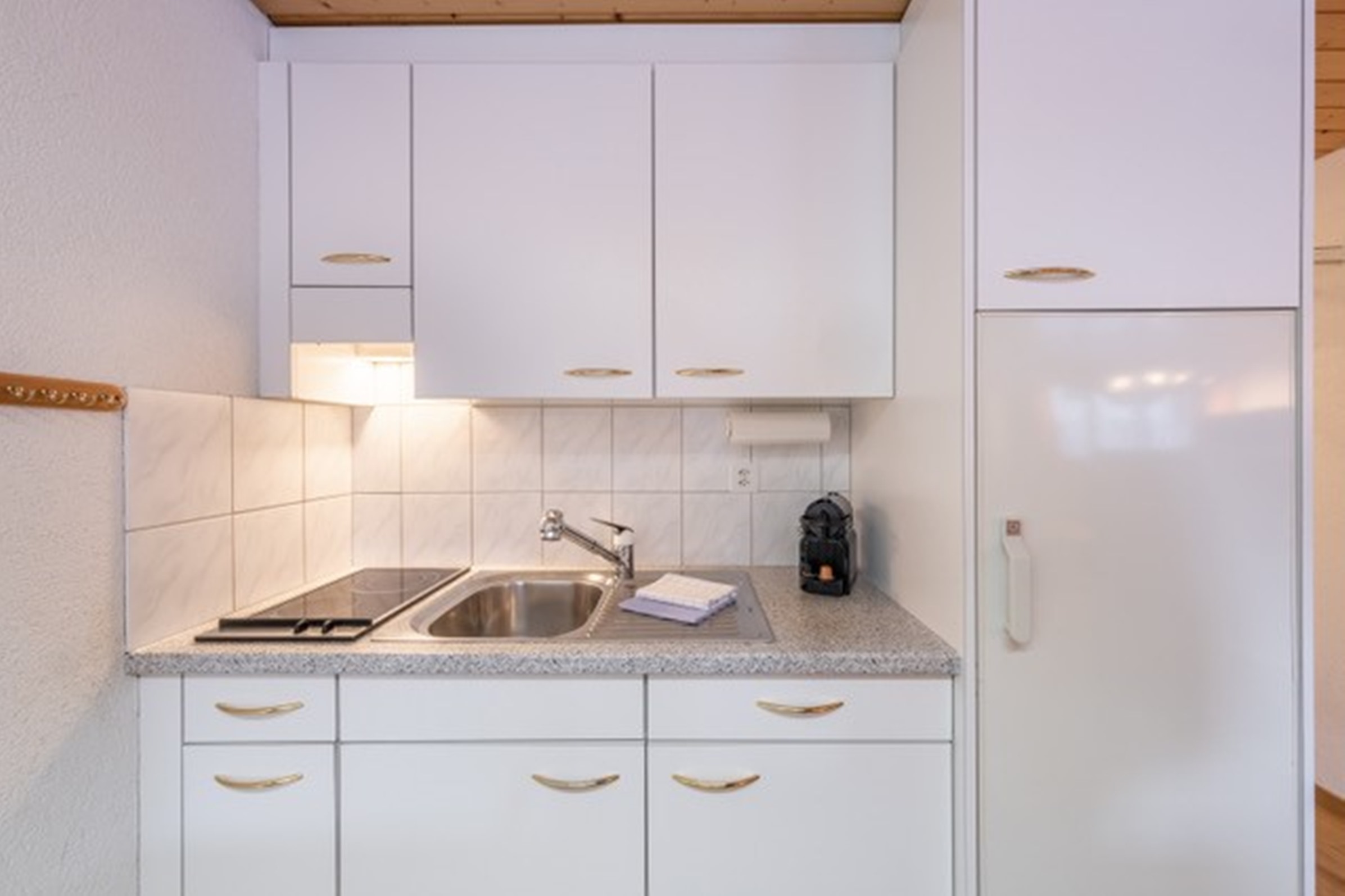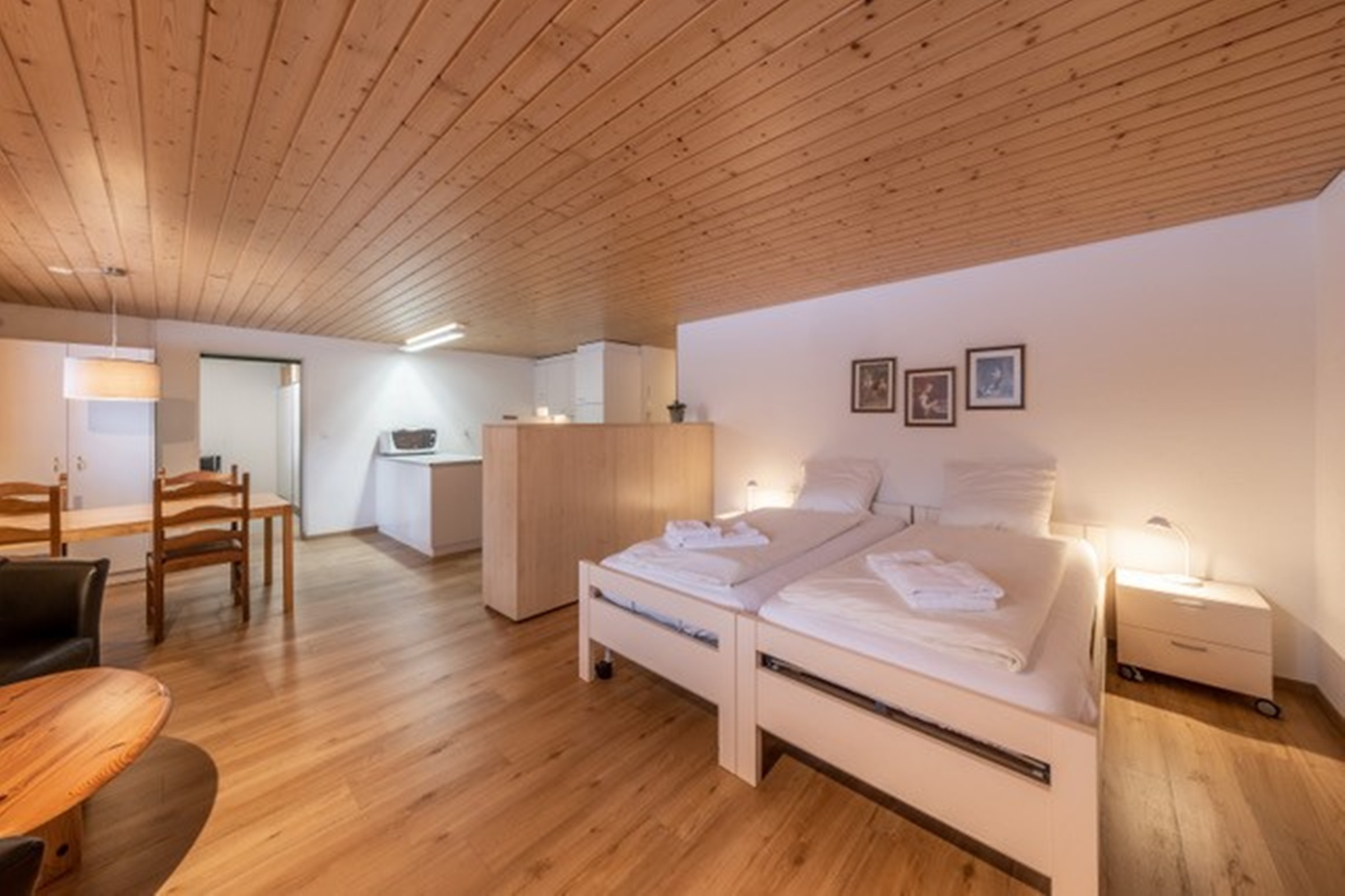 Die Ferienwohnung verfügt über Komfort-Einzelbetten (90x200cm) elektrisch verstellbar, bei Bedarf kann ein Pflegebett untergebracht werden Modernes Badezimmer mit Dusche und WC Wohnzimmer mit Clubsessel, Essbereich für vier Personen Offene Wohnküche mit Kochfeld, Backofen, Mikrowelle, Kühlschrank und Nespressomaschine Inneneinrichtung & Technik