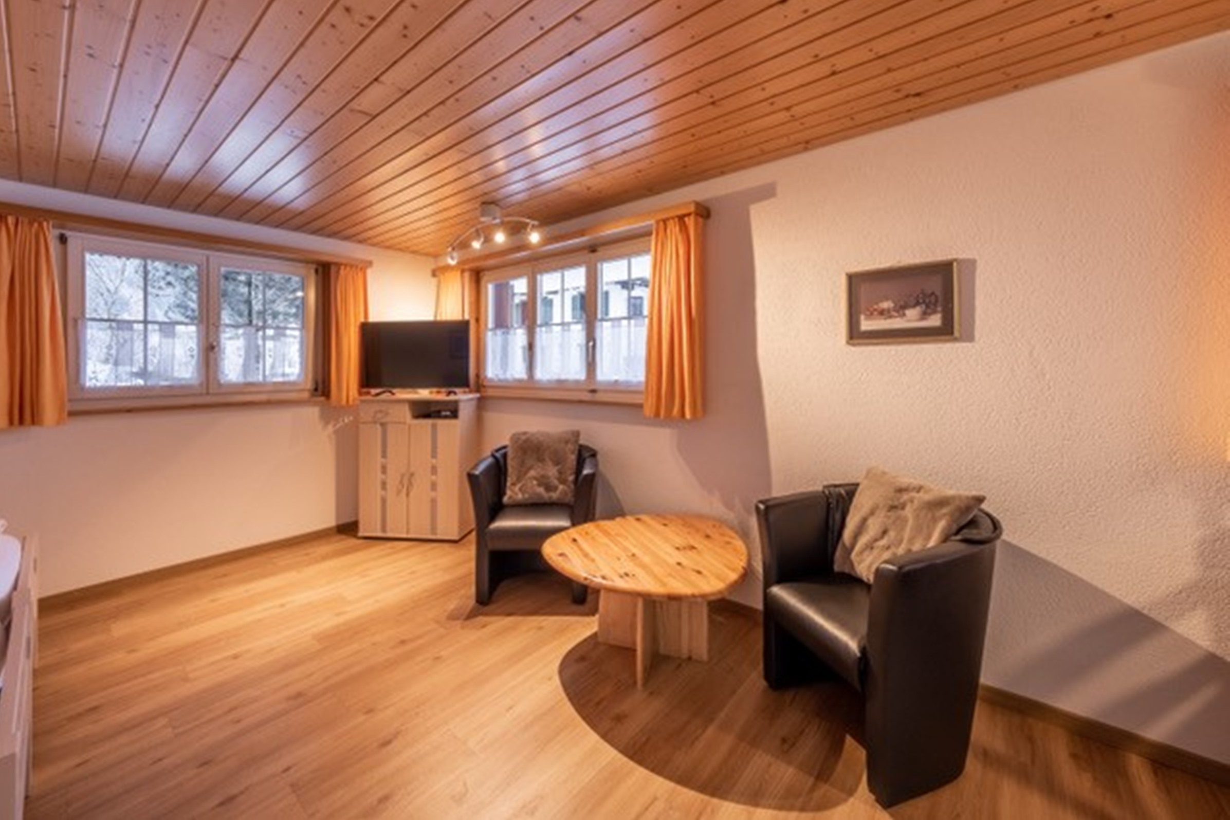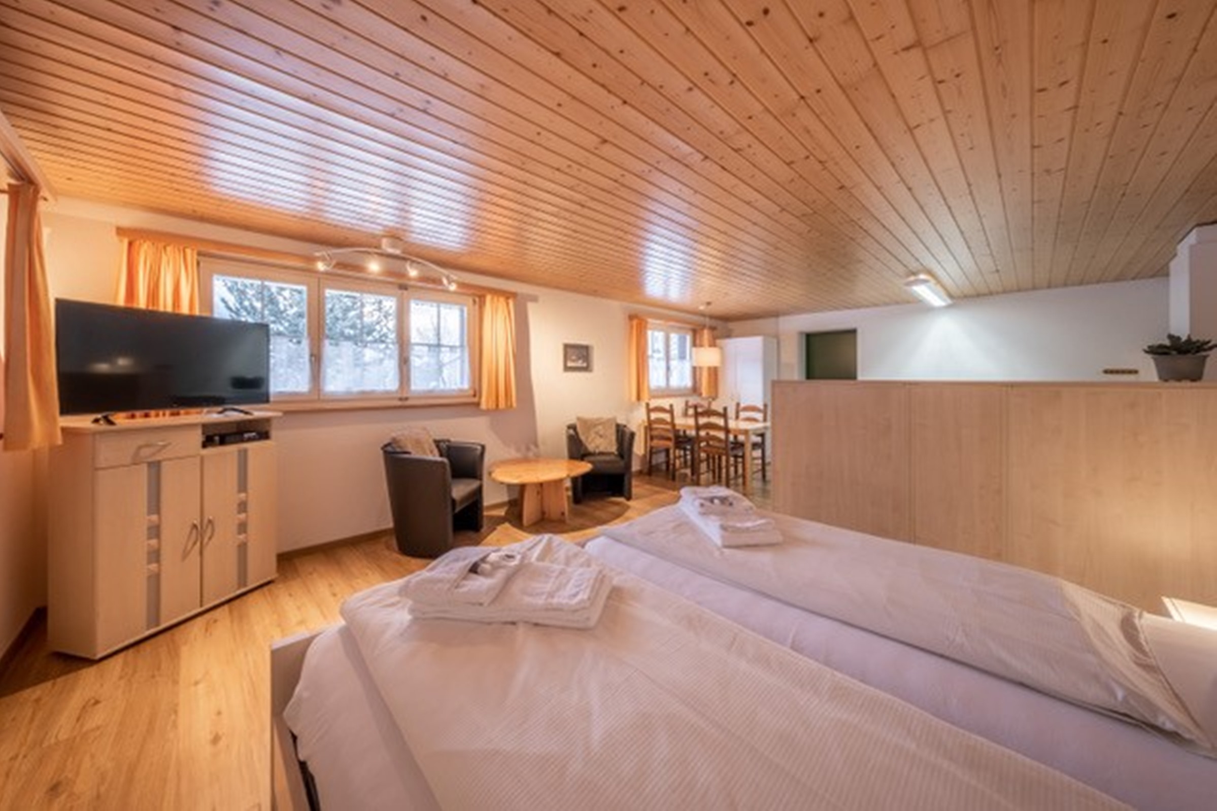 Die Wohnungen verfügen alle über einen geräumigen und gemütlichen Wohnraum, Esstisch mit Stühlen, Fauteuils oder Sofa (z.T. Bettsofa), Klubtisch und offene Einbauküche mit Kühlschrank und Geschirrspüler. Badezimmer mit Dusche oder Badewanne, WC, Lavabo, Waschmaschine/Tumbler. Balkon mit Liegestühlen und Tisch mit Stühlen. Technische Einrichtungen
