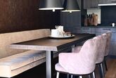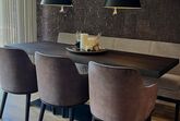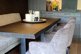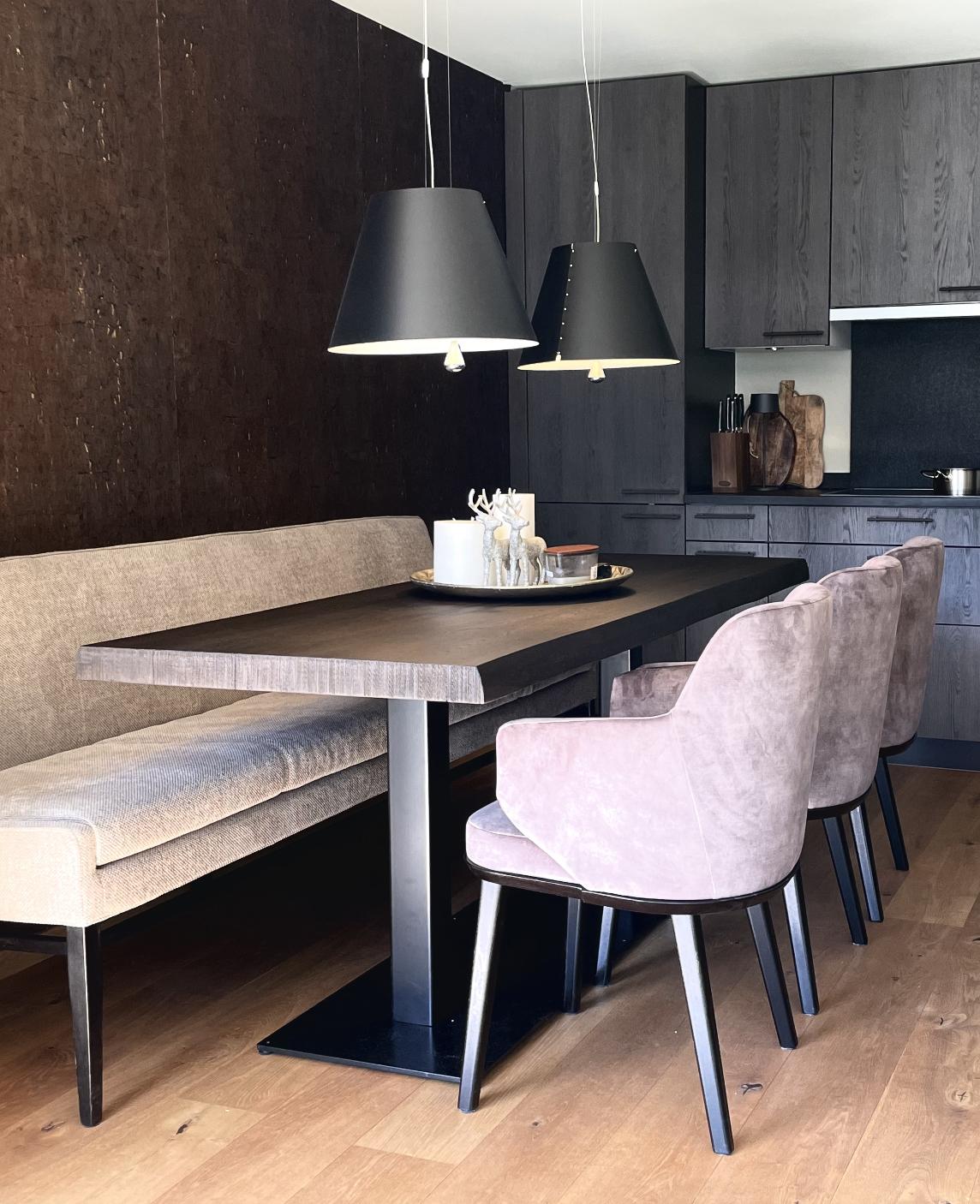 Der Esstisch bietet bequem Platz für 6 Erwachsene und hat Stühle für bis zu 8 Personen.