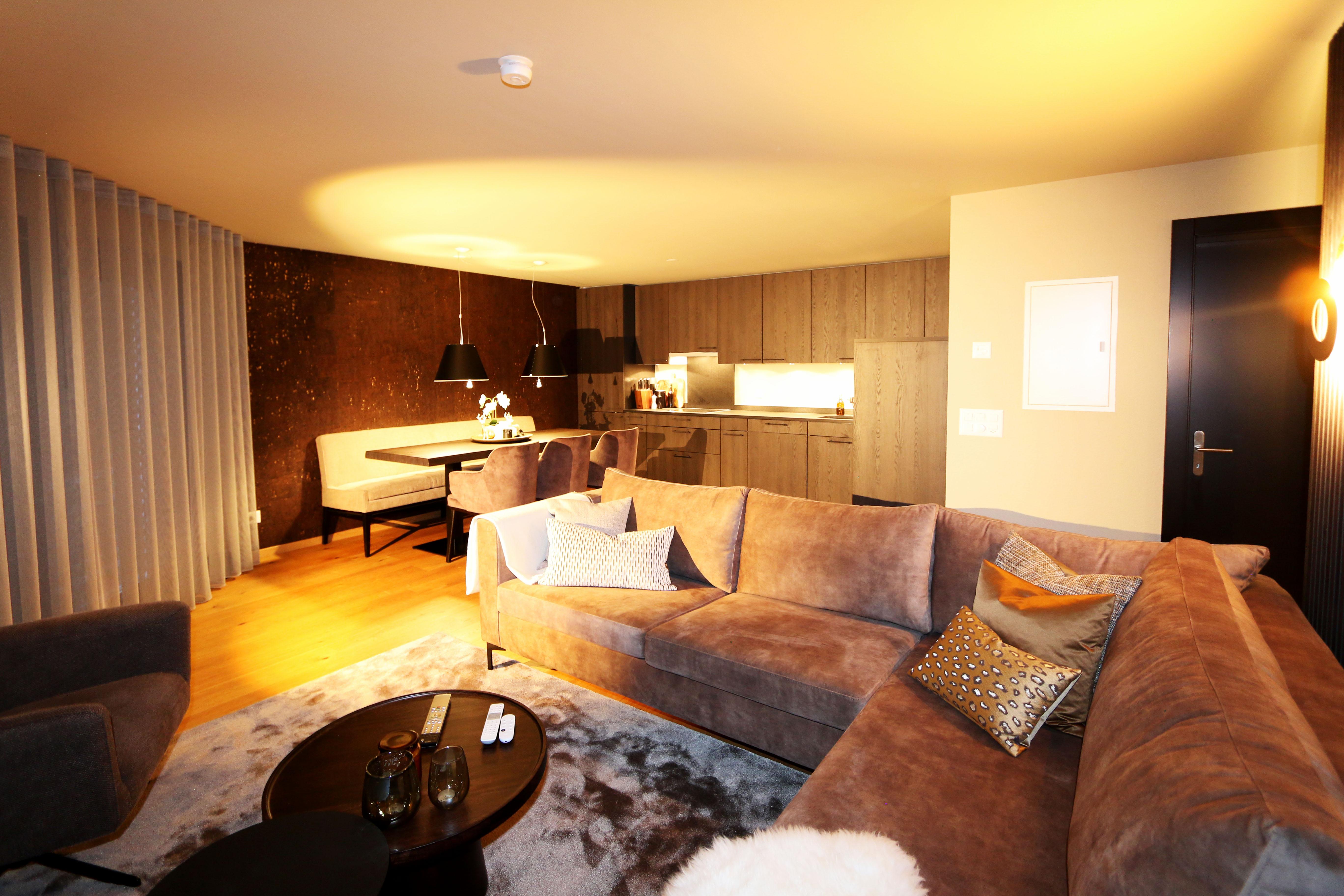 Das Wohnzimmer hat eine gute Größe und bietet einen fantastischen Blick auf die Berge. Es hat einen großen HD-Flachbildschirmfernseher mit einer grossen Auswhal von Kanälen aus verschiedenen europäischen Ländern. Ihre Lieblingsmusik können Sie direkt vom Sonos-Lautsprecher hören welchen man angeschliessen kann.