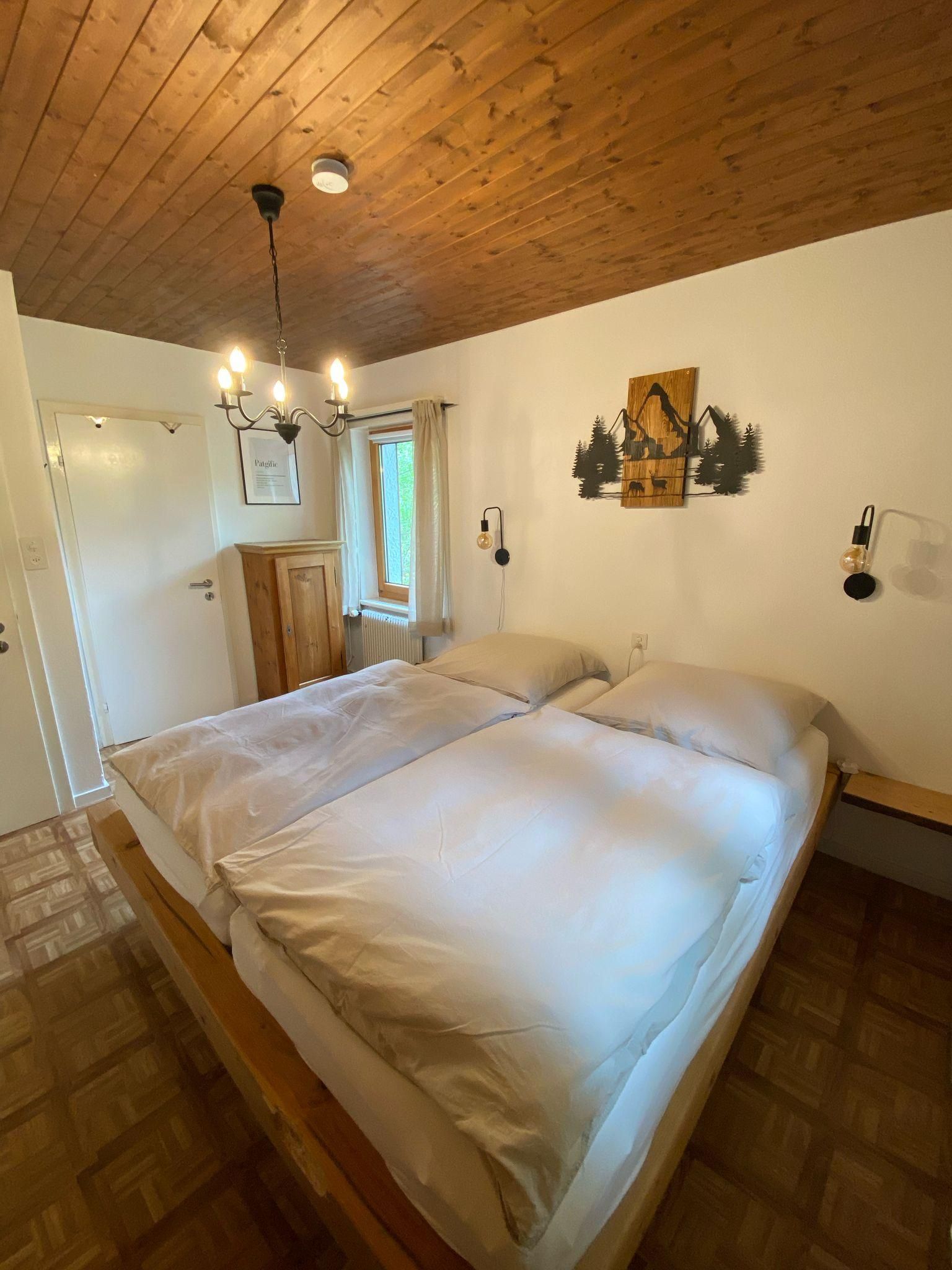 3 1/2-Zimmereinfamilienhaus ca. 65m2 im Erdgeschoss. Wohnzimmer mit Cheminée. TV und Radio. 1 Schlafzimmer mit 1 Doppelbett. 1 Schlafzimmer mit 1 Etagenbett, insgesamt 4 Betten. Bad/WC und Haartrockner. Separate Küche mit Backofen, Microwelle, Toaster, Kühlschrank, Geschirrspülmaschine, Wasserkocher, Kaffeemaschine (Nespresso), Racletteofen, Fondue Caquelon. Bettwäsche, Küchentücher und Frottéewäsche vorhanden. Haustiere nicht erlaubt. Nichtraucherwohnung. WLAN. Garten, Gartensitzplatz und Terrasse. Parkplatz. Waschmaschine und Wäschetrockner. Skiraum.