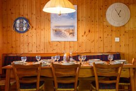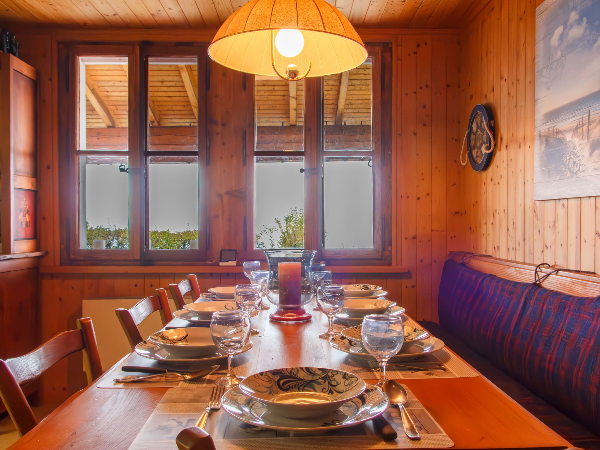 Le Cabanon, 5-Zimmer-Chalet. Komfortabel und gemütlich eingerichtet: Wohn-/Esszimmer mit Schwedenofen und Kabel-TV (Flachbildschirm). Ausgang zur Terrasse. Grosse, offene Küche (4 Kochplatten, Backofen, Geschirrspüler, Toaster, Wasserkocher, Mikrowelle, elektrische Kaffeemaschine, Kapseln für die Kaffeemaschine (Nespresso) extra). Dusche/WC, sep. WC. Obergeschoss: 1 Zimmer mit 1 Doppelbett (160 cm, Länge 200 cm). 1 Zimmer mit 1 Doppelbett (160 cm, Länge 200 cm). 1 Zimmer mit 1 x 2 Etagenbetten (90 cm, Länge 200 cm). 1 Zimmer mit 1 x 2 Etagenbetten (90 cm, Länge 200 cm). Sep. WC. Terrasse. Terrassenmöbel. Herrliche Sicht auf den See, die Berge und die Landschaft. Bitte beachten: Nichtraucher-Unterkunft, Parkplatz nur für kleine Wagen.