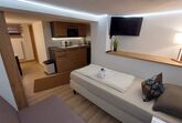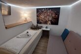 Der Schlafbereich verfügt über zwei Hotel-Boxspringbett 90x210cm und 90x190cm mit Tonnentaschenfederkernmatratzen für einen erholsamen Schlaf, sowie einen 32-SAT- und Smart-TV mit Chromecast build in.