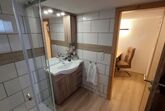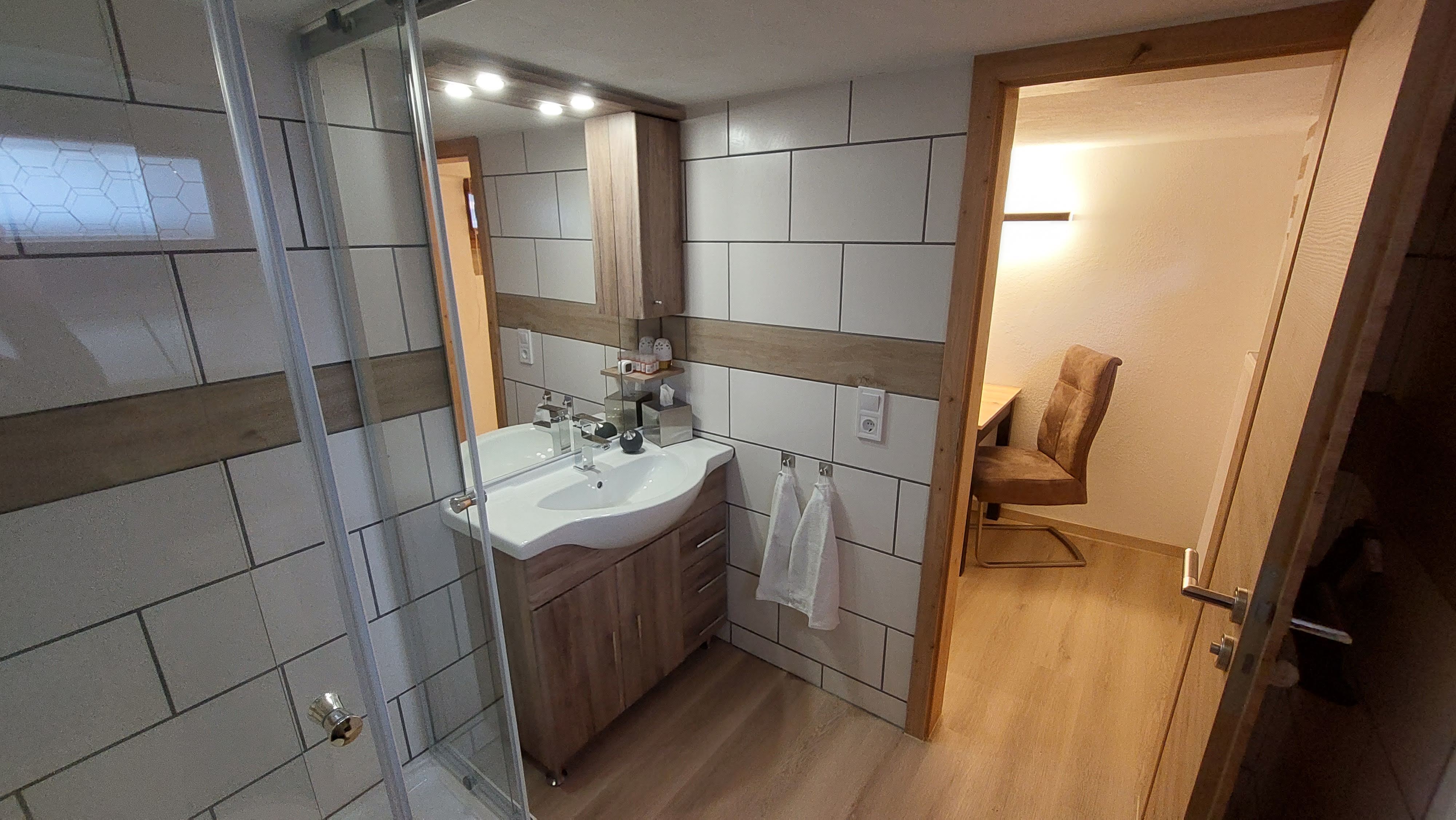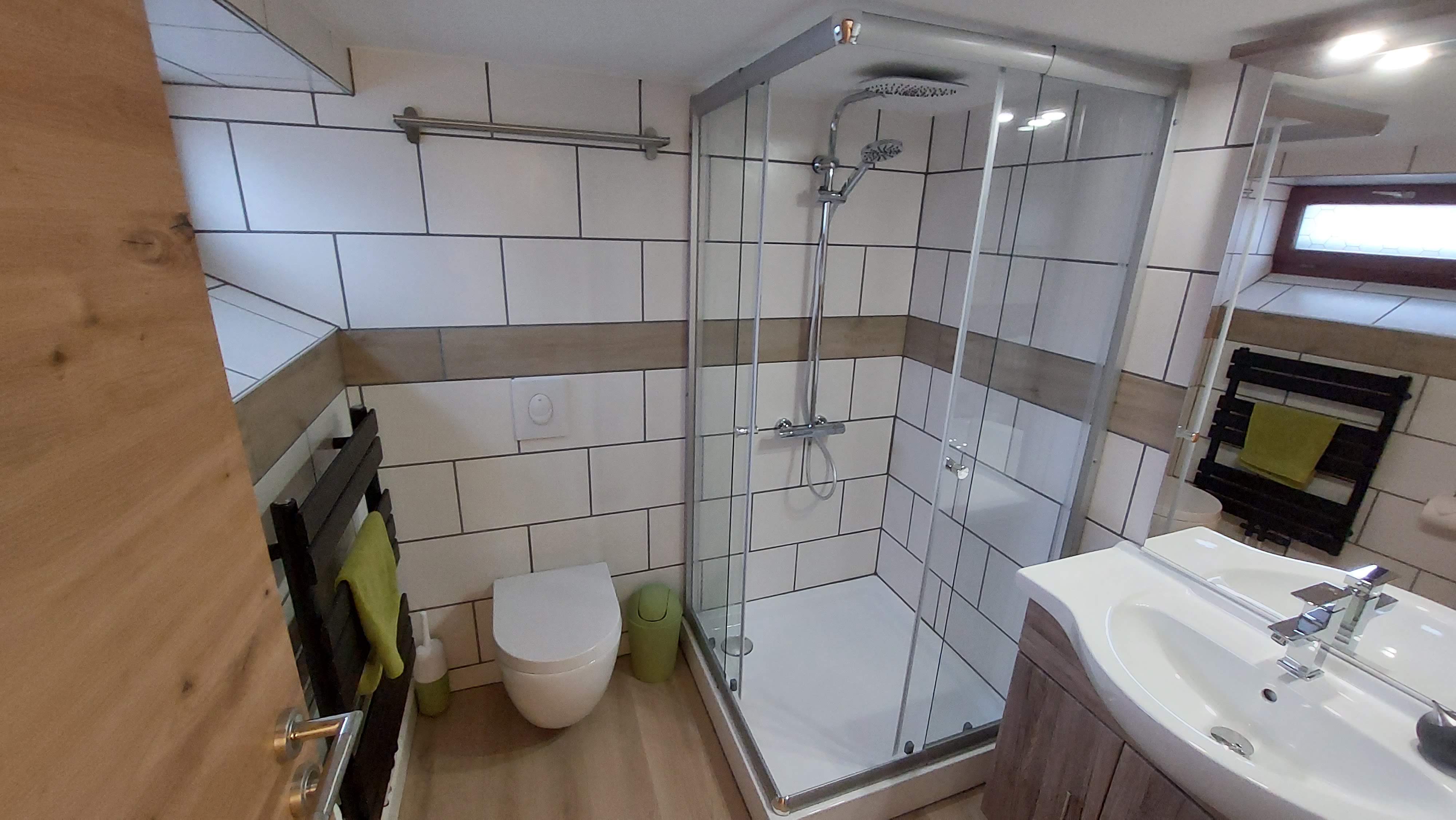 Das Bad ist mit Regendusche 90x90cm, WC, Waschbecken, Handtuchtrockner und Haarföhn ausgestattet.