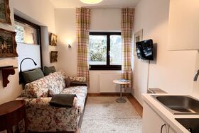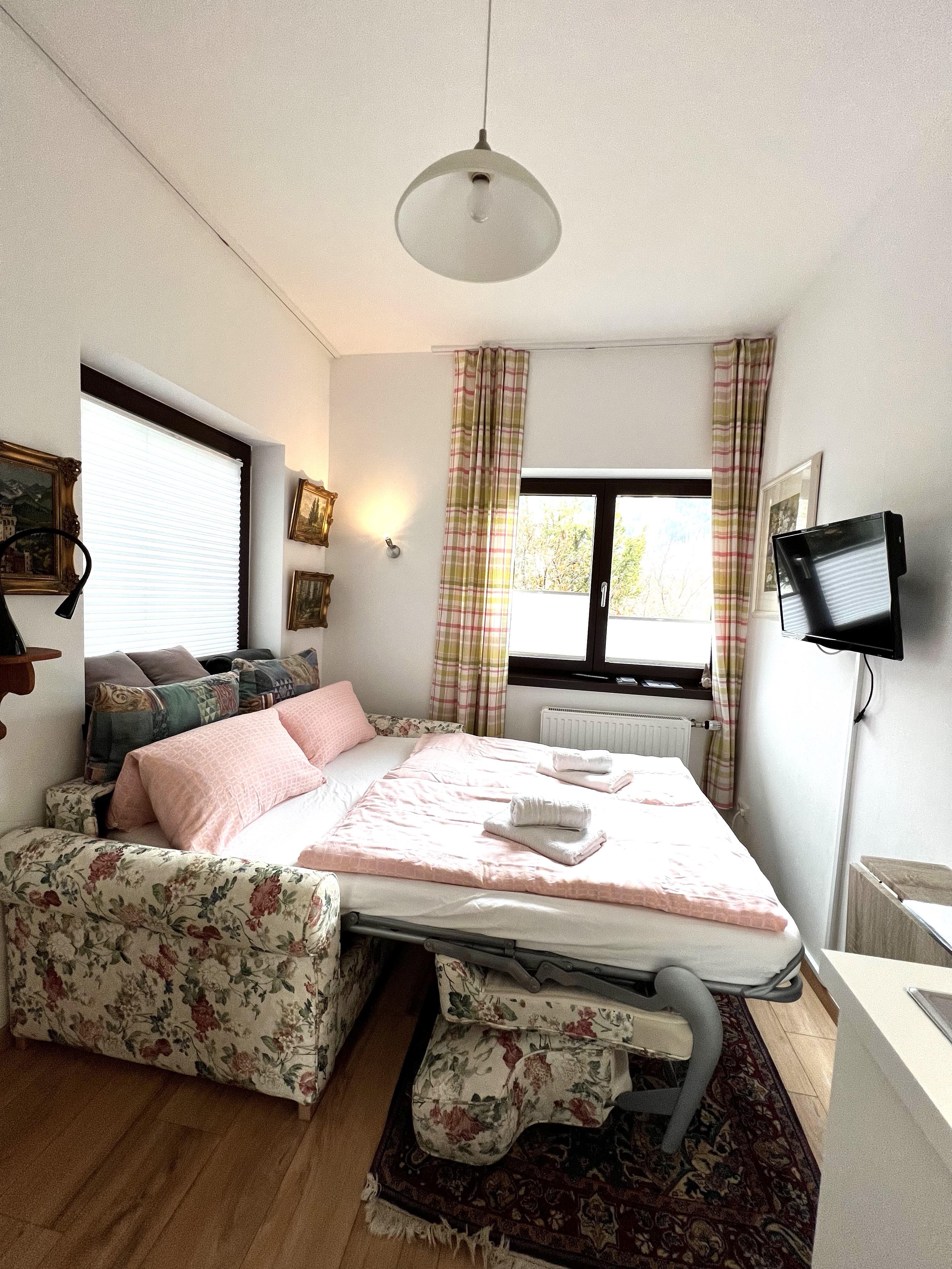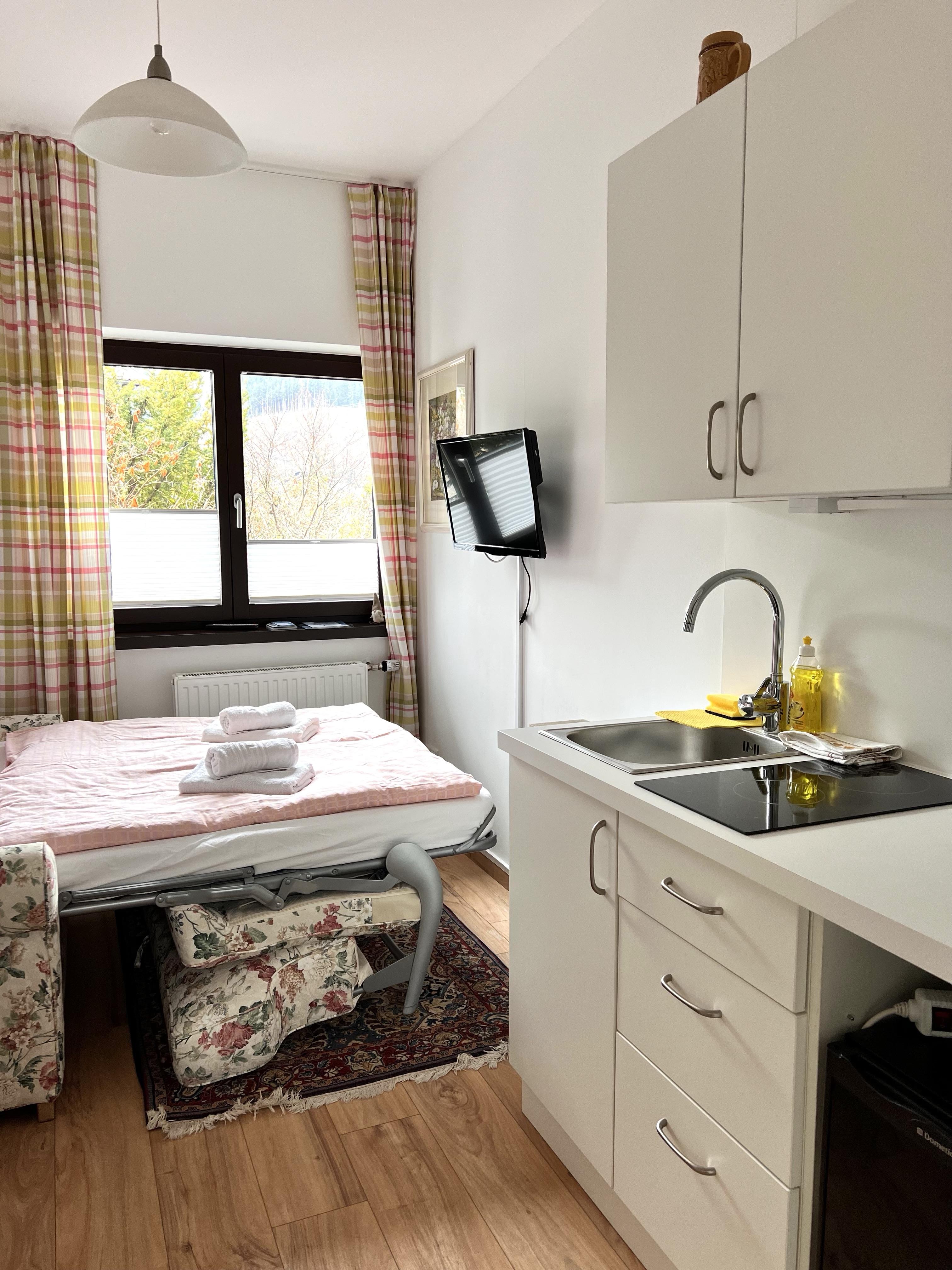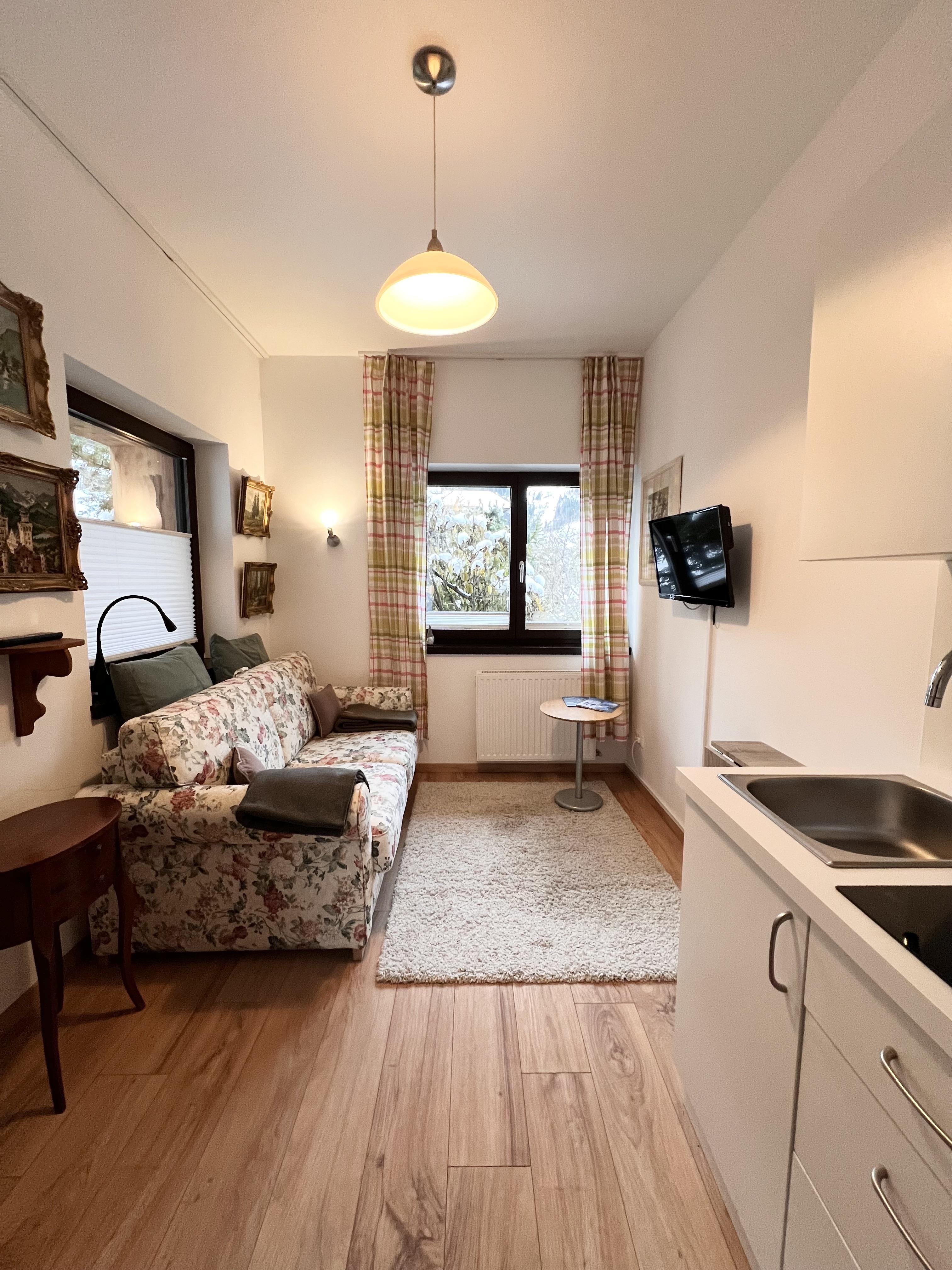 Das kleine helle kuschelige Appartement für 1-2 Personen mit Blick in den Garten und auf die Berge hat alles was man für einen perfekten Urlaub benötigt. Das Sofa wird im Handumdrehen zu einem bequemen Bett mit Ferderkernmatratze (1,40 m x 2,00 m, offenes Fußende), in der Pantryküche könnt ihr euer Essen zubereiten oder einfach nur den Kaffee genießen. Euer großes Bad mit Fenster liegt dem Appartement direkt gegenüber. Es gibt einen begehbaren Kleiderschrank mit vielen Staufächern und Gardrobe. Zusätzlich gibt es einen Skistall im Haus. Euer Appartenemt liegt im Erdgeschoss.