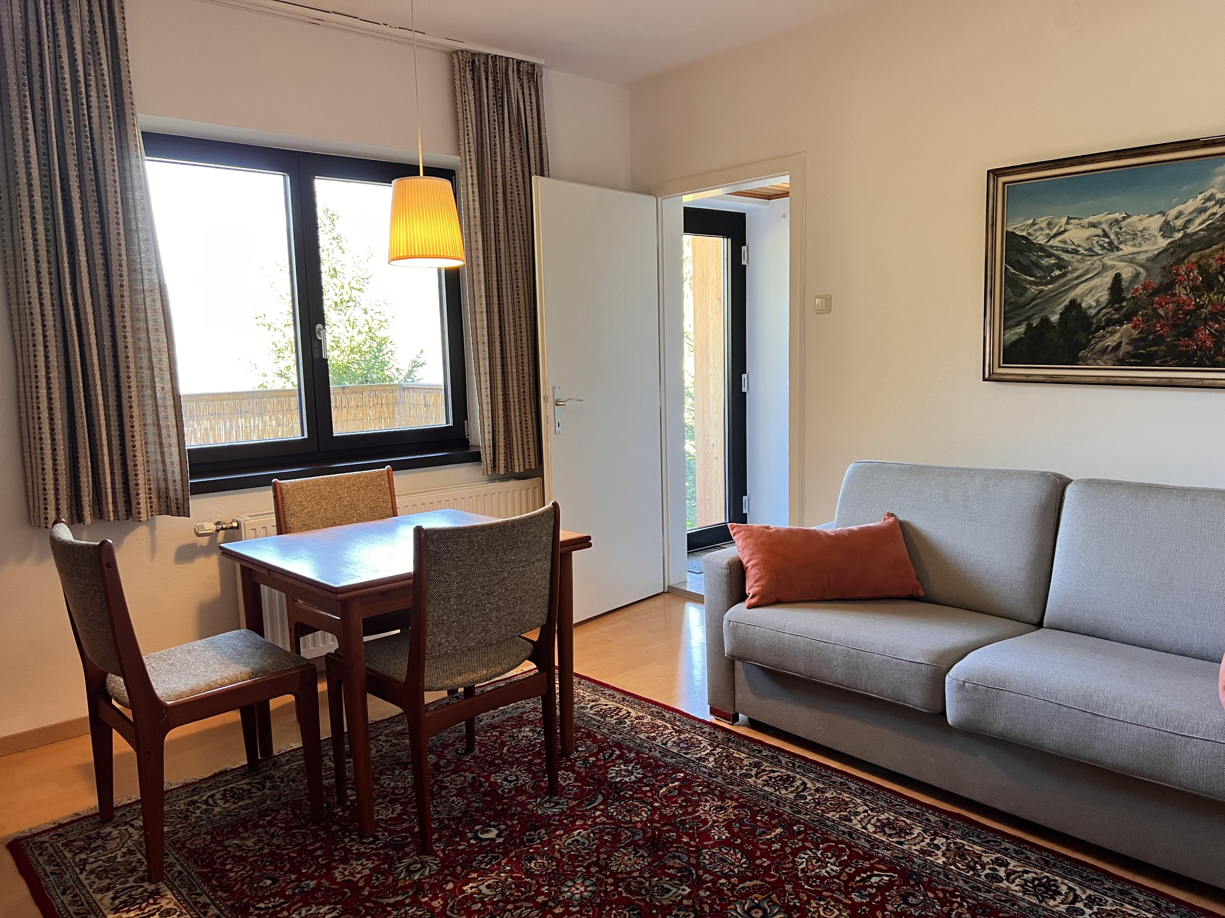 Das Appartement ENZIAN verfügt als einzigstes Appartement über einen direkten Zugang zu dem großen Garten. Da dieser komplett eingezäunt ist könnt ihr euren Hund hier unbeschwert herumtollen lassen. Zusätzlich gibt es eine große überdachte Terrasse. Sowohl das Wohnzimmer als auch beide Schlafzimmer verfügen über einen TV. In der großen Küche gibt es genug Platz um gemeinsam die Speisen zuzubereiten. Bad und Toilette sind voneinander getrennt. Von dem Appartement schaut ihr auf die umliegenden Berge und das Tal.