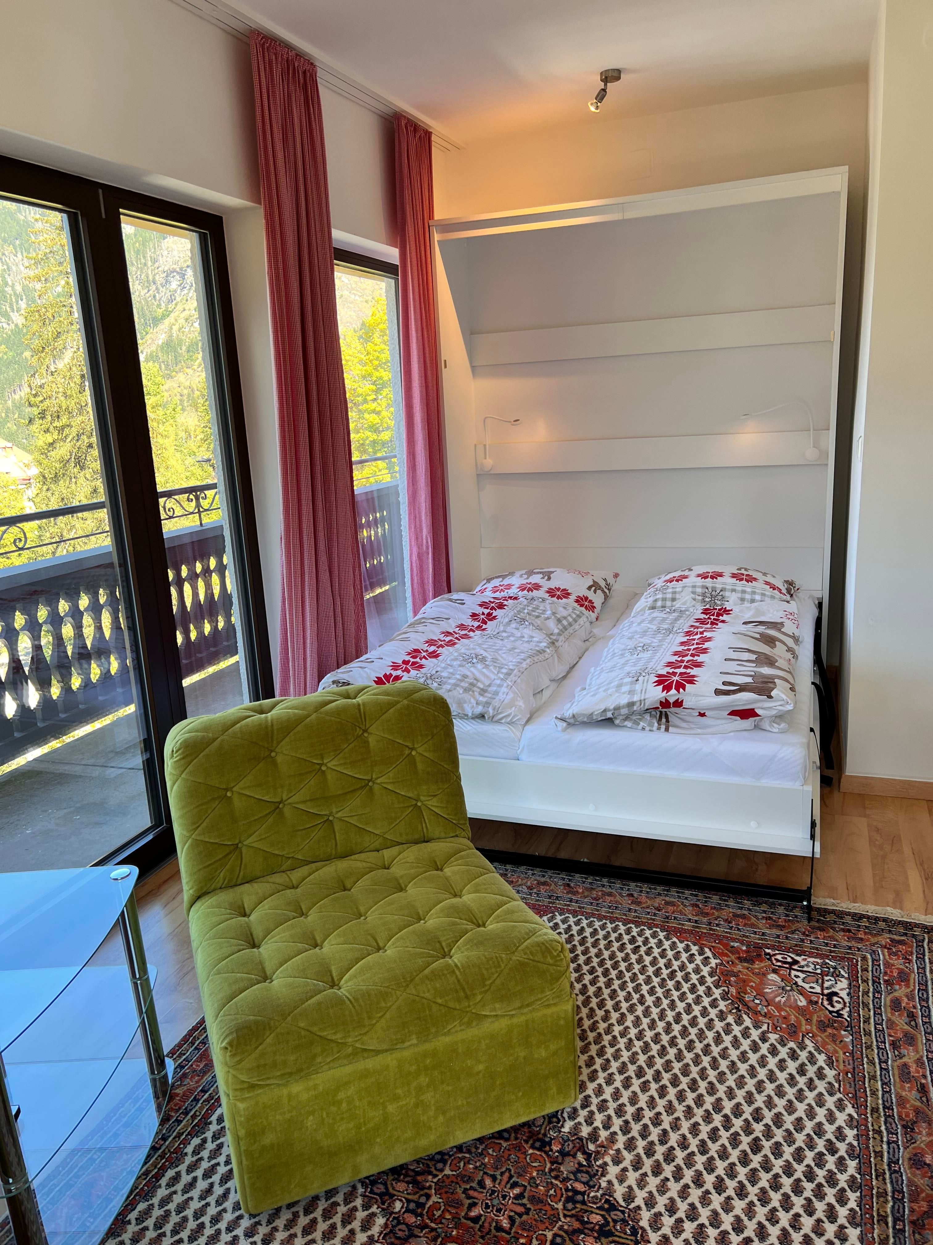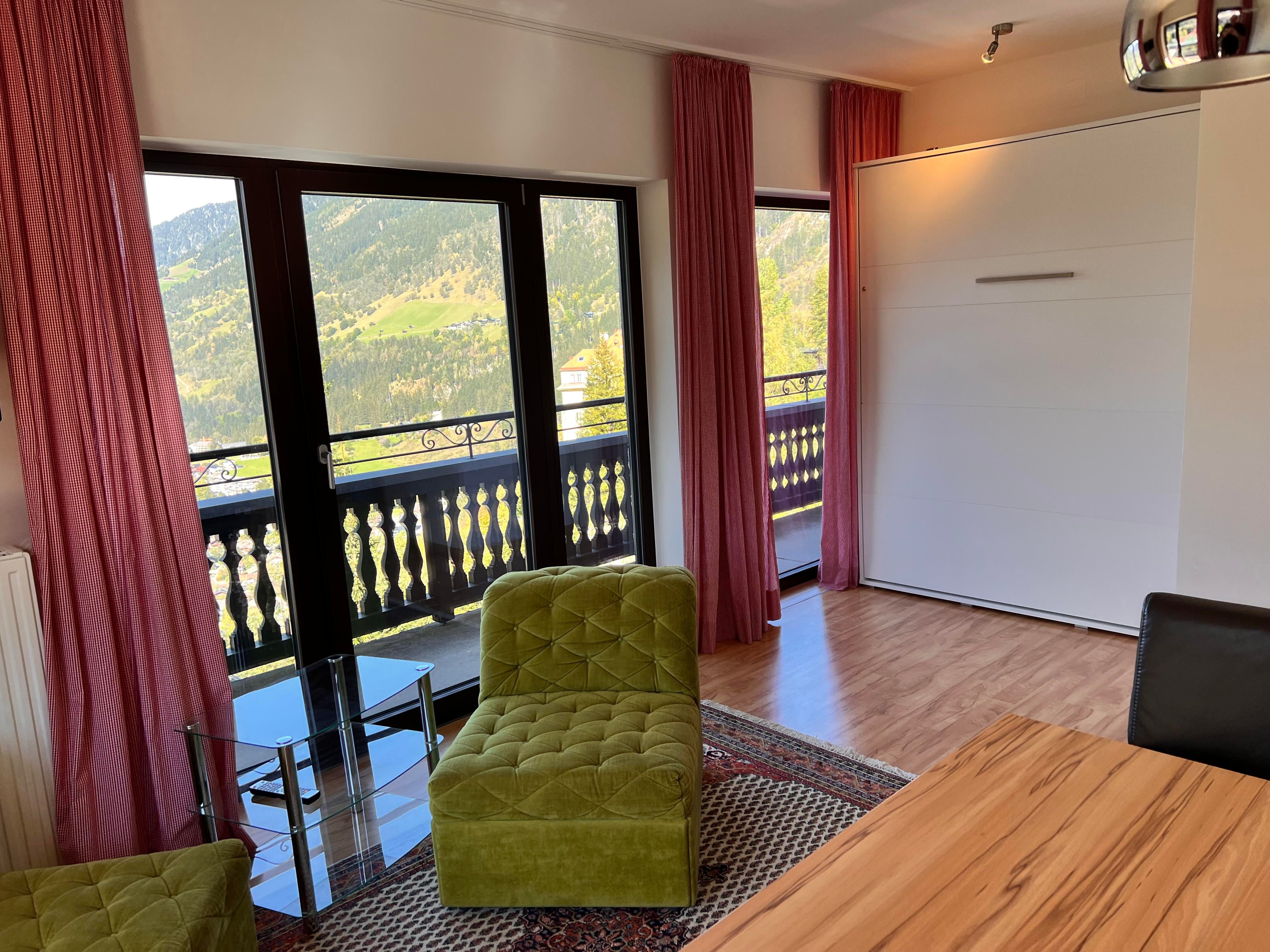 Um das Wohn- und Schlafzimmer verläuft der große überdachte Süd-West Balkon. Durch die ruhige Lage des Hauses kann man hier eine entspannte Zeit genießen und herrliche Bergluft schnubbern. Der Balkon ist mit Balkonmöbel ausgestattet. Das Appartement befindet sich im 1. OG.