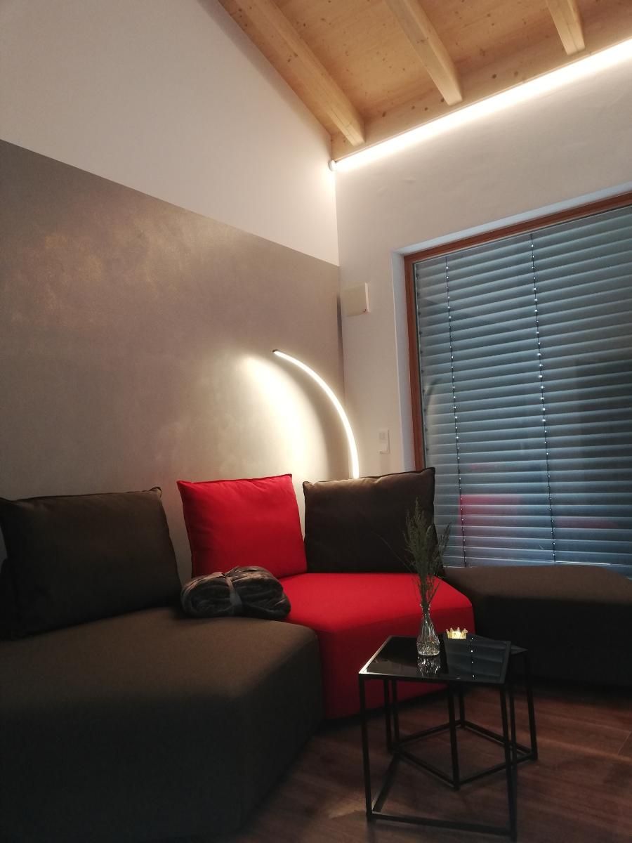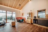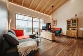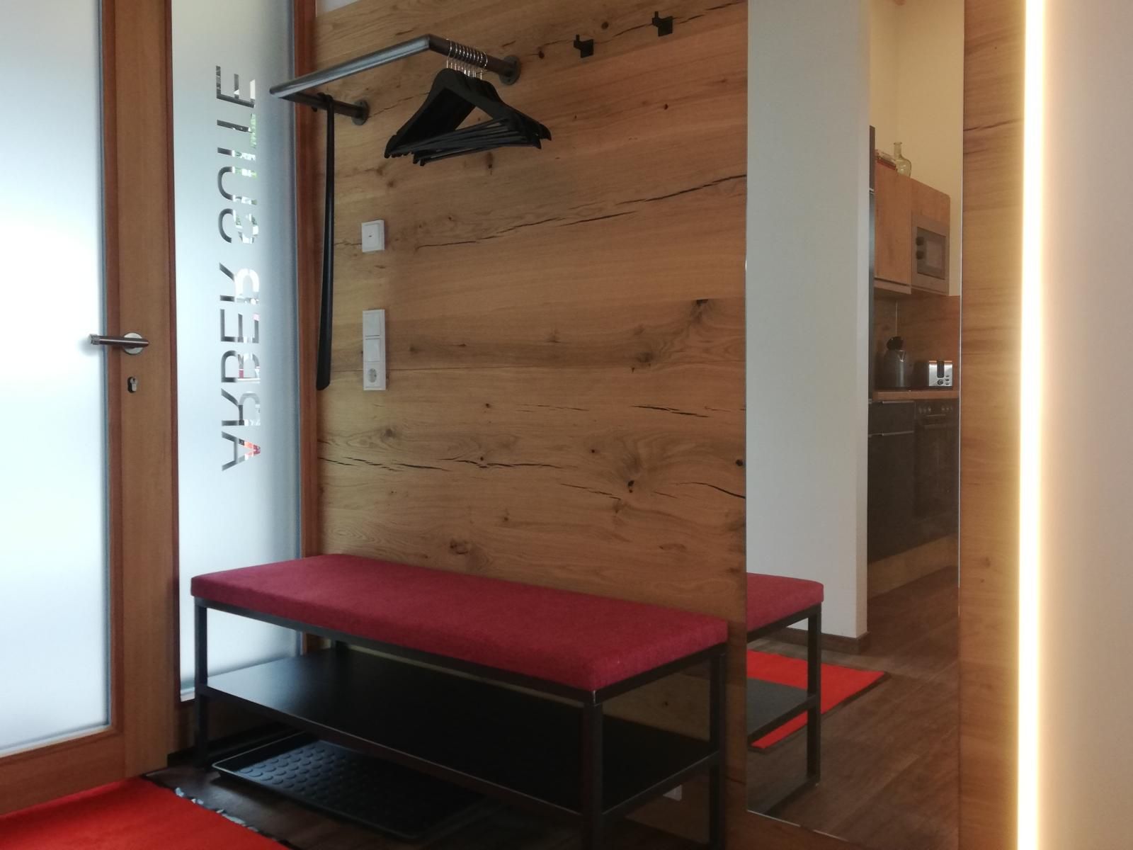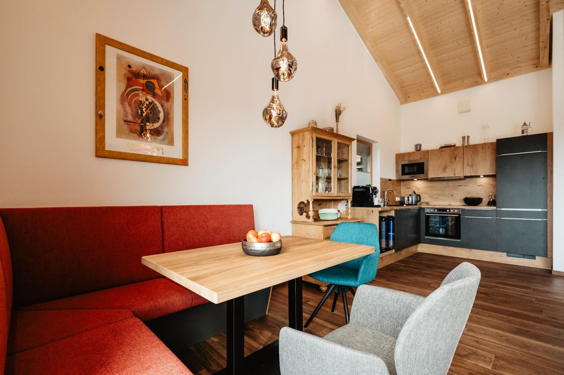Im Eingangsbereich befindet sich die Garderobe. Der großzügige Wohnbereich besteht aus einer gut ausgestatteten Küche mit Weinkühlschränken, Kaffeevollautomat, Mikrowelle usw., einem Essplatz, einer gemütlichen Couchecke und einem 55 Zoll Smart TV-Gerät. Durch die großflächige Fensterfront bietet sich ein großartiger Ausblick.