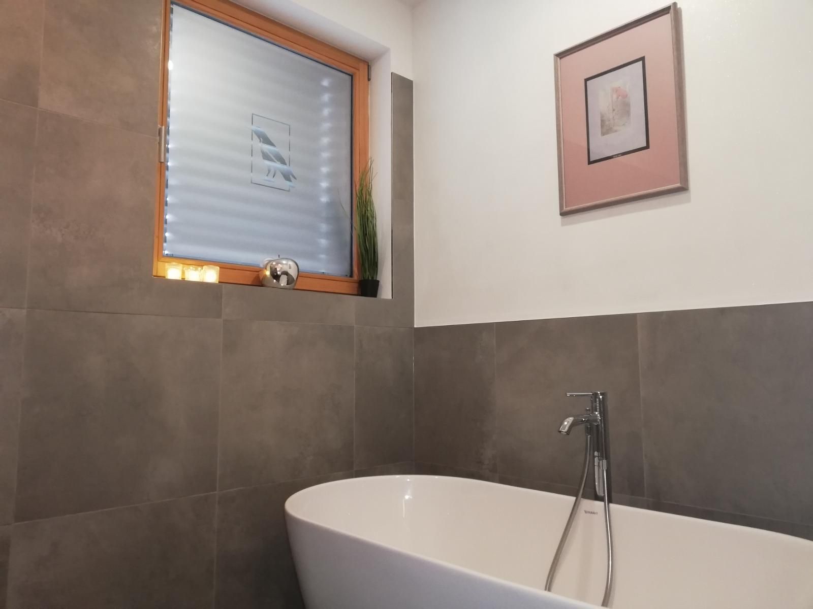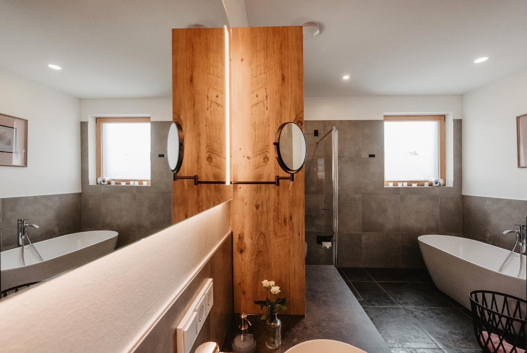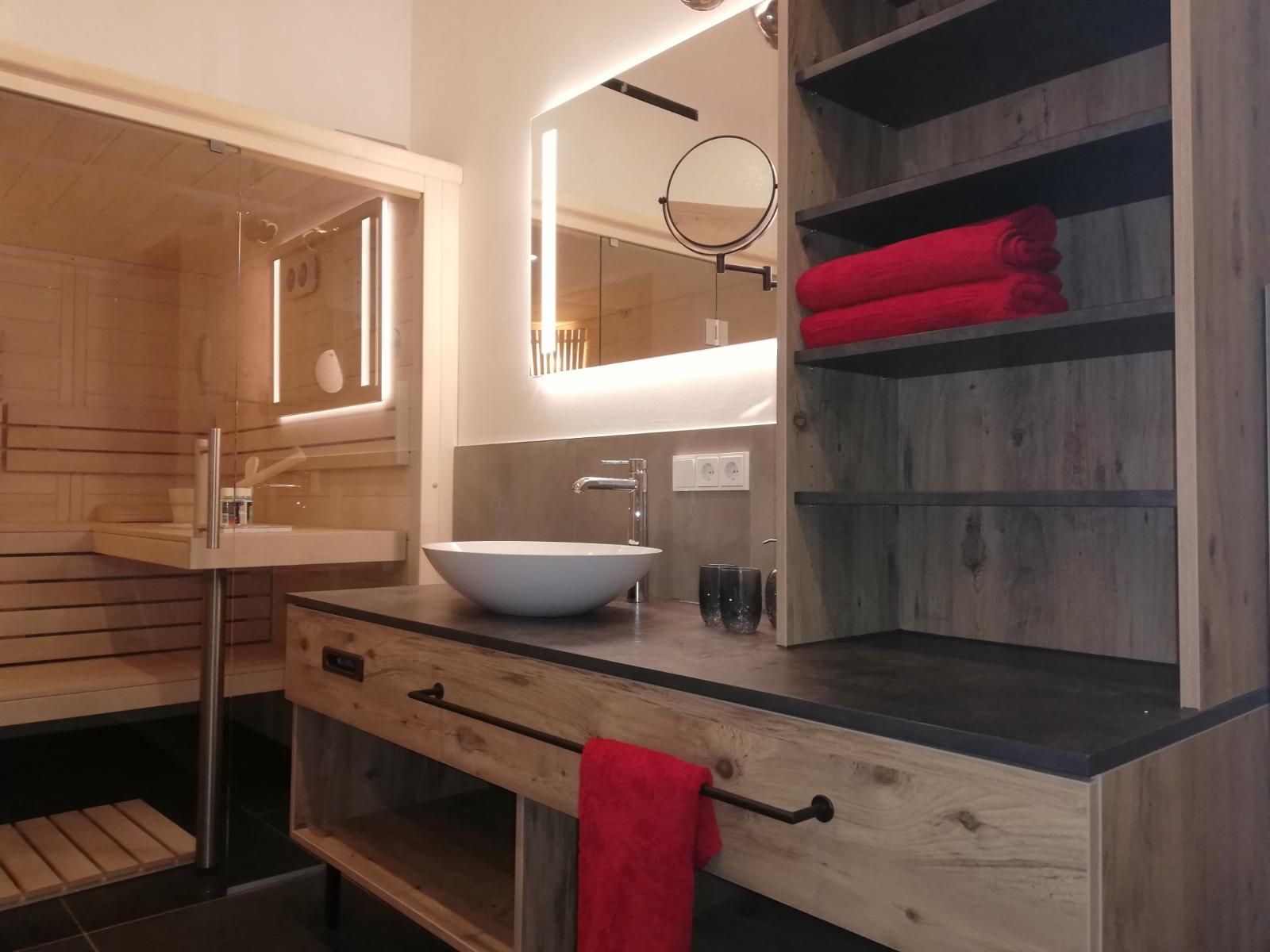 Das großzügige Master-Bad mit steuerbarer Wellness-Ambiente-Beleuchtung, freistehender Badewanne, Walk-in-Regendusche, Einbauradio mit Bluetooth-Funktion und finnischer Sauna mit Infrarot-Bereich ist Ihre private Wellness-Oase!
