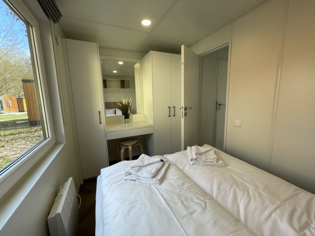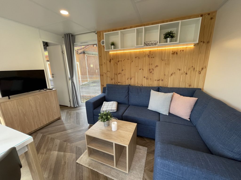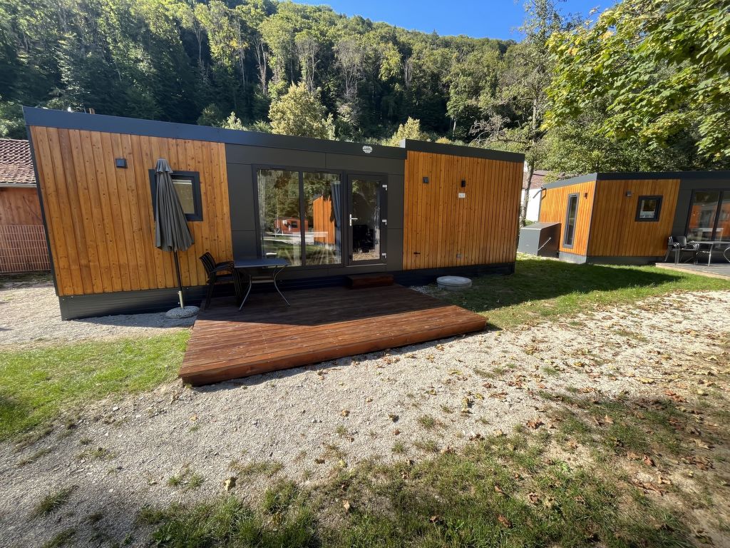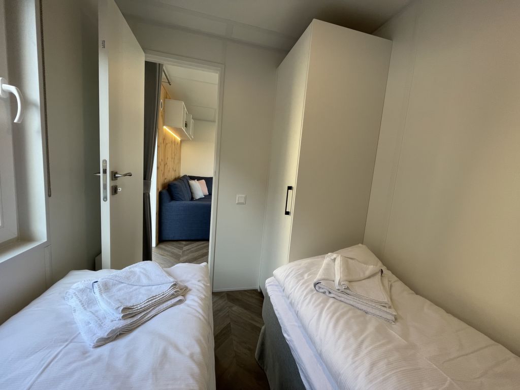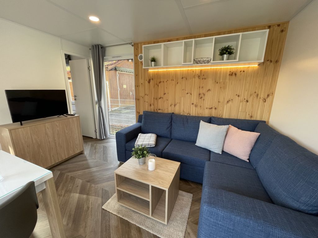 Tiny Haus Family-Home, 3-Zimmer-Mobilheim 32 m2. Gemütlich eingerichtet: Wohn-/Schlafzimmer mit 1 Diwanbett (120 cm, Länge 170 cm), Esstisch und Sat-TV (Flachbildschirm). Ausgang zur Terrasse. 1 Zimmer mit 1 franz. Bett (140 cm, Länge 200 cm). 1 Zimmer mit 2 Betten (80 cm, Länge 200 cm). Kochnische (4 Glaskeramikplatten, Wasserkocher, Tiefkühler, elektrische Kaffeemaschine). Dusche/WC. E-Heizung. Kleine Terrasse. Terrassenmöbel. Parkplatz (1 Auto) beim Haus. Bitte beachten: Nichtraucher-Haus. Maximal 1 Haustier/Hund erlaubt.