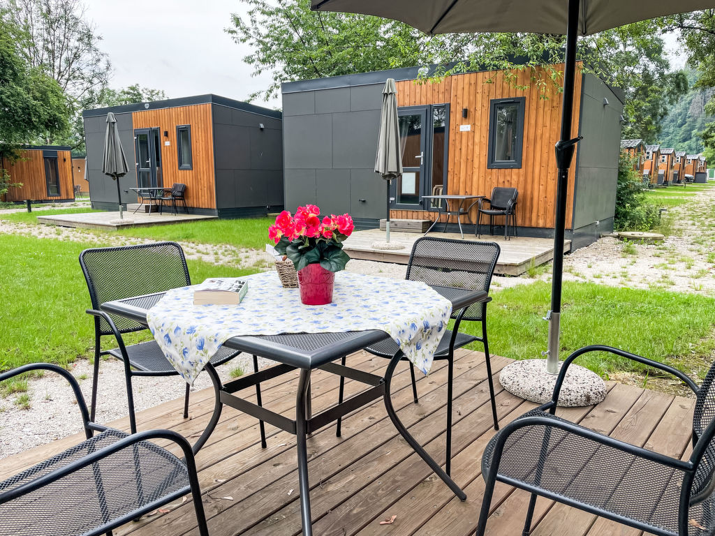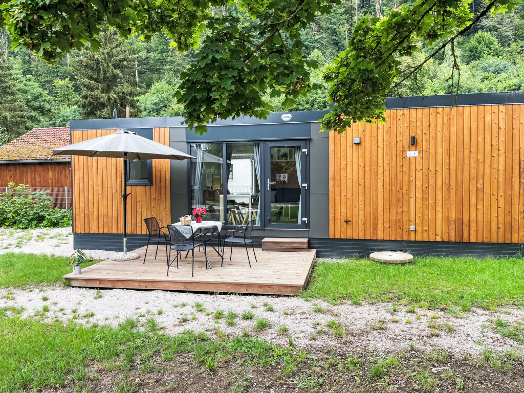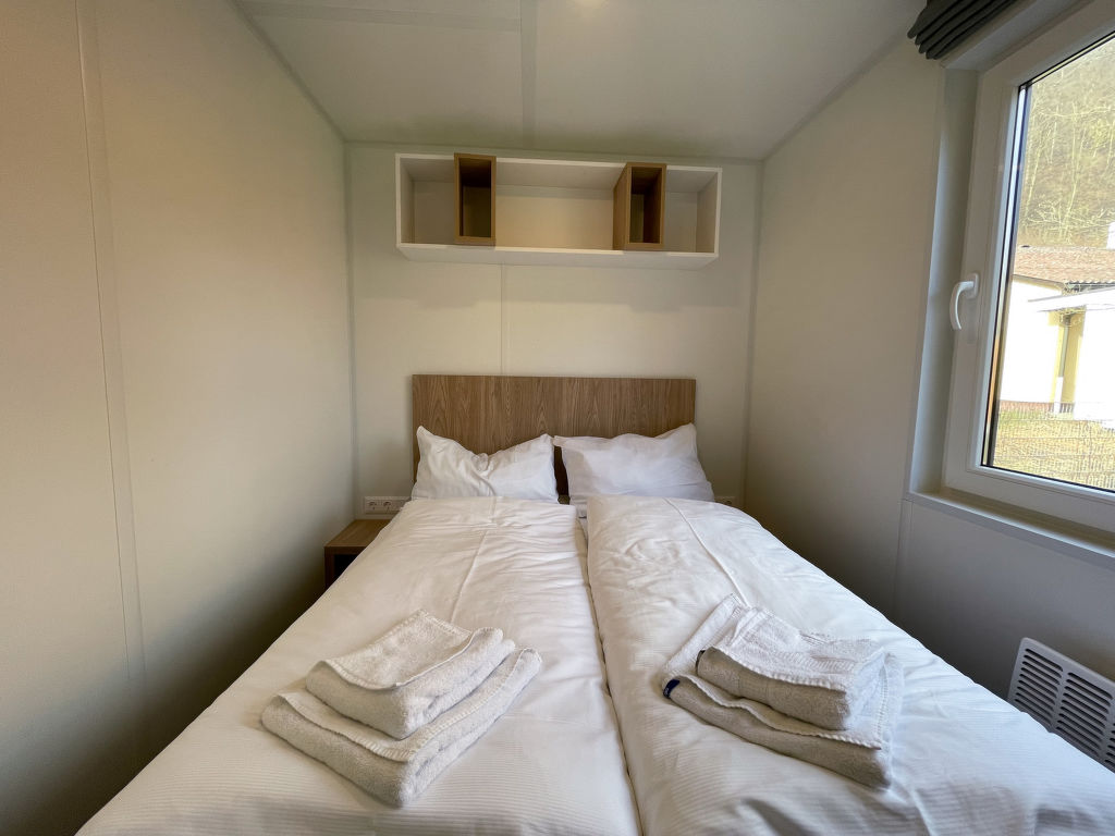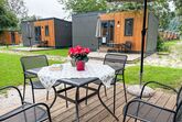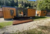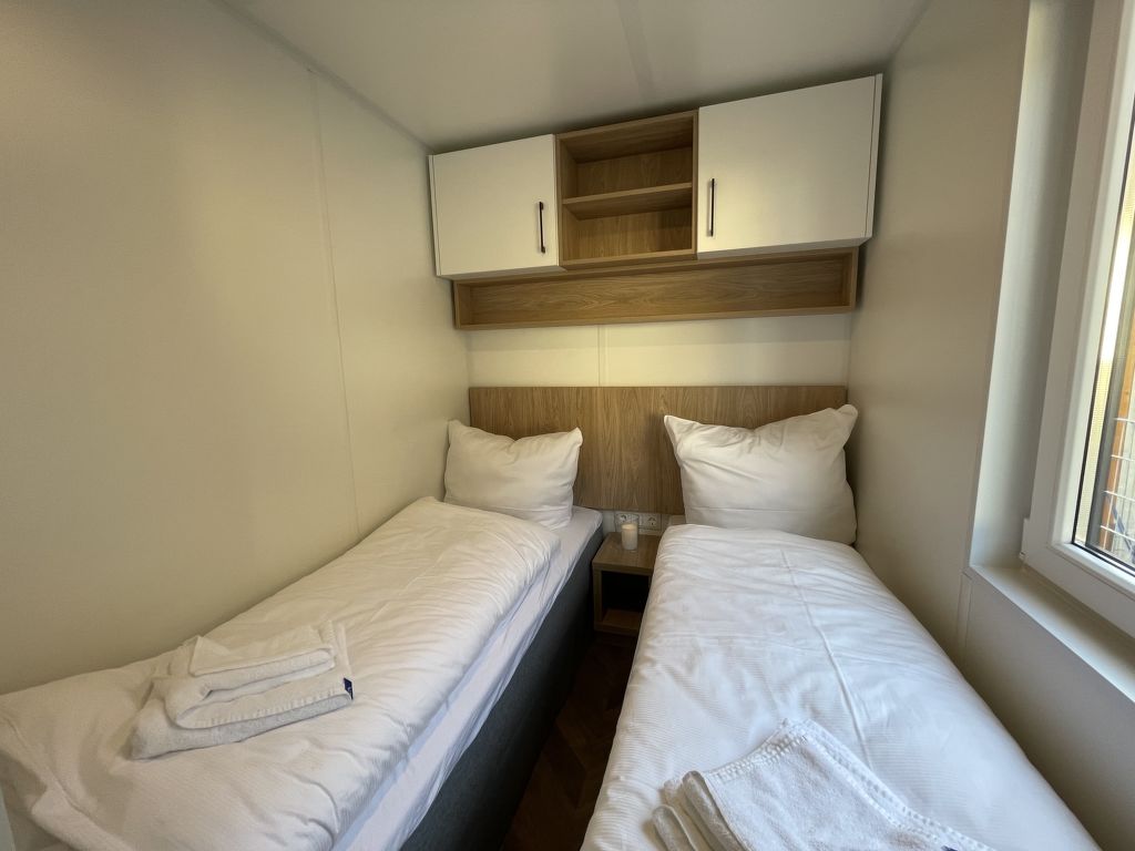 Tiny Haus Family-Home, 3-Zimmer-Mobilheim 32 m2. Gemütlich eingerichtet: Wohn-/Schlafzimmer mit 1 Diwanbett (120 cm, Länge 170 cm), Esstisch und Sat-TV (Flachbildschirm). Ausgang zur Terrasse. 1 Zimmer mit 1 franz. Bett (140 cm, Länge 200 cm). 1 Zimmer mit 2 Betten (80 cm, Länge 200 cm). Kochnische (4 Glaskeramikplatten, Wasserkocher, Tiefkühler, elektrische Kaffeemaschine). Dusche/WC. E-Heizung. Kleine Terrasse. Terrassenmöbel. Parkplatz (1 Auto) beim Haus. Bitte beachten: Nichtraucher-Haus. Maximal 1 Haustier/Hund erlaubt.