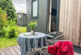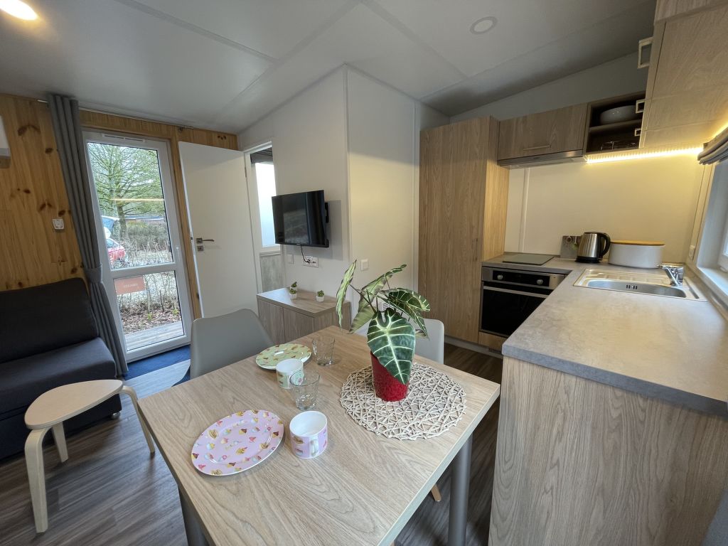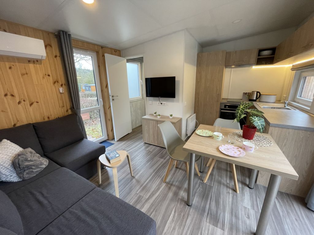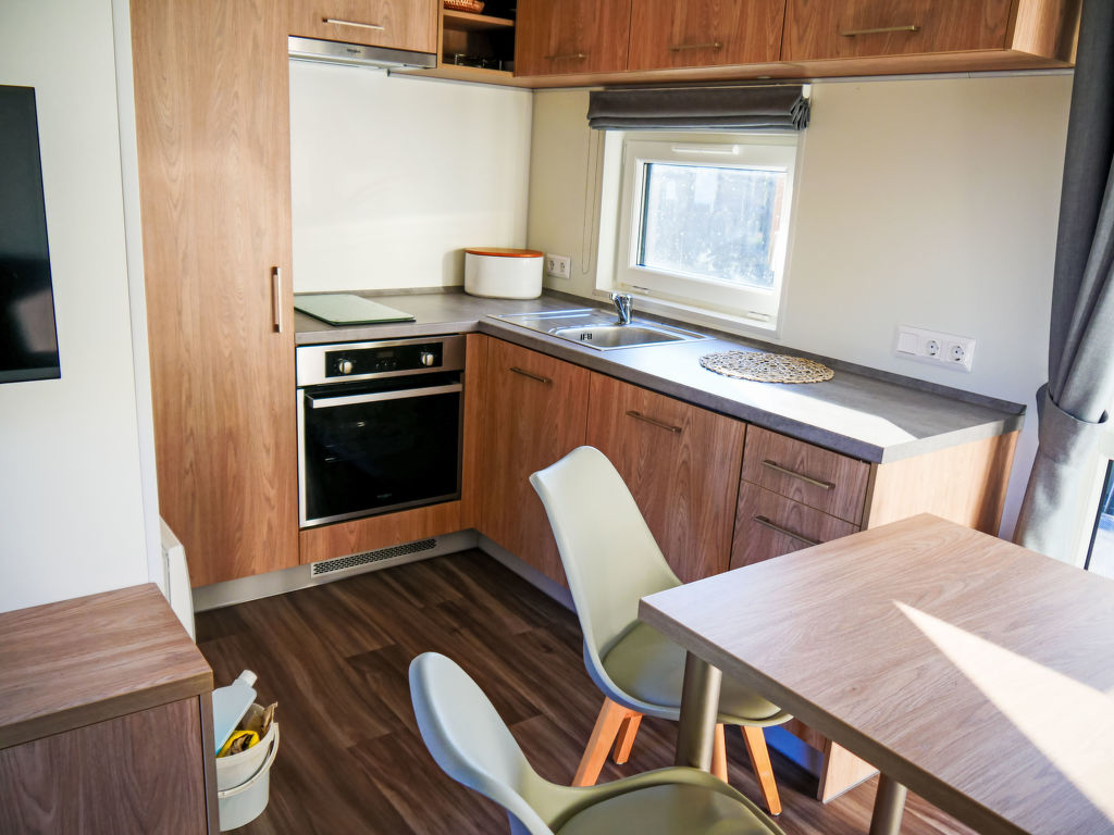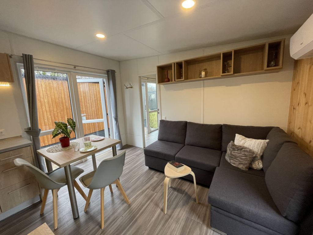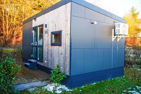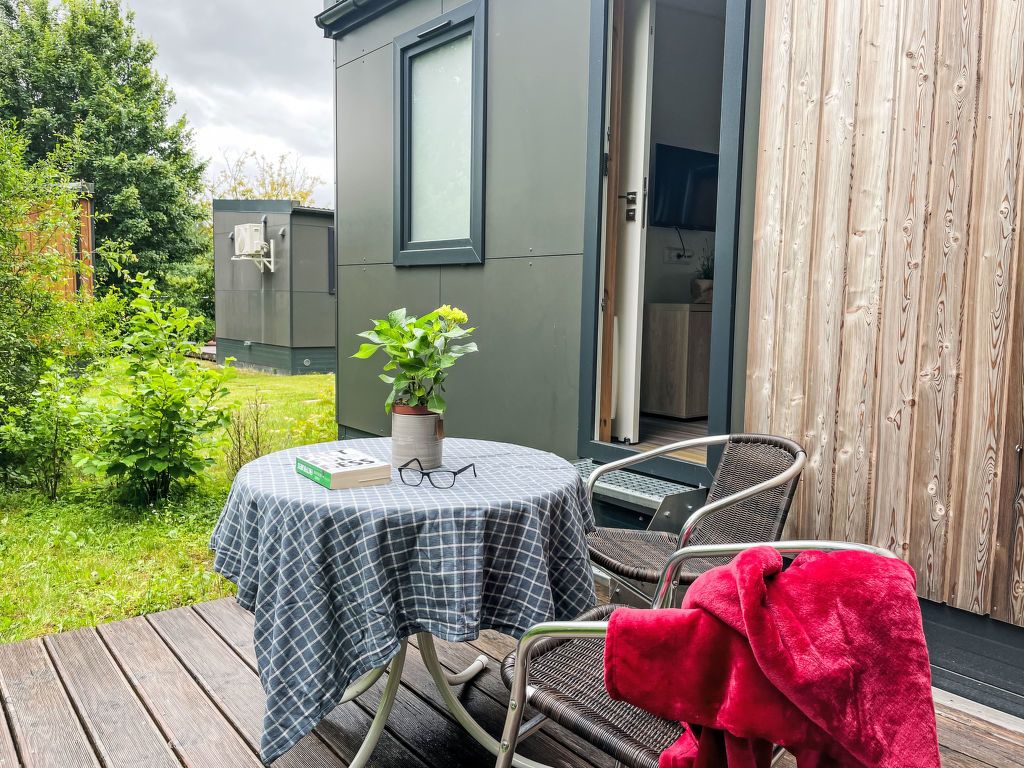 Tiny Haus Auszeit, 2-Zimmer-Mobilheim 25 m2. Objekt geeignet für 2 Erwachsene + 2 Kinder. Gemütlich eingerichtet: Wohn-/Schlafzimmer mit 1 Doppeldiwanbett und Sat-TV. Ausgang zur Terrasse. 1 Zimmer mit 1 franz. Bett (140 cm, Länge 200 cm). Offene Küche (Backofen, 2 Induktionskochplatten, Toaster, Wasserkocher, elektrische Kaffeemaschine). Dusche/WC. E-Heizung, Klimaanlage. 2 Terrassen, Westlage und Ostlage. Terrassenmöbel. Parkplatz beim Haus. ACHTUNG: Die WLAN-Verbindung kann je nach Kapazität eingeschränkt sein. Im Kühlschrank ist ein Eisfach vorhanden.