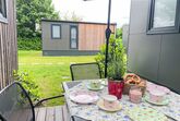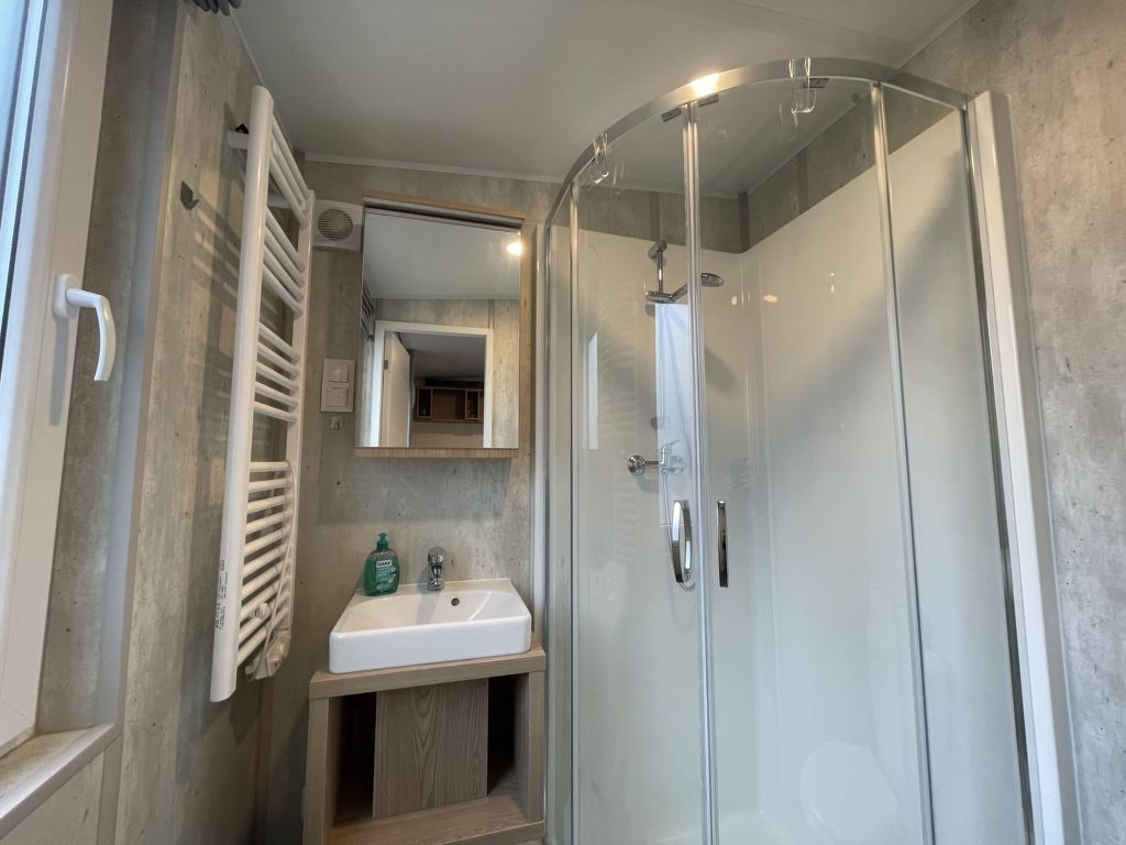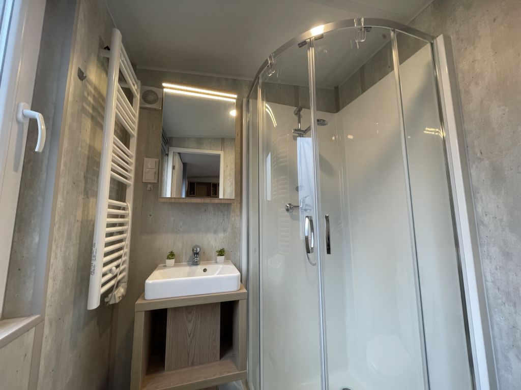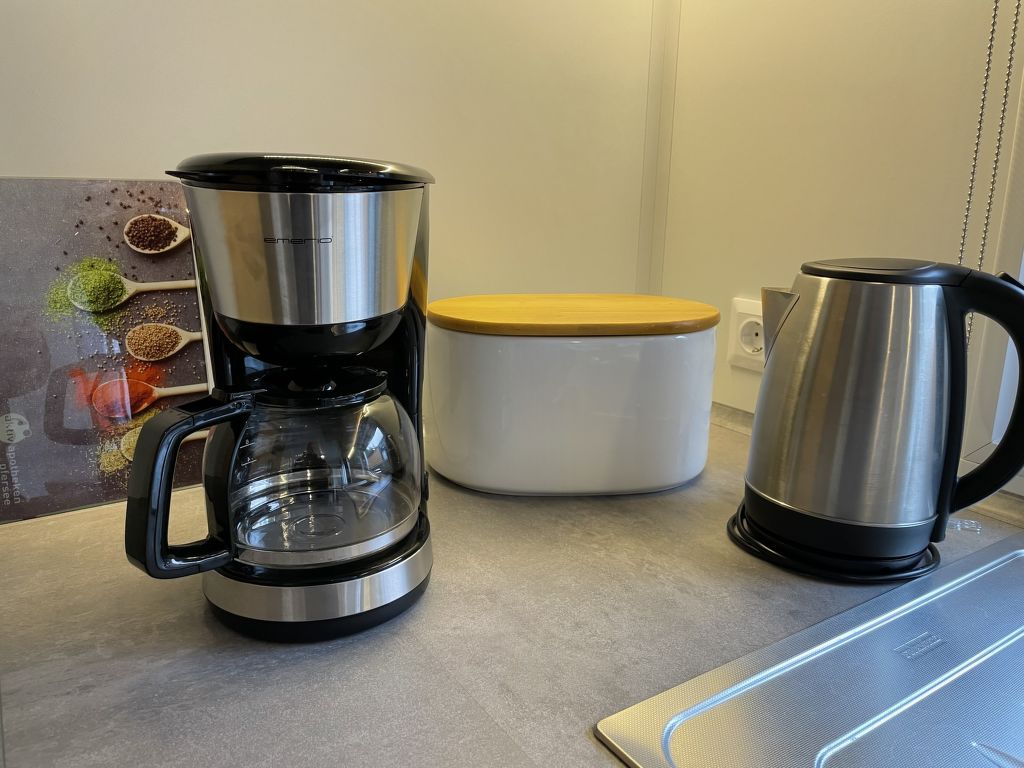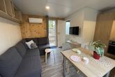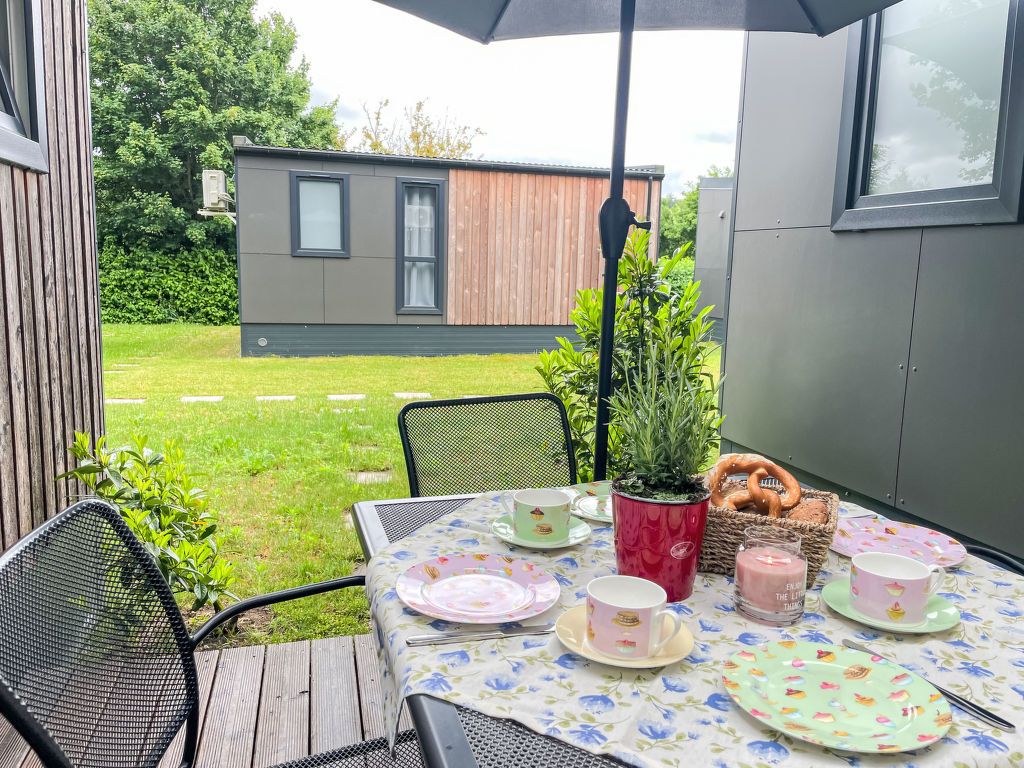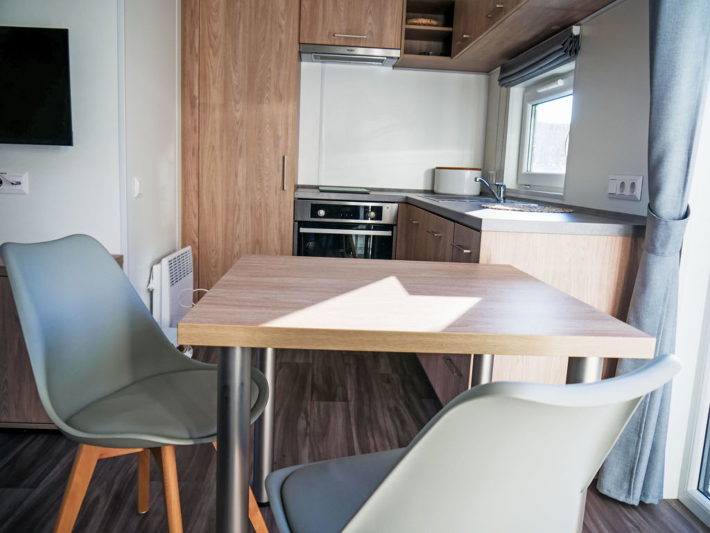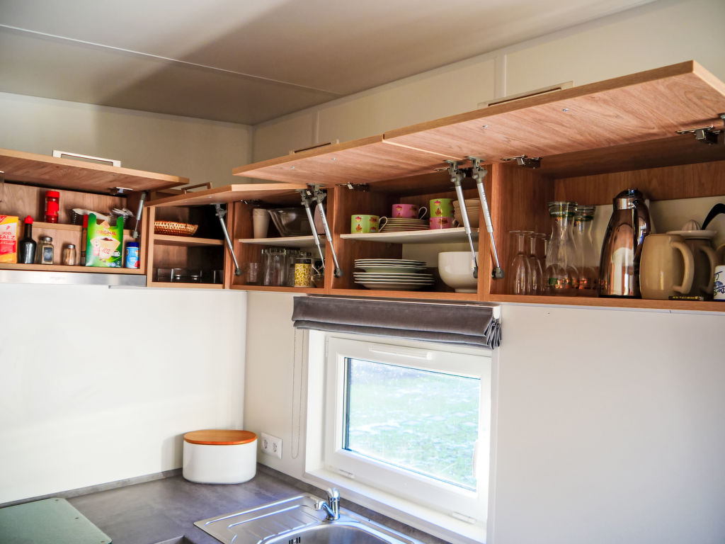 Tiny Haus Auszeit, 2-Zimmer-Mobilheim 25 m2. Objekt geeignet für 2 Erwachsene + 2 Kinder. Gemütlich eingerichtet: Wohn-/Schlafzimmer mit 1 Doppeldiwanbett und Sat-TV. Ausgang zur Terrasse. 1 Zimmer mit 1 franz. Bett (140 cm, Länge 200 cm). Offene Küche (Backofen, 2 Induktionskochplatten, Toaster, Wasserkocher, elektrische Kaffeemaschine). Dusche/WC. E-Heizung, Klimaanlage. 2 Terrassen, Westlage und Ostlage. Terrassenmöbel. Parkplatz beim Haus. ACHTUNG: Die WLAN-Verbindung kann je nach Kapazität eingeschränkt sein. Im Kühlschrank ist ein Eisfach vorhanden.