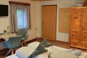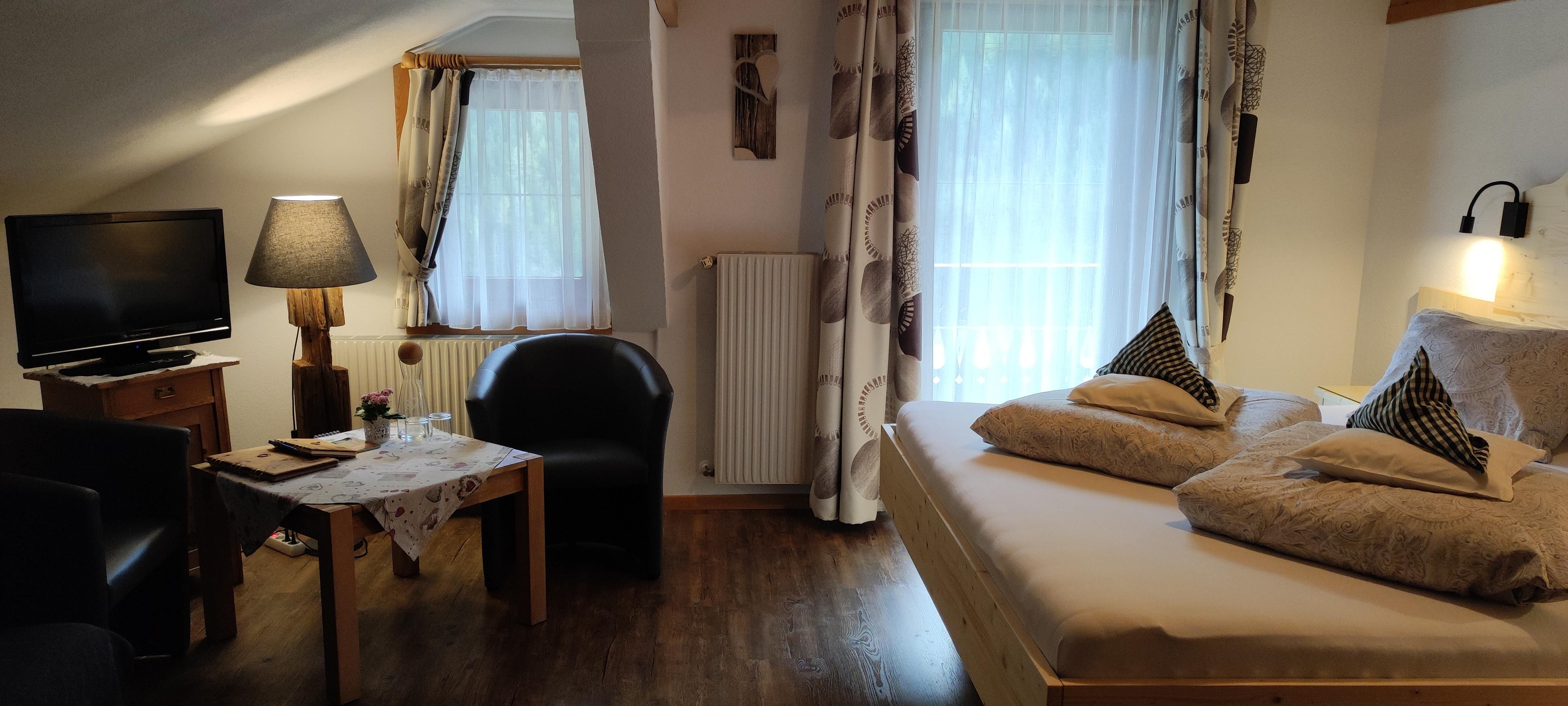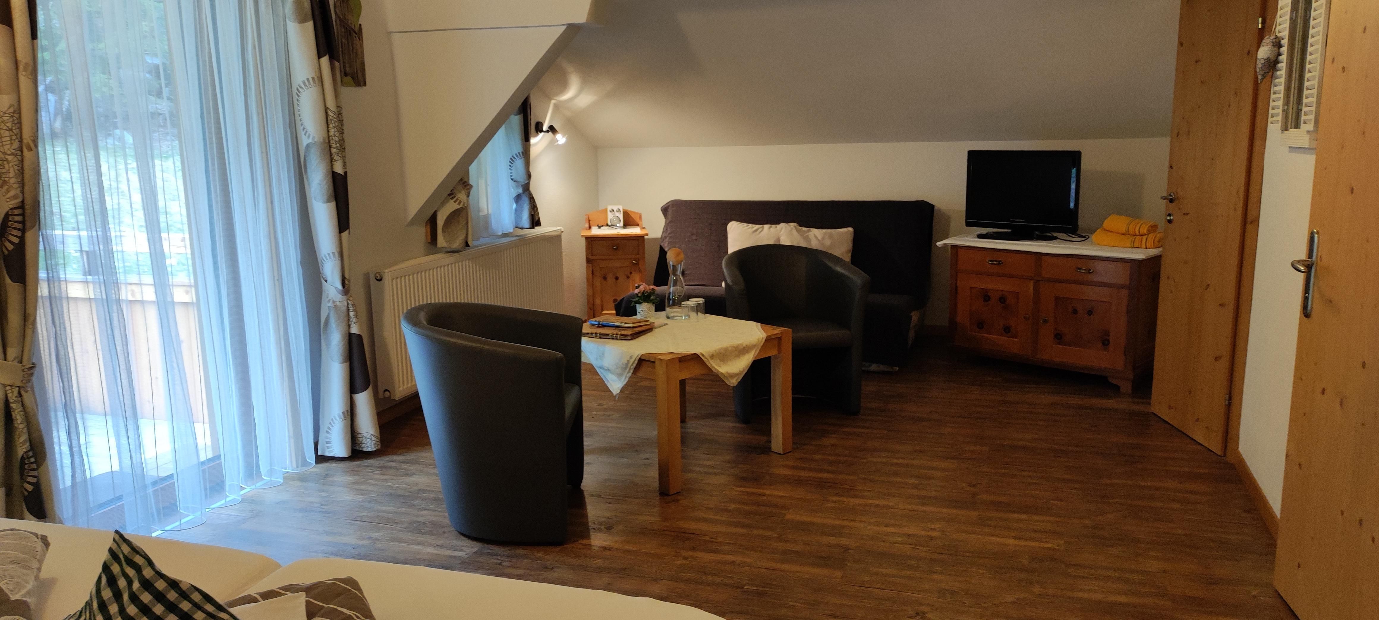 Großes,helles Zimmer (nach Süd-Westen gerichtet).Schöne Aussicht mit Gartenblick und auf die Schwarzach unseren Fluss,mit Rundum Balkon.Das Zimmer ist mit neuen und alten Inventar hamonisch eingerichtet.Glaskrug mit unserem Qellwasser frisch gefüllt.