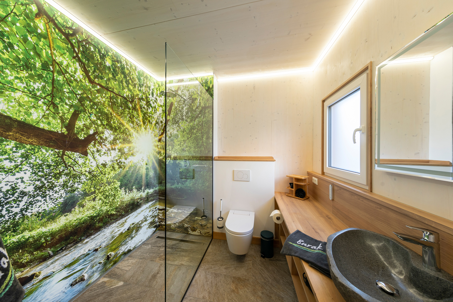 Unser Bad ist ein Rückzugsort mit Naturflair: Das ebenerdige Duscherlebnis, das exklusive Flussstein-Waschbecken und das integrierte Bidet mit Fernbedienung sorgen für ein einzigartiges Gefühl von Luxus. Der Smart-Spiegel dient gleichzeitig als Bluetooth-Lautsprecher. Selbstverständlich liegen hochwertige Chenille-Handtücher von der regionalen Textilfirma feiler bereit, und ein Föhn rundet das Wohlfühlerlebnis ab.