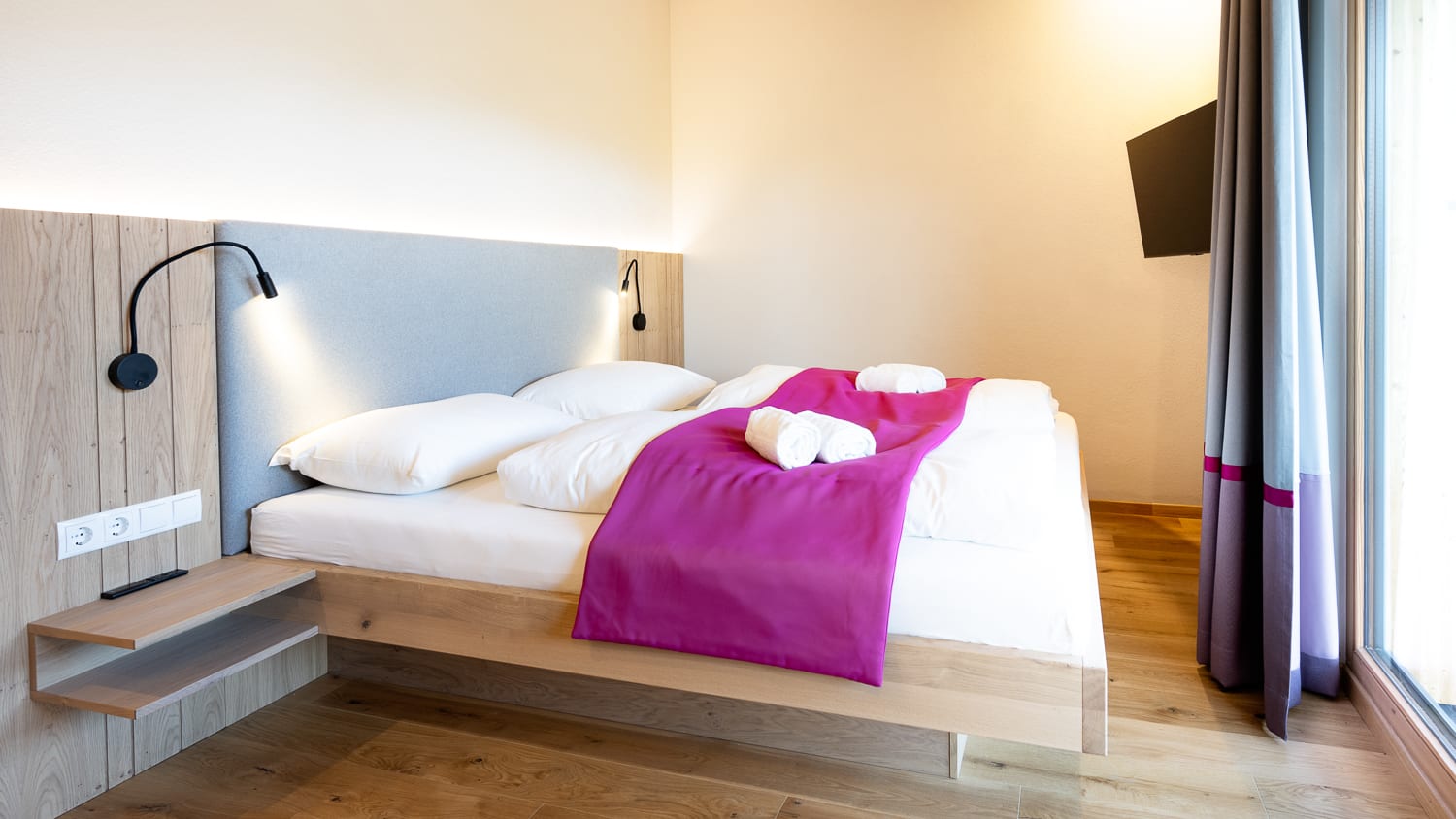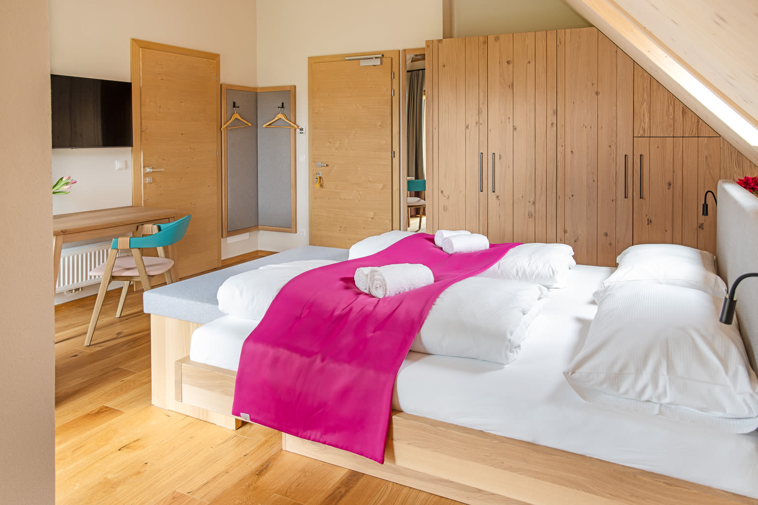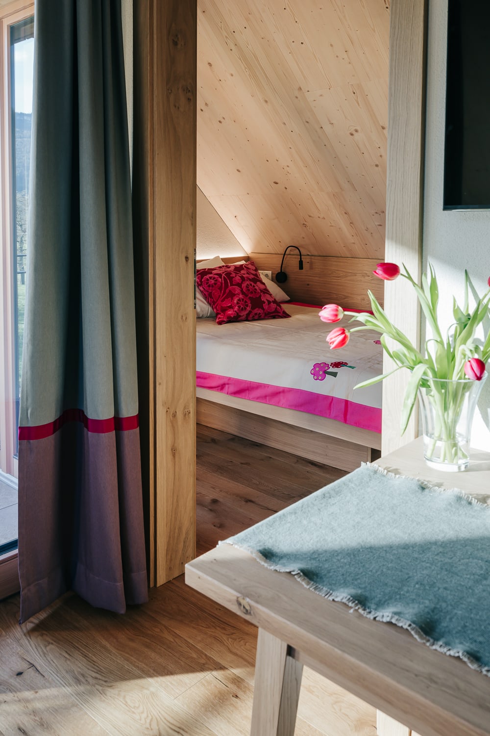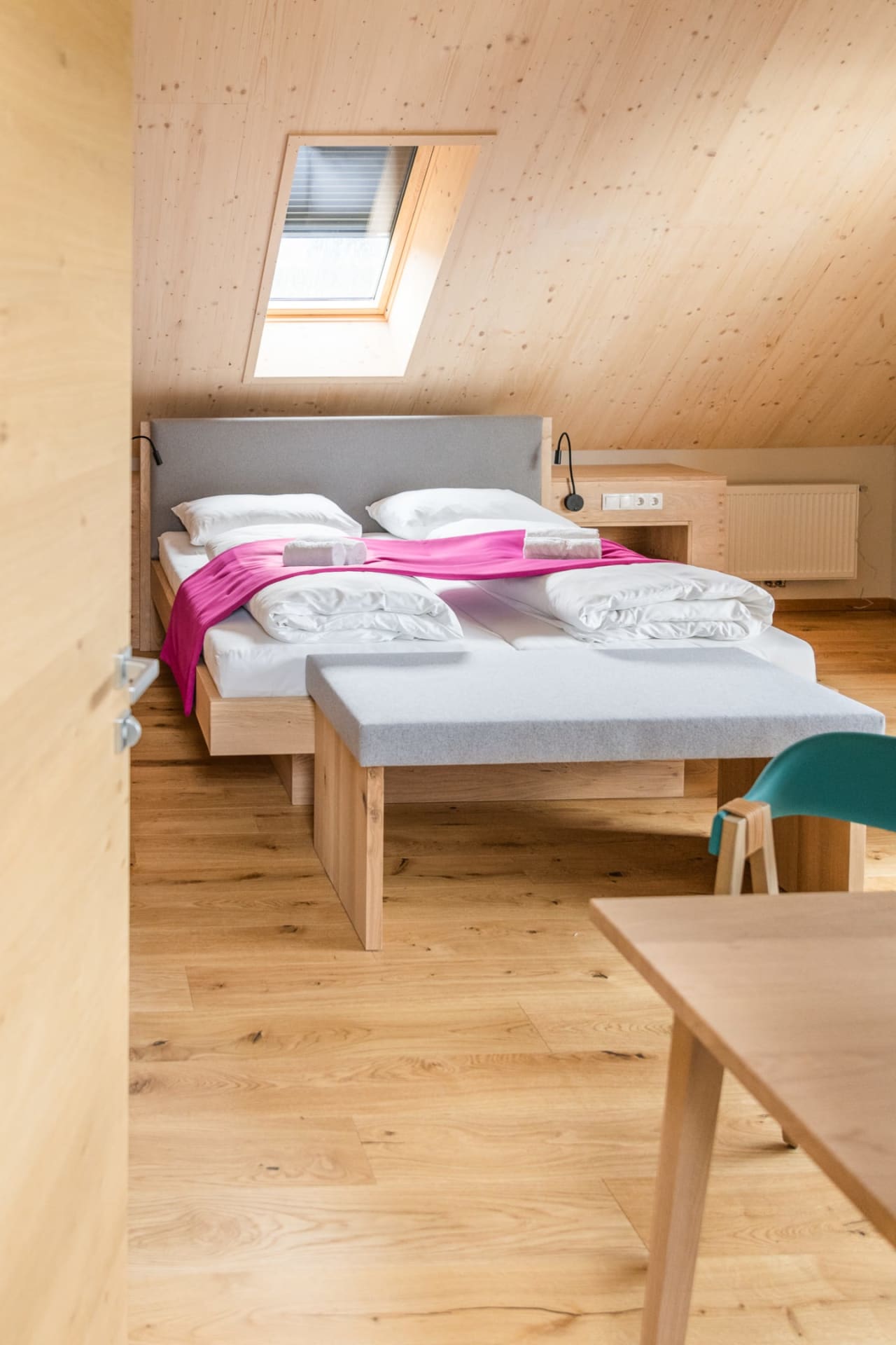Alle Zimmer sind mit ausgewählten Naturmaterialien ausgestattet. So auch das komfortable Zimmer Wiesenglück.