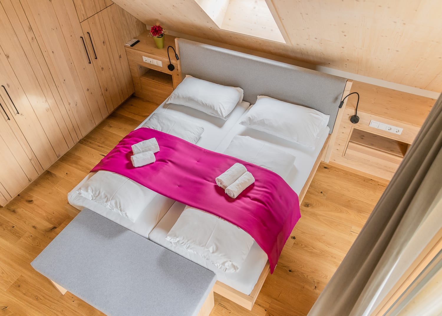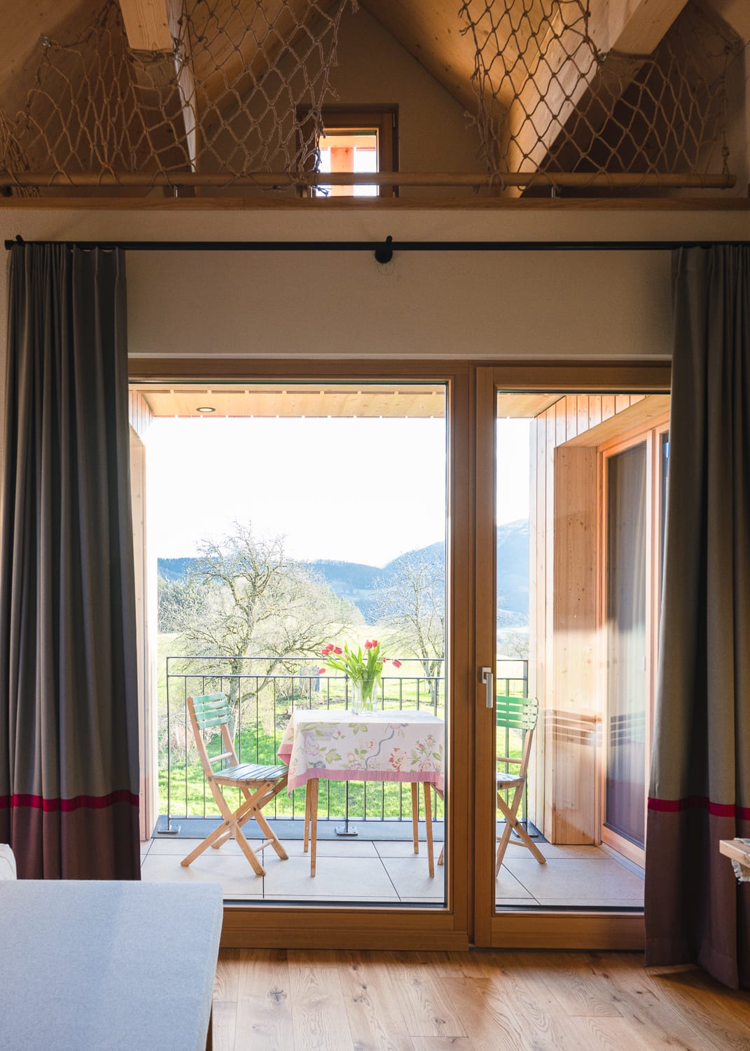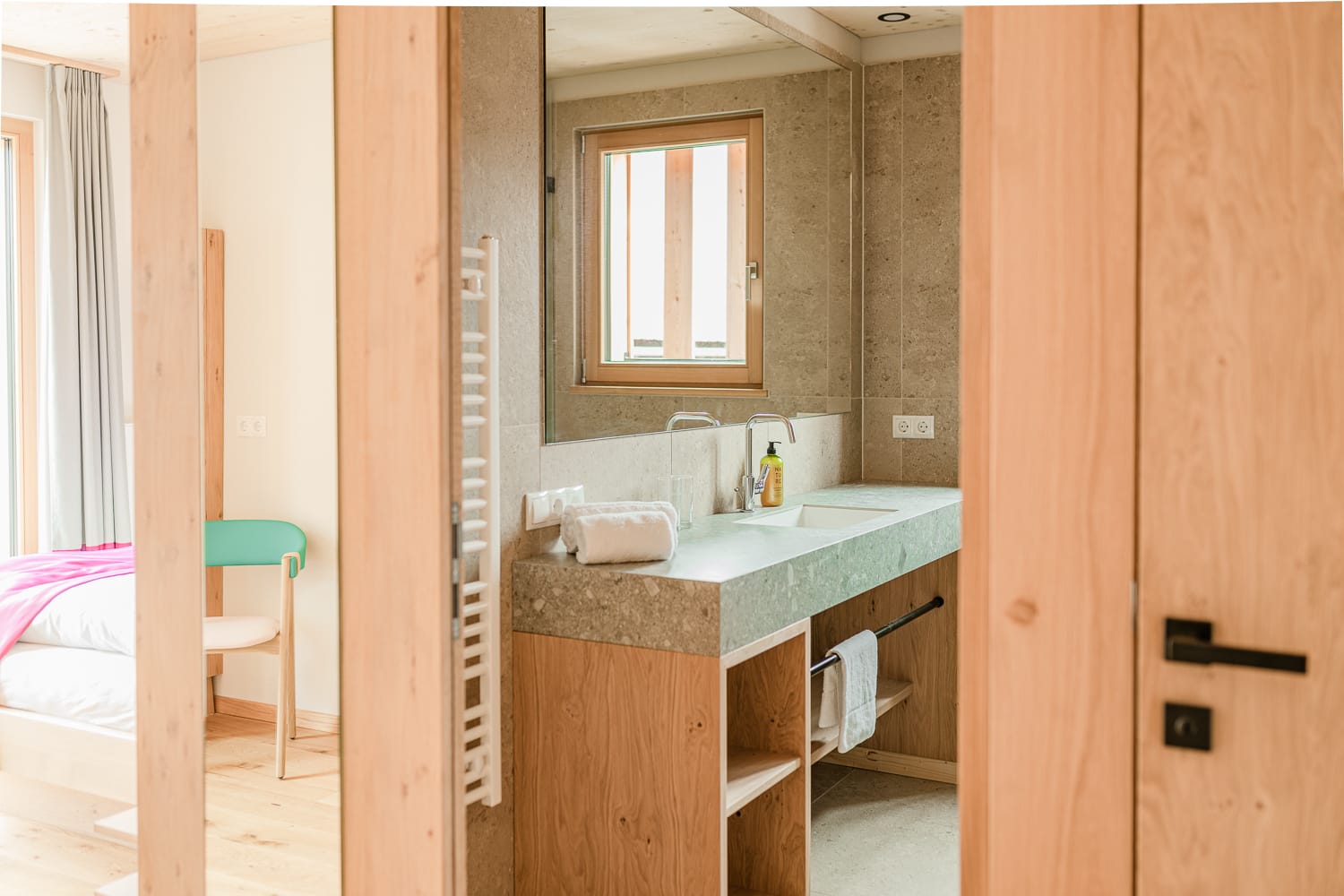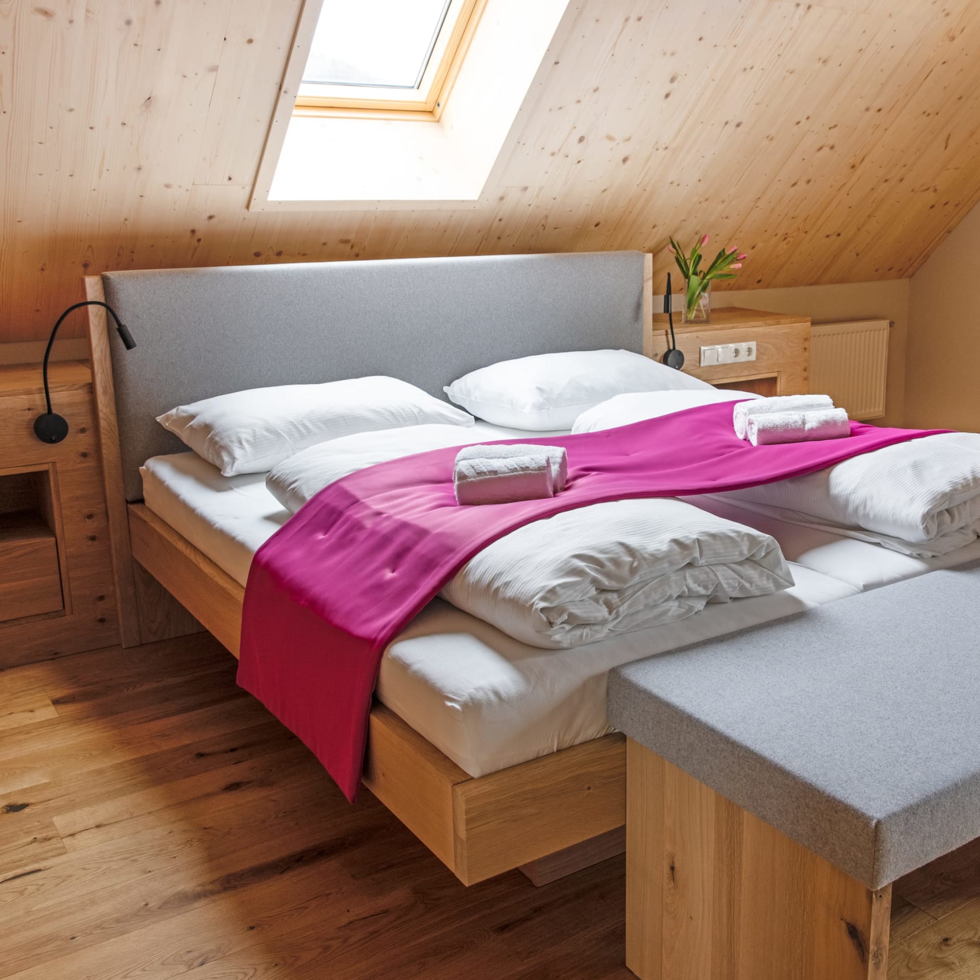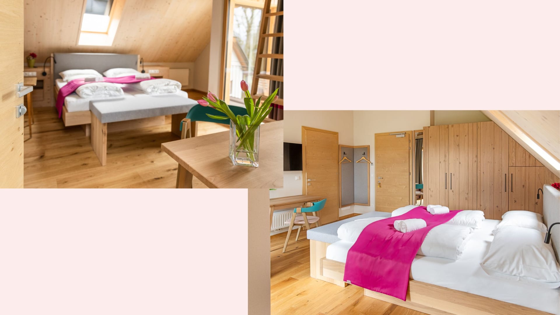 Alle Zimmer sind mit ausgewählten Naturmaterialien ausgestattet. So auch das komfortable Zimmer Wiesenglück.