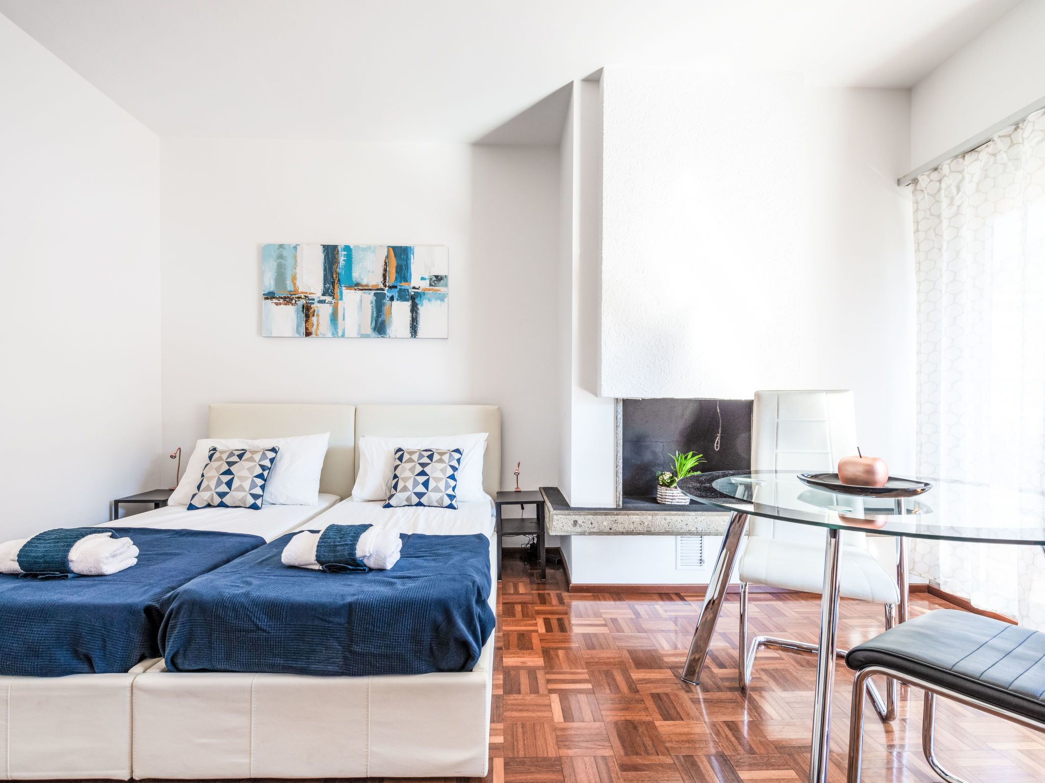 Shina App. 8, 1-Zimmer-Studio 35 m2 im 3. Stock. Hell, teilweise renoviert im Jahre 2019, komfortabel und gemütlich eingerichtet: offenes Wohn-/Schlafzimmer mit 2 Betten (90 cm, Länge 200 cm), Esstisch und Kabel-TV (Flachbildschirm), Radio. Ausgang zum Balkon. Kleine, offene Küche (4 Kochplatten, Mikrowelle, elektrische Kaffeemaschine, Kapseln für die Kaffeemaschine (Dolce Gusto) extra). Bad/Bidet/WC. Heizung. Balkon 7 m2. Balkonmöbel. Sicht auf die Landschaft und die Ortschaft. Zur Verfügung: Kinderhochstuhl, Babybett bis 2 Jahre (extra), Haartrockner. Internet (Wireless LAN, gratis). Bitte beachten: Nichtraucher-Unterkunft. NL-