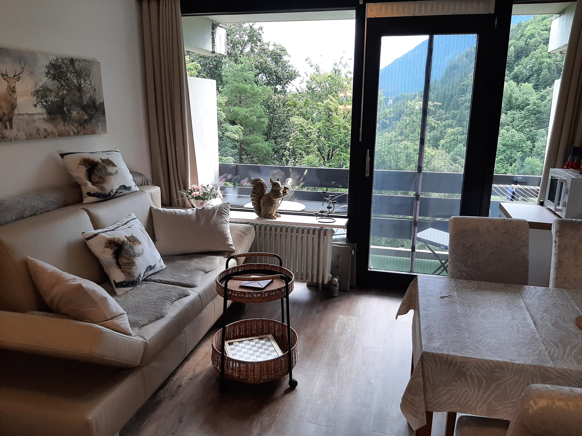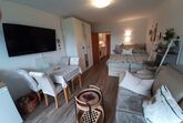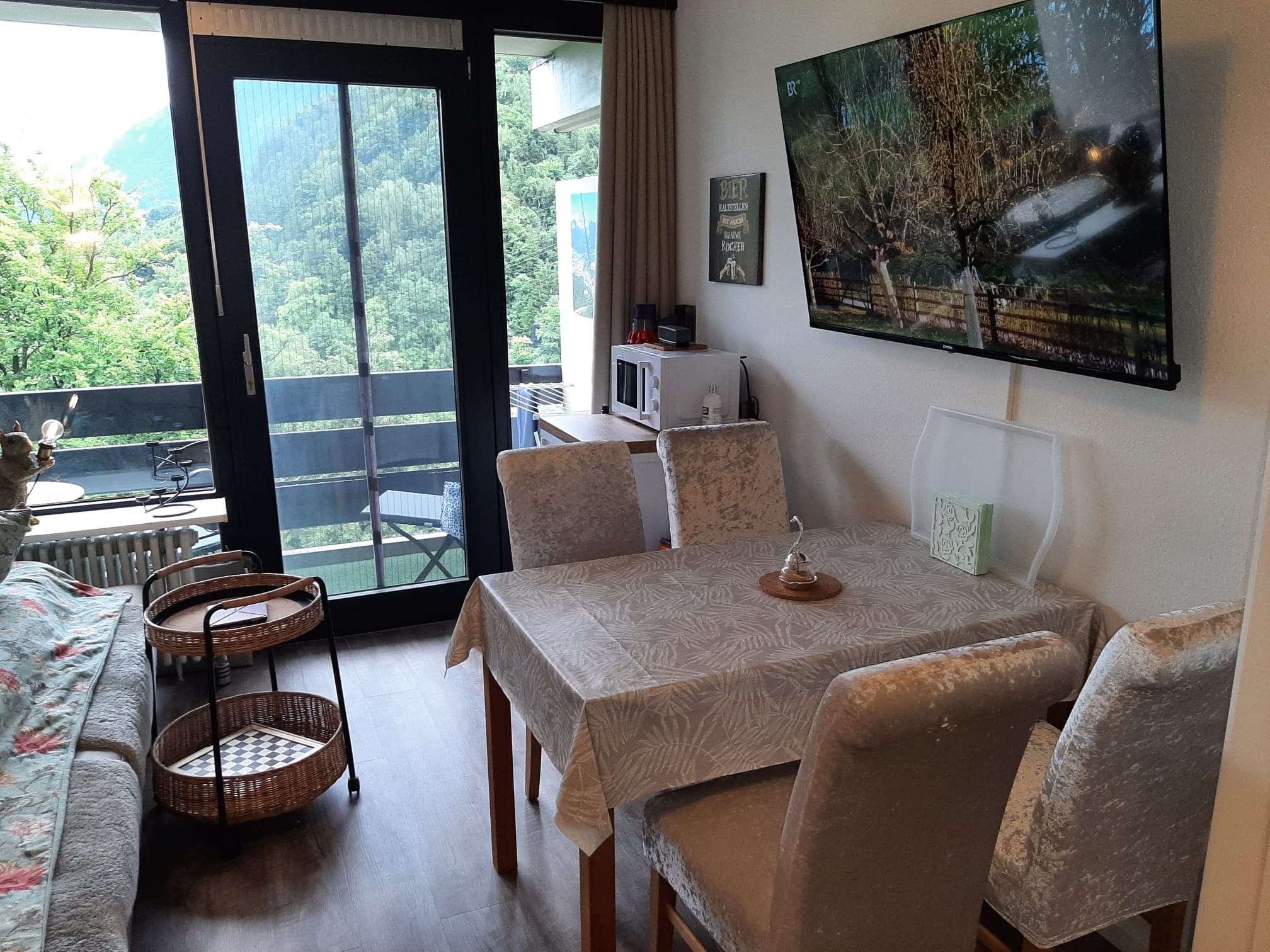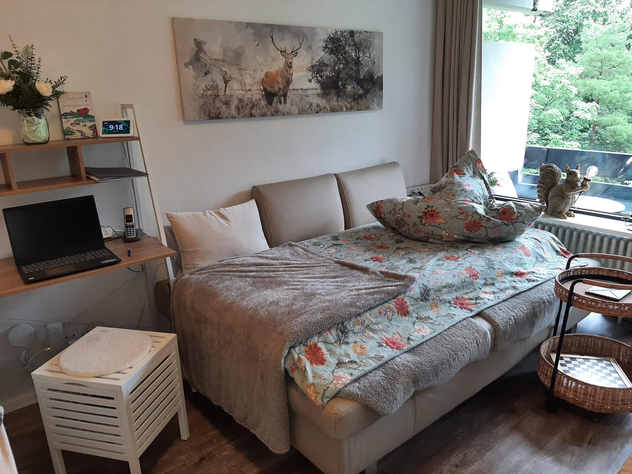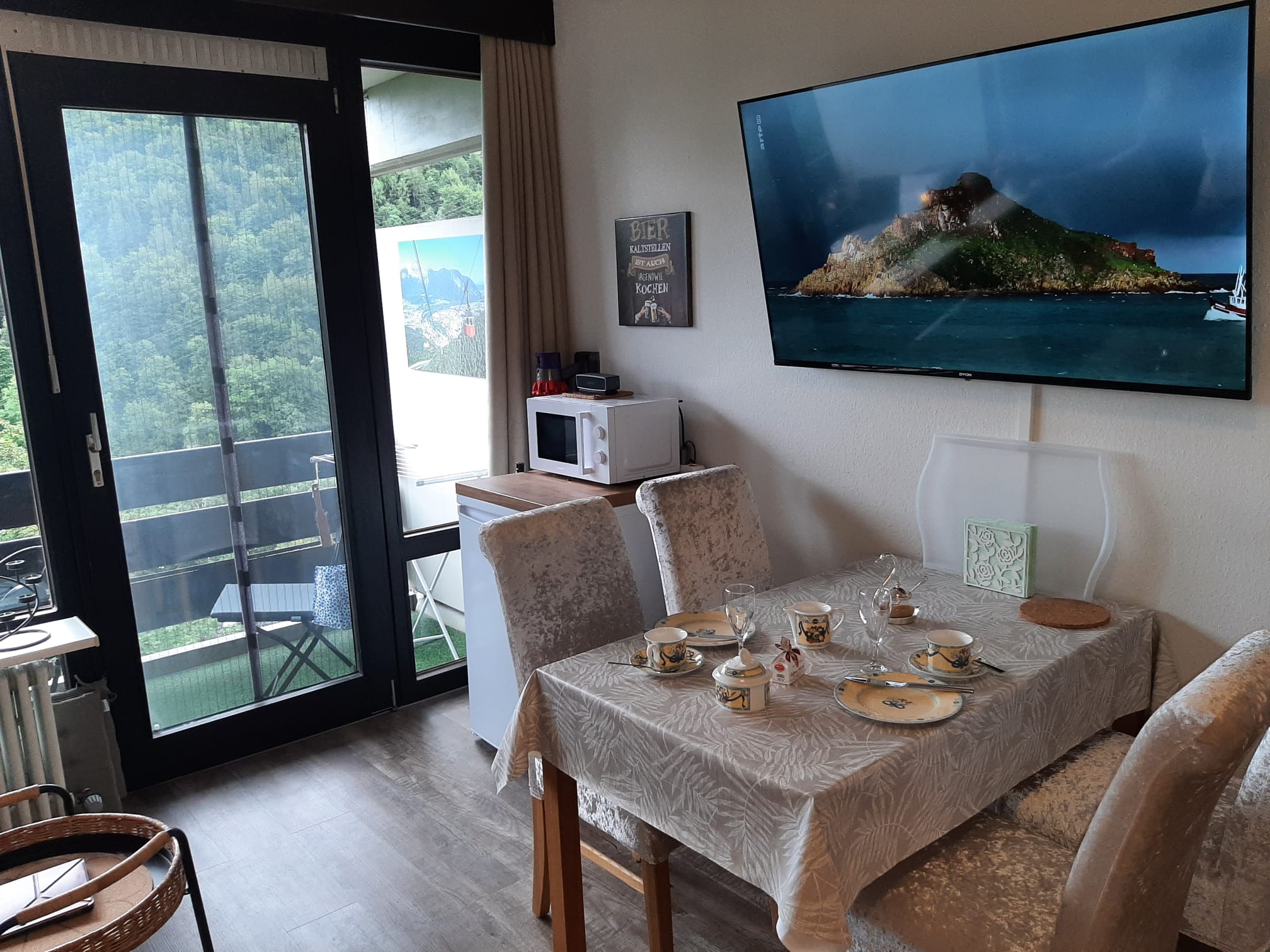 Geradeaus erreicht man das Wohnzimmer mit gemütlicher Essecke und einer Schlafcouch (z. B. für Kinder). Gleich links neben der Wohnzimmertür befindet sich das 160 cm breite Boxspringbett mit Topper. Im Wohnzimmer befindet sich ein moderner Fernseher mit einem Amazon TV-Stick. Die gemütliche Leder-Coach kann zu einem Doppelbett (150×200) ausgezogen werden. Vom Wohnzimmer gelangt man auf den großen Balkon. Dieser ist mit einer gemütlichen 2-sitzigen Bank, 2 Stühlen und einem Tisch ausgestattet. In der Ecke steht ein Wäscheständer für die nassen Badesachen. Sie genießen hier die Aussicht auf die Predigtstuhlbahn und können die roten Gondeln hoch- und runterfahren sehen. Neben der Essecke befindet sich der Kühlschrank mit einer Mikrowelle. Hier kann man gemütlich essen, Gesellschaftsspiele spielen oder Ausflüge planen. Zwischen Boxspringbett und Schlafcoach steht ein kleiner Sekretär zum Schreiben oder für den Laptop. Gegenüber vom Boxspringbett befindet sich der geräumige Kleiderschrank mit großem Spiegel. Hier können Sie Ihr Outfit kontrollieren. Daneben befindet sich eine Garderobe für Ihre Jacken, Mäntel und Schuhe. Die kleine Küche befindet sich im Flur und verfügt über einen Induktionsherd mit Backofen und eine Geschirrspülmaschine. Natürlich sind auch Toaster, Wasserkocher, Kaffeemaschine (Tassimo oder Senseo) und vieles mehr vorhanden. Das Bad verfügt über eine Wanne mit Duschvorrichtung. Ein Fön ist vorhanden. Natürlich verfügt die Fewo Rupertusschwänchen über Internet / WLAN. Die Lichtsteuerung kann über Alexa bedient werden. So ist das Dimmen der Lampen möglich. Über Alexa können Sie auch Radio / Musik hören.
