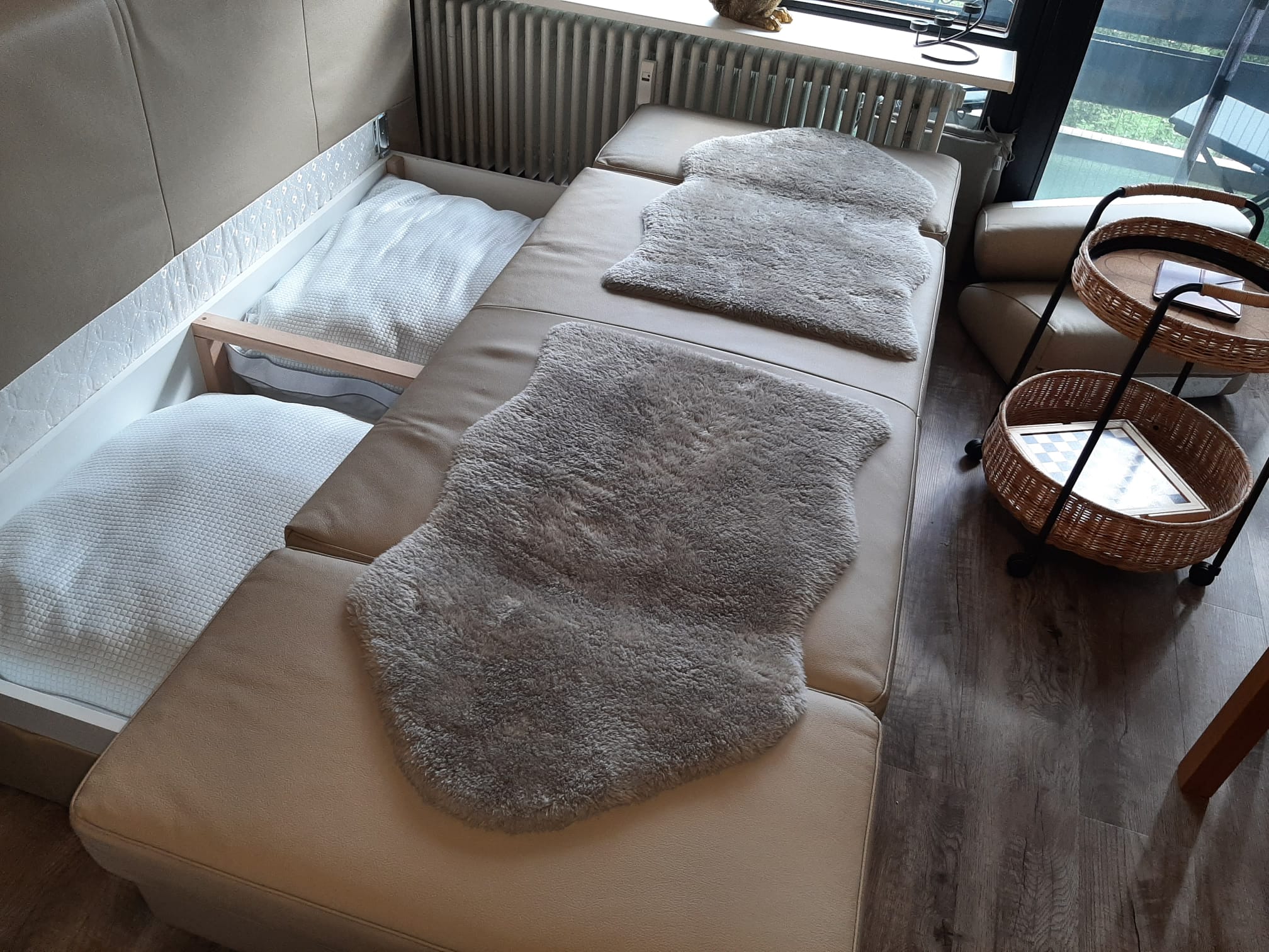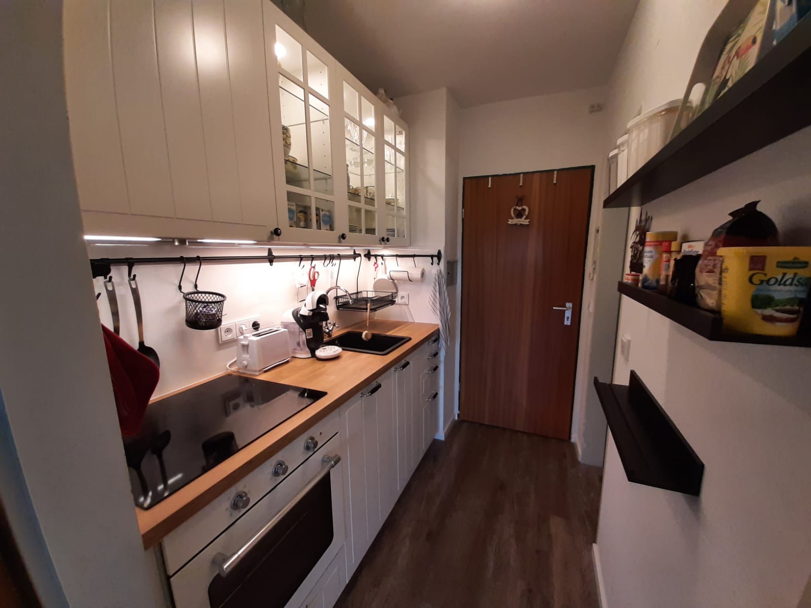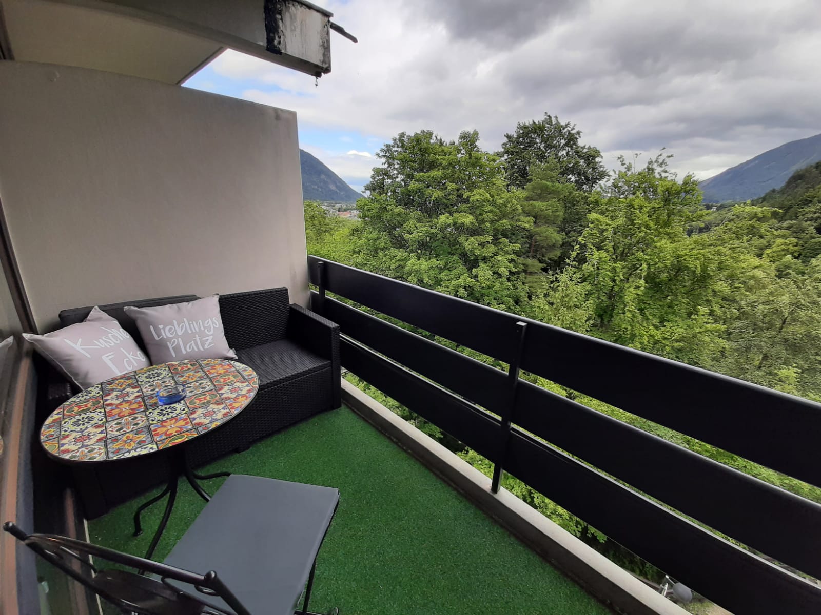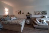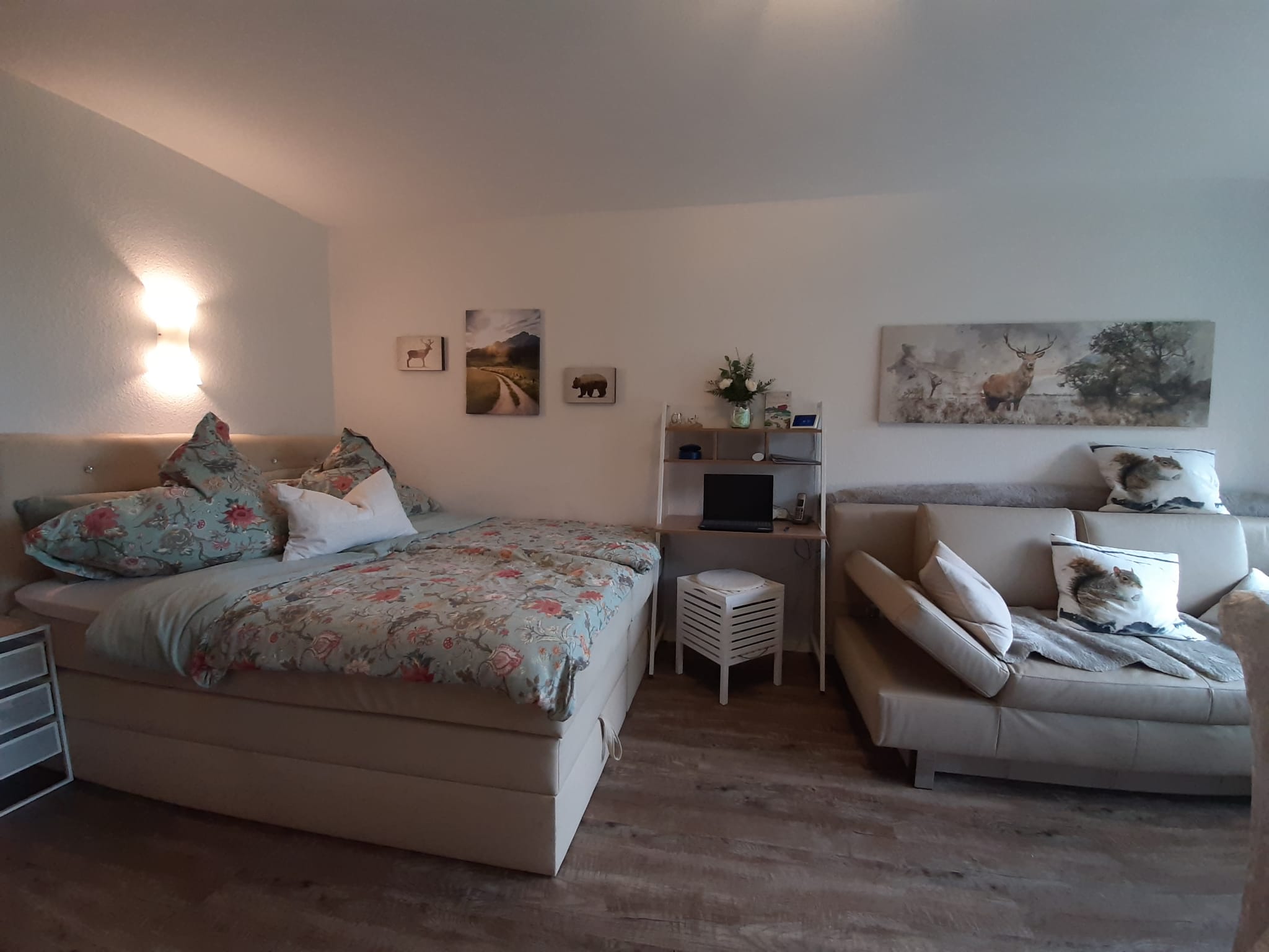 Geradeaus erreicht man das Wohnzimmer mit gemütlicher Essecke und einer Schlafcouch (z. B. für Kinder). Gleich links neben der Wohnzimmertür befindet sich das 160 cm breite Boxspringbett mit Topper. Im Wohnzimmer befindet sich ein moderner Fernseher mit einem Amazon TV-Stick. Die gemütliche Leder-Coach kann zu einem Doppelbett (150×200) ausgezogen werden. Vom Wohnzimmer gelangt man auf den großen Balkon. Dieser ist mit einer gemütlichen 2-sitzigen Bank, 2 Stühlen und einem Tisch ausgestattet. In der Ecke steht ein Wäscheständer für die nassen Badesachen. Sie genießen hier die Aussicht auf die Predigtstuhlbahn und können die roten Gondeln hoch- und runterfahren sehen. Neben der Essecke befindet sich der Kühlschrank mit einer Mikrowelle. Hier kann man gemütlich essen, Gesellschaftsspiele spielen oder Ausflüge planen. Zwischen Boxspringbett und Schlafcoach steht ein kleiner Sekretär zum Schreiben oder für den Laptop. Gegenüber vom Boxspringbett befindet sich der geräumige Kleiderschrank mit großem Spiegel. Hier können Sie Ihr Outfit kontrollieren. Daneben befindet sich eine Garderobe für Ihre Jacken, Mäntel und Schuhe. Die kleine Küche befindet sich im Flur und verfügt über einen Induktionsherd mit Backofen und eine Geschirrspülmaschine. Natürlich sind auch Toaster, Wasserkocher, Kaffeemaschine (Tassimo oder Senseo) und vieles mehr vorhanden. Das Bad verfügt über eine Wanne mit Duschvorrichtung. Ein Fön ist vorhanden. Natürlich verfügt die Fewo Rupertusschwänchen über Internet / WLAN. Die Lichtsteuerung kann über Alexa bedient werden. So ist das Dimmen der Lampen möglich. Über Alexa können Sie auch Radio / Musik hören.