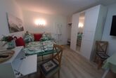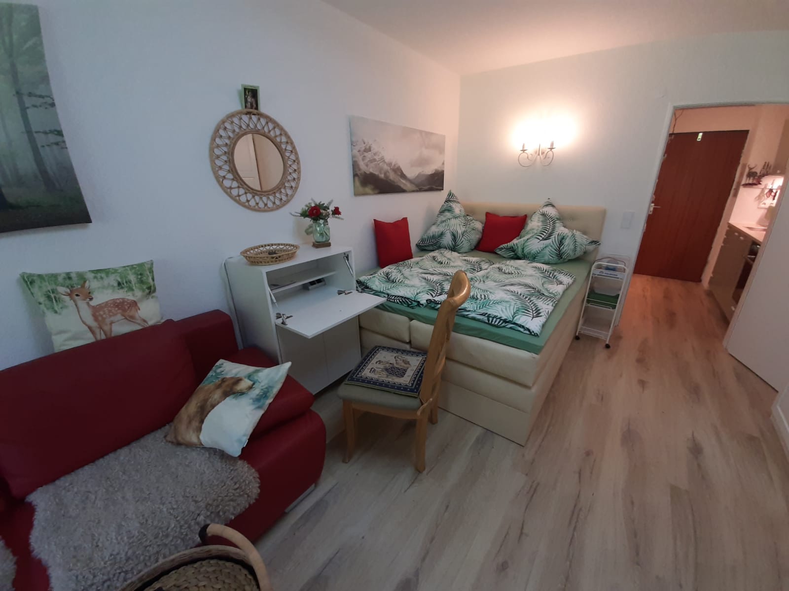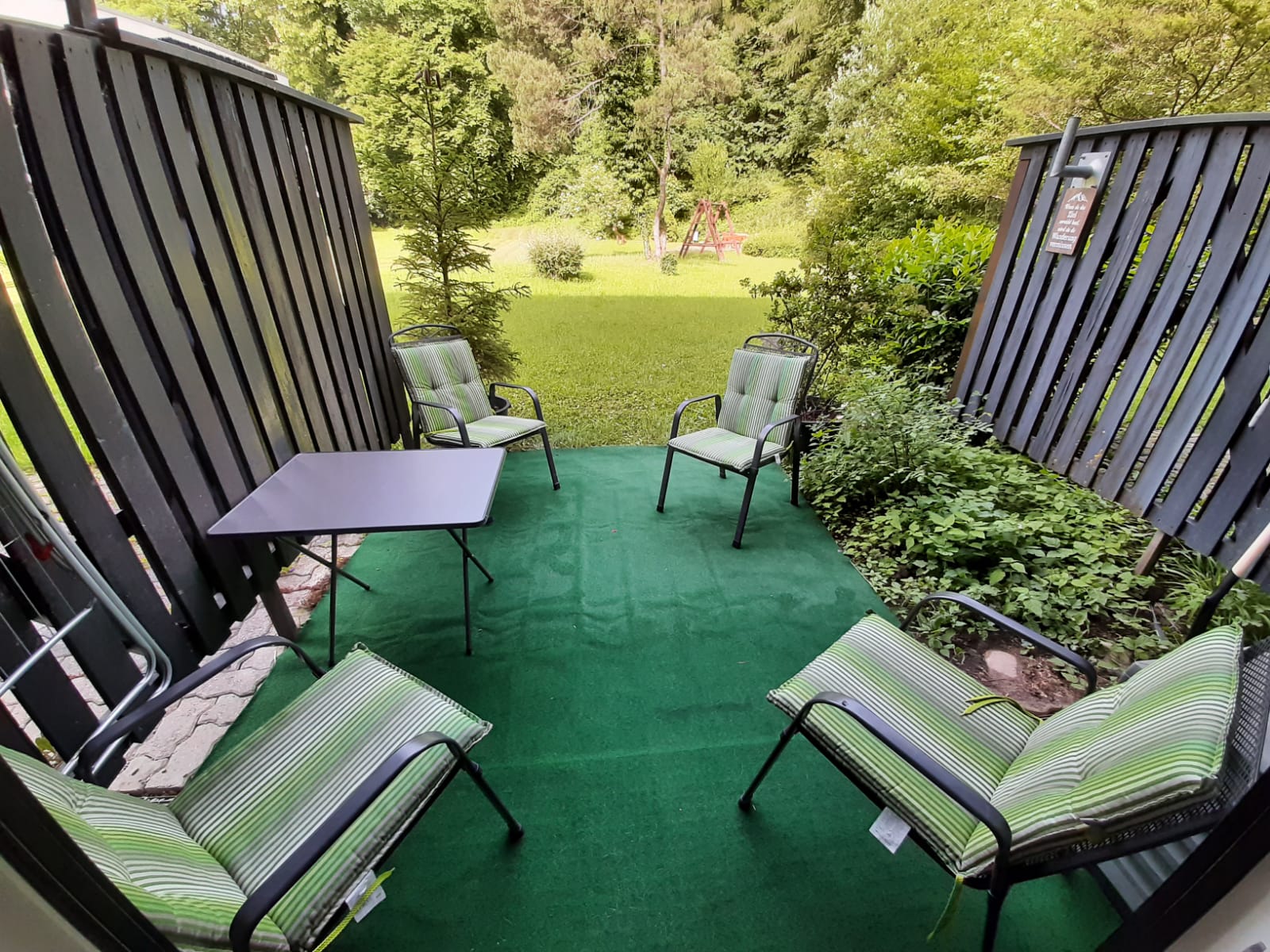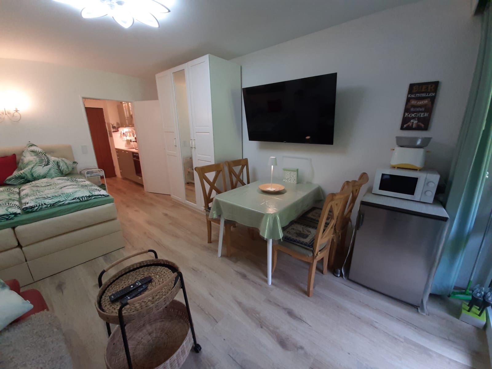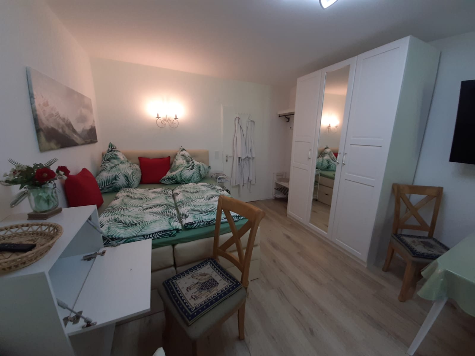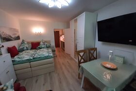 Die gemütliche und komfortable Ferienwohnung Saalachschwänchen ist ca. 29m² groß. Von der Wohnungstür betritt man einen kleinen Flur, von dem rechts das Bad abgeht. Geradeaus erreicht man das Wohnzimmer mit gemütlicher Essecke und einer Schlafcouch (z. B. für Kinder). Gleich rechts neben der Wohnzimmertür befindet sich das 160 cm breite Boxspringbett mit Topper. Im Wohnzimmer befindet sich ein moderner Fernseher mit einem Amazon TV-Stick. Die gemütliche Leder-Coach kann zu einem Doppelbett (150×200) ausgezogen werden. Vom Wohnzimmer gelangt man auf Terrasse. Diese ist mit 4 Stühlen und einem Tisch ausgestattet. In der Ecke steht ein Wäscheständer für die nassen Badesachen. Von der Terrasse hat man direkten Zugang zum Garten mit dem Spielplatz. Neben der Essecke befindet sich der Kühlschrank mit einer Mikrowelle. Hier kann man gemütlich essen, Gesellschaftsspiele spielen oder Ausflüge planen. Zwischen Boxspringbe.tt und Schlafcoach steht ein kleiner Sekretär zum Schreiben oder für den Laptop.