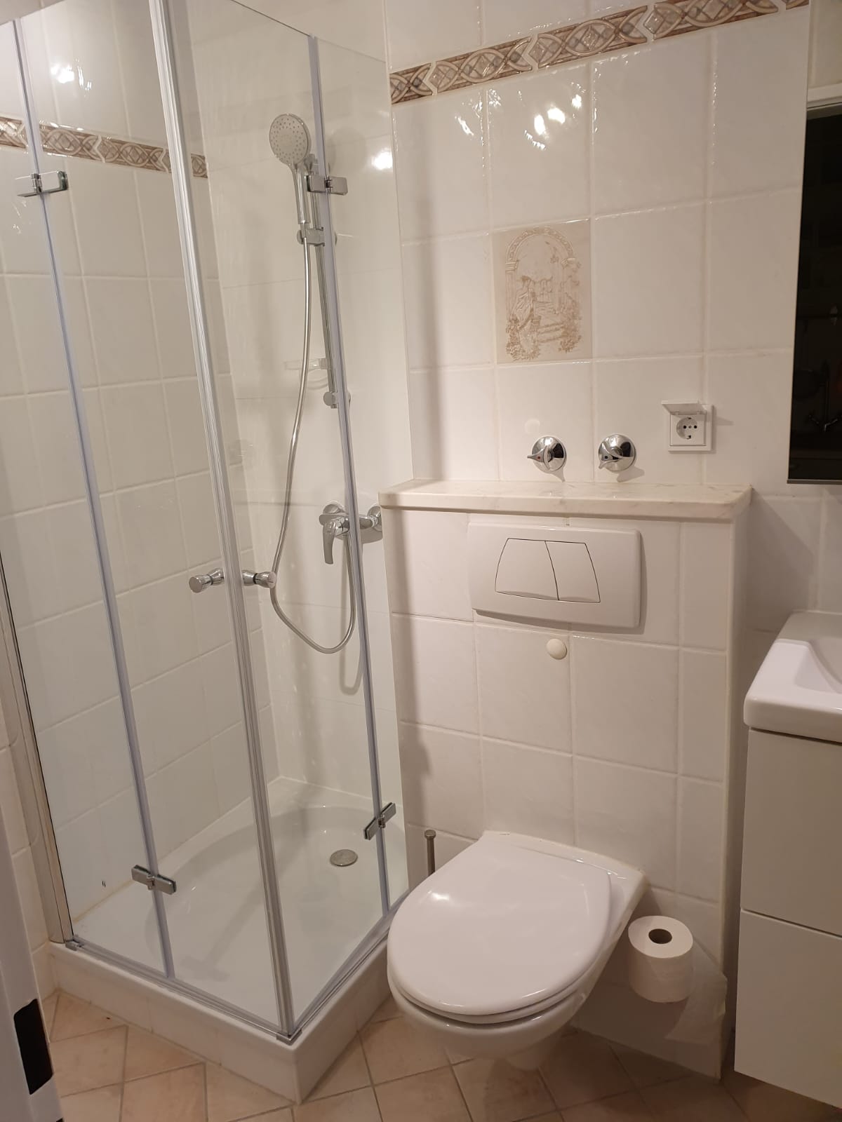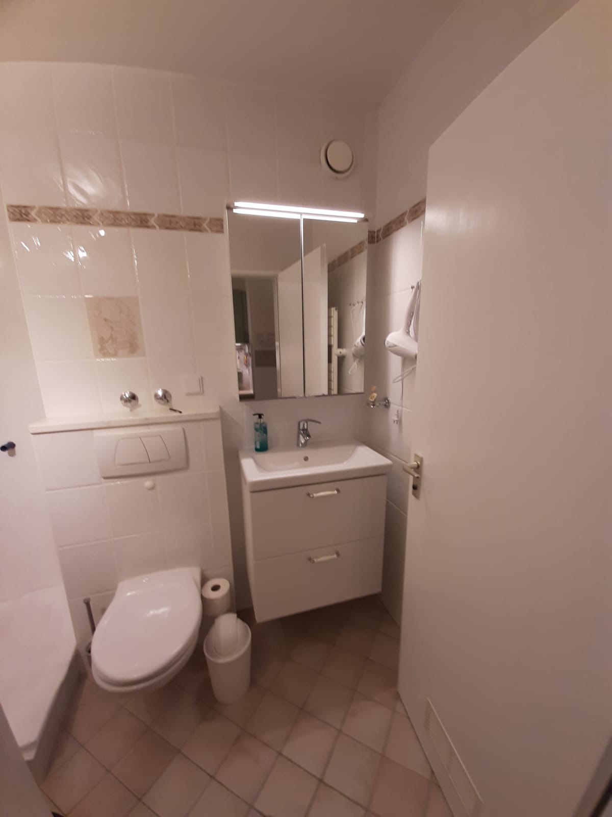 Gegenüber vom Boxspringbett befindet sich der geräumige Kleiderschrank mit großem Spiegel. Hier können Sie Ihr Outfit kontrollieren. Daneben befindet sich eine Garderobe für Ihre Jacken, Mäntel und Schuhe. Die kleine Küche befindet sich im Flur und verfügt über einen Induktionsherd mit Backofen und eine Geschirrspülmaschine. Natürlich sind auch Toaster, Wasserkocher, Kaffeemaschine (Tassimo oder Senseo) und vieles mehr vorhanden. Das Bad verfügt über eine Dusche. Ein Fön ist vorhanden. Natürlich verfügt die Fewo Saalachschwänchen über Internet / WLAN. Die Lichtsteuerung kann über Alexa bedient werden. So ist das Dimmen der Lampen möglich. Über Alexa können Sie auch Radio / Musik hören.