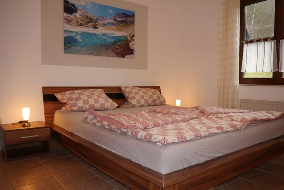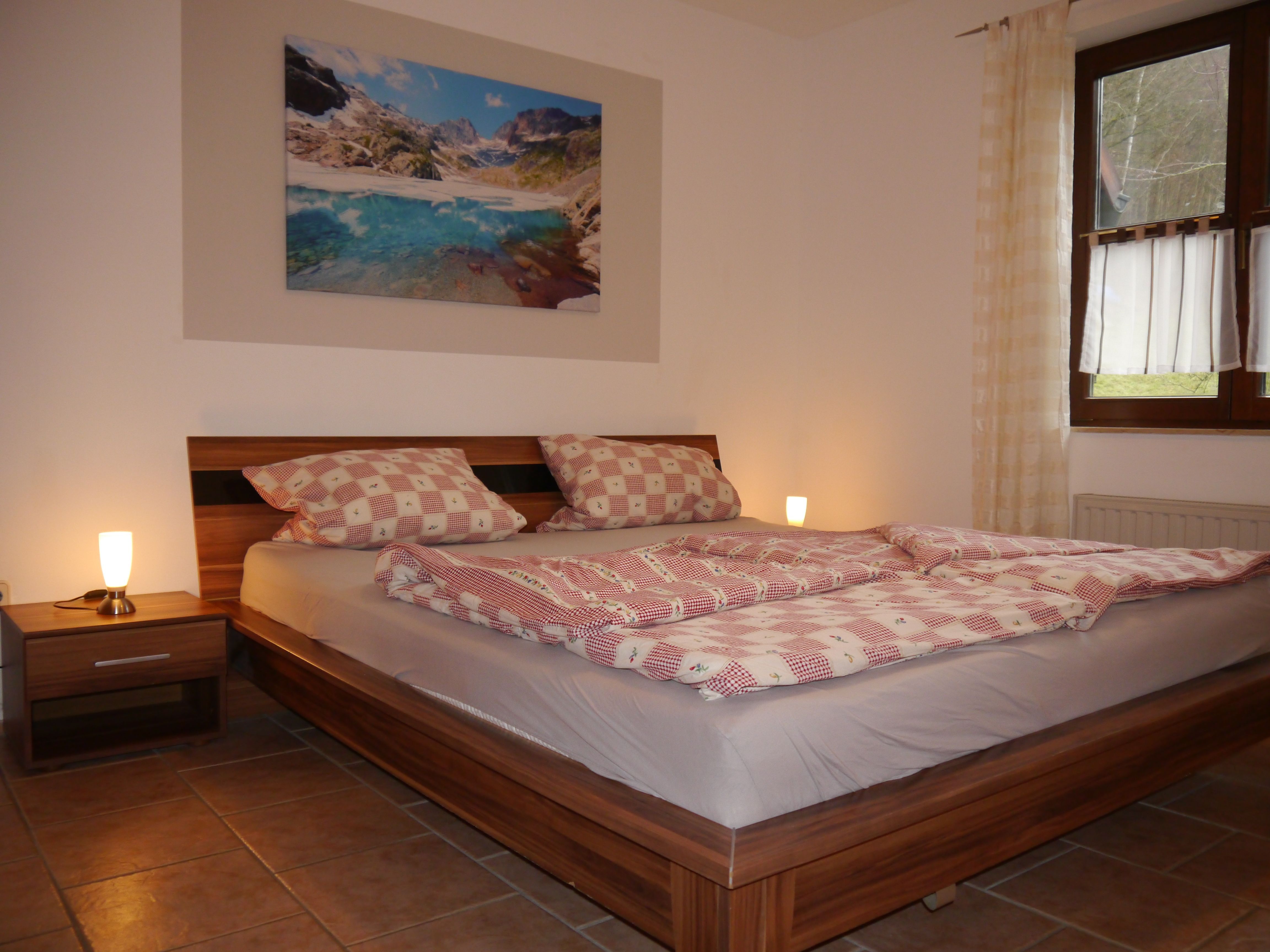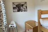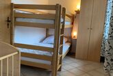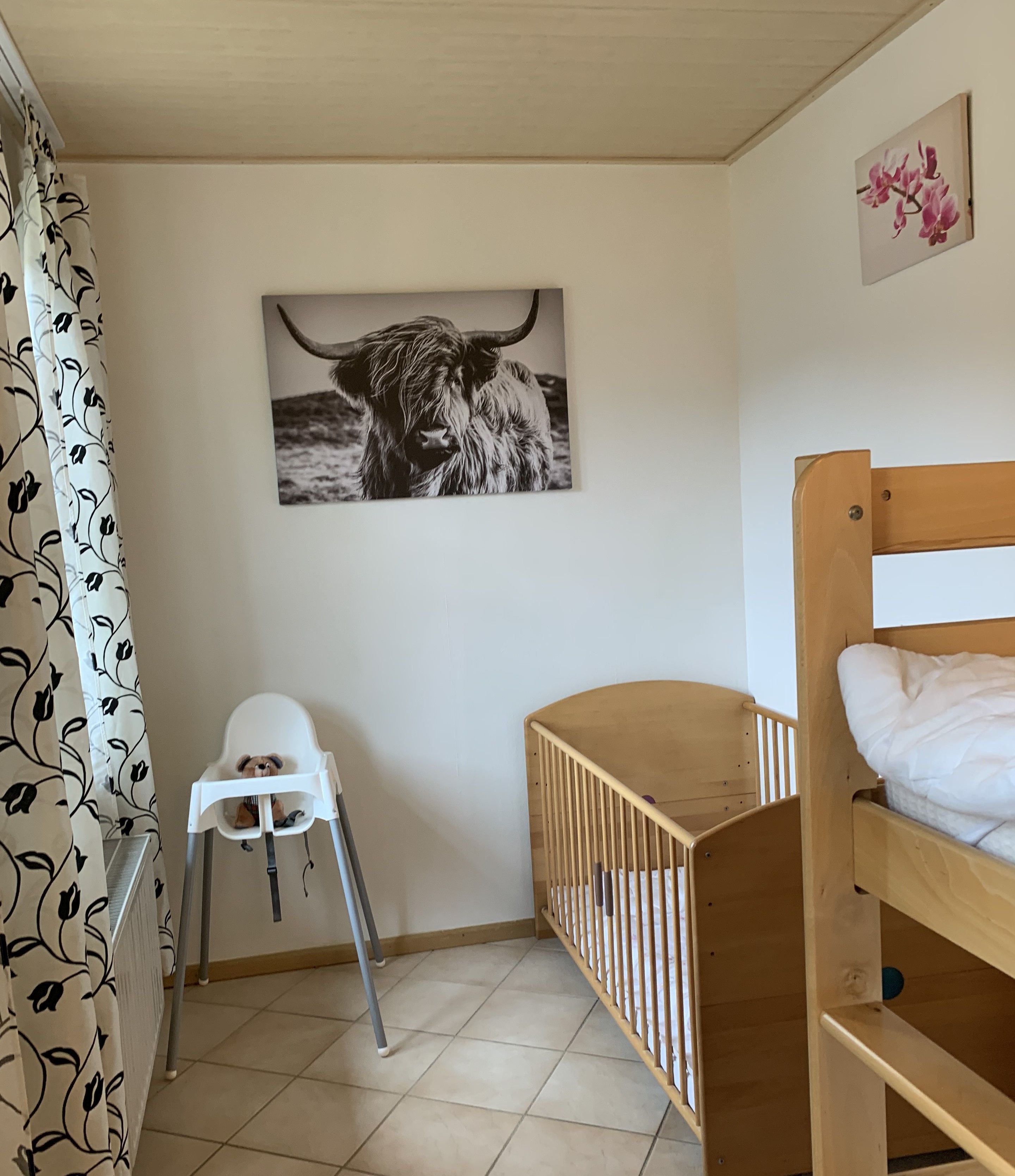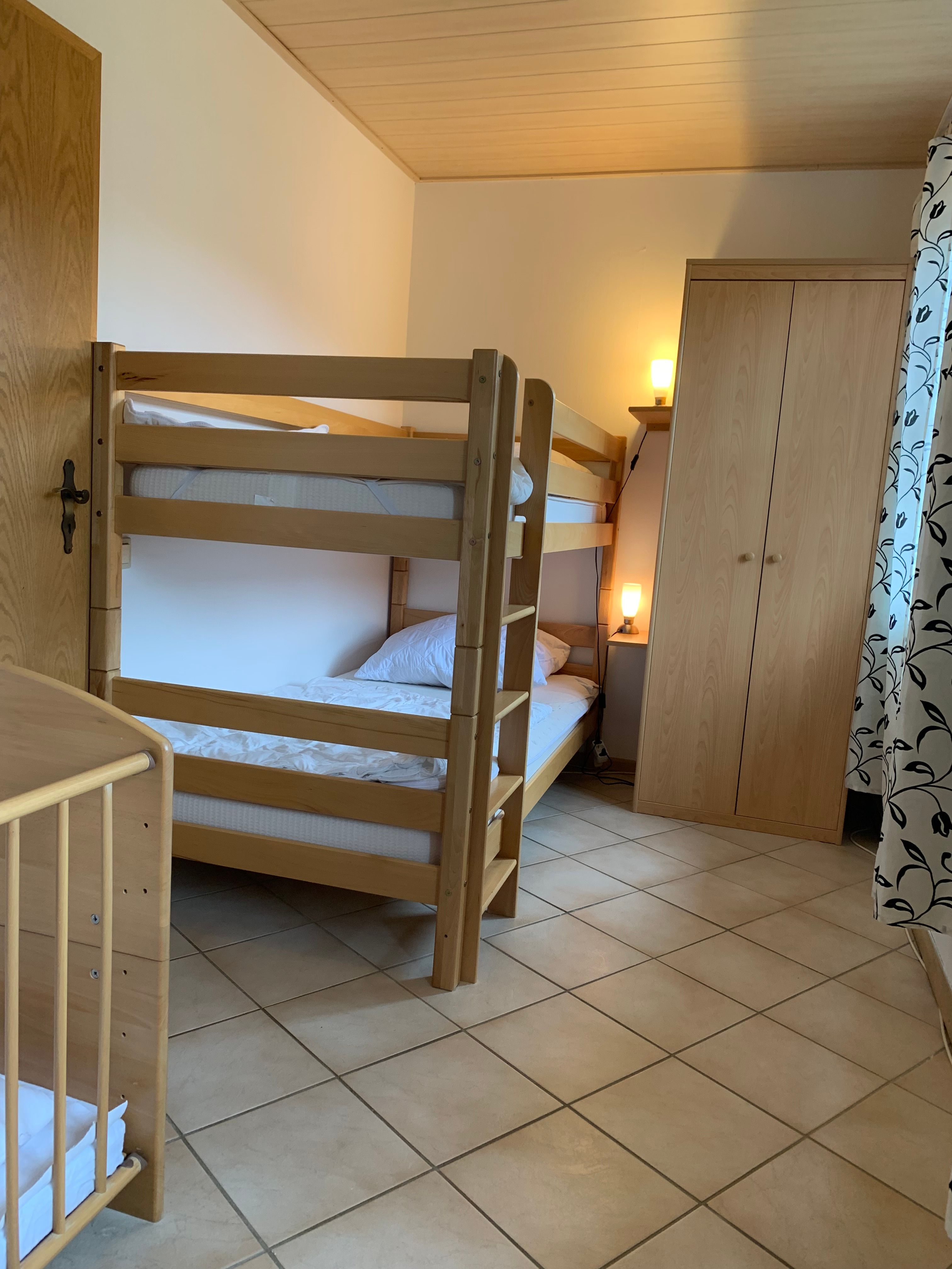 Die Ferienwohnung 1 beinhaltet zwei Schlafzimmer darunter ein Etagenbett und ein Doppelbett sowie ein Babybett.