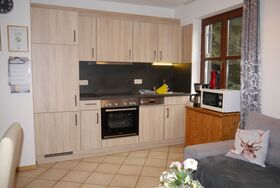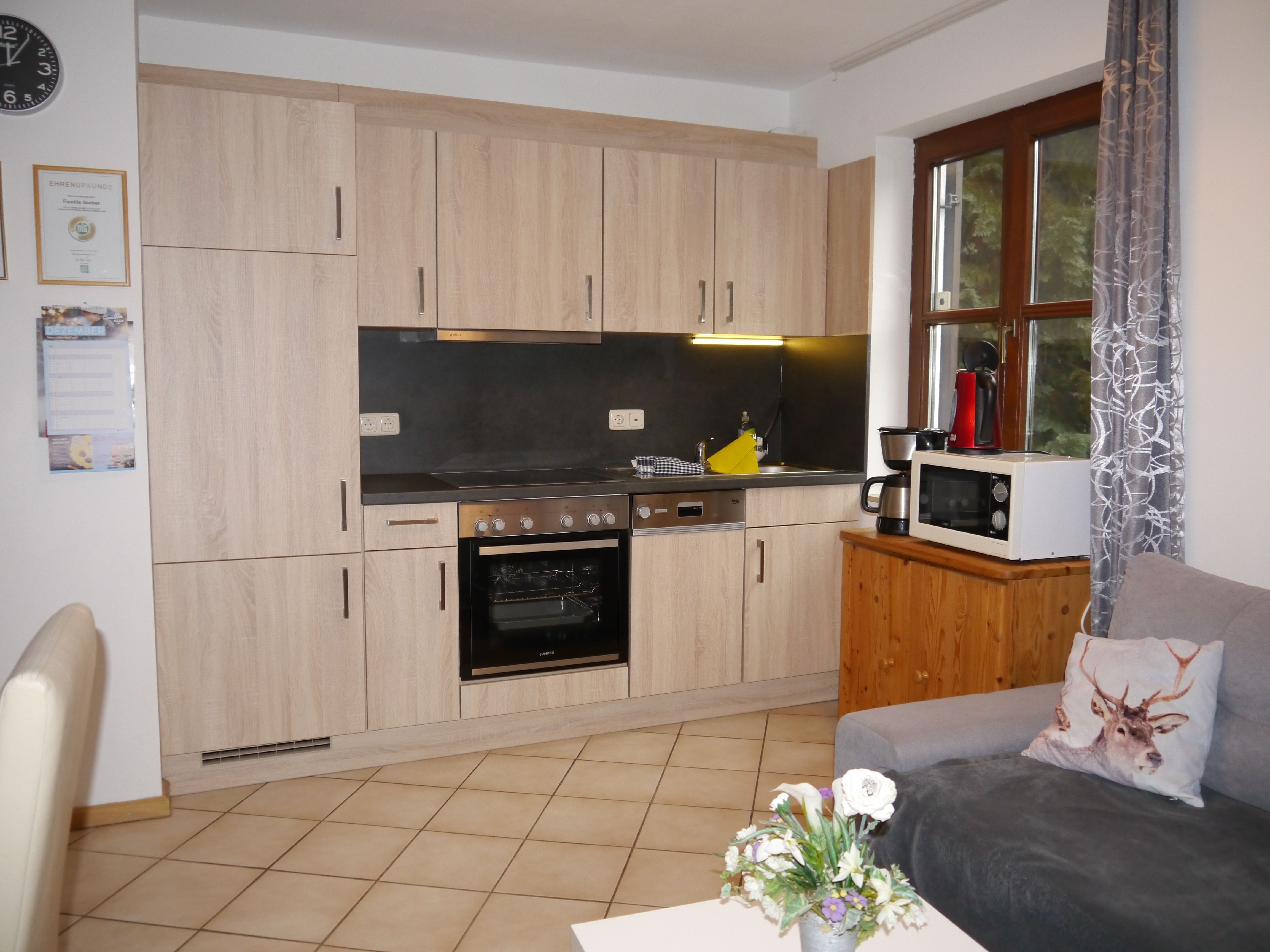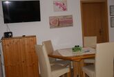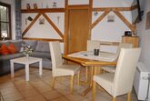 Im Wohn- und Essbereich befindet sich ein Sofa, ein Tisch mit vier Stühlen sowie eine komplett ausgestattete Küche mit Mikrowelle, Wasserkocher, Kaffeemaschine, Handrührgerät, Toaster und Brotschneidemaschine.
