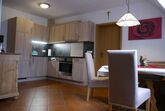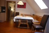 Im Wohn- und Essbereich befindet sich ein Sofa, ein Tisch mit einer Eckbank und zwei Stühlen sowie eine komplett ausgestattete Küche mit Mikrowelle, Wasserkocher, Kaffeemaschine, Handrührgerät, Toaster und Brotschneidemaschine.