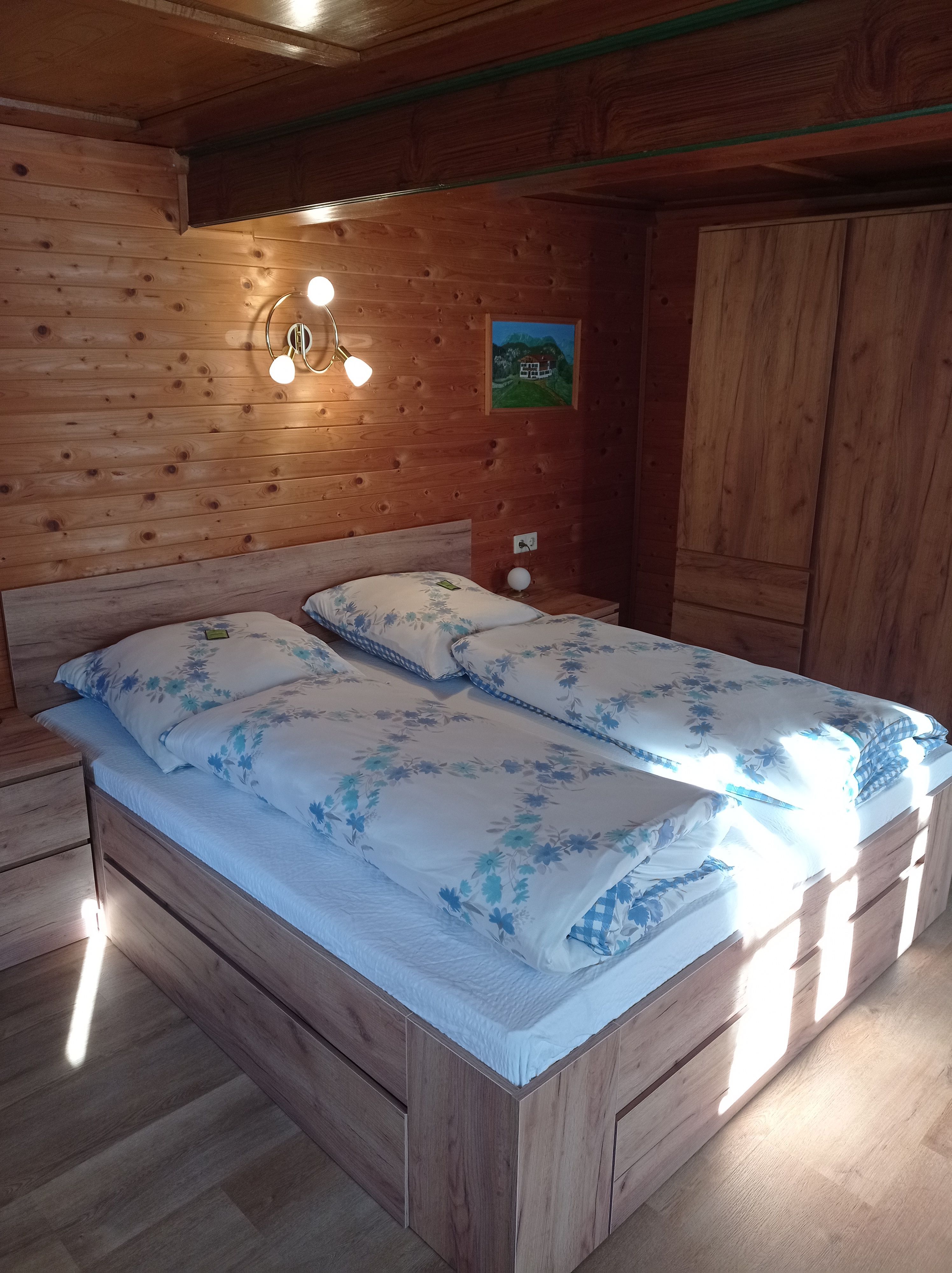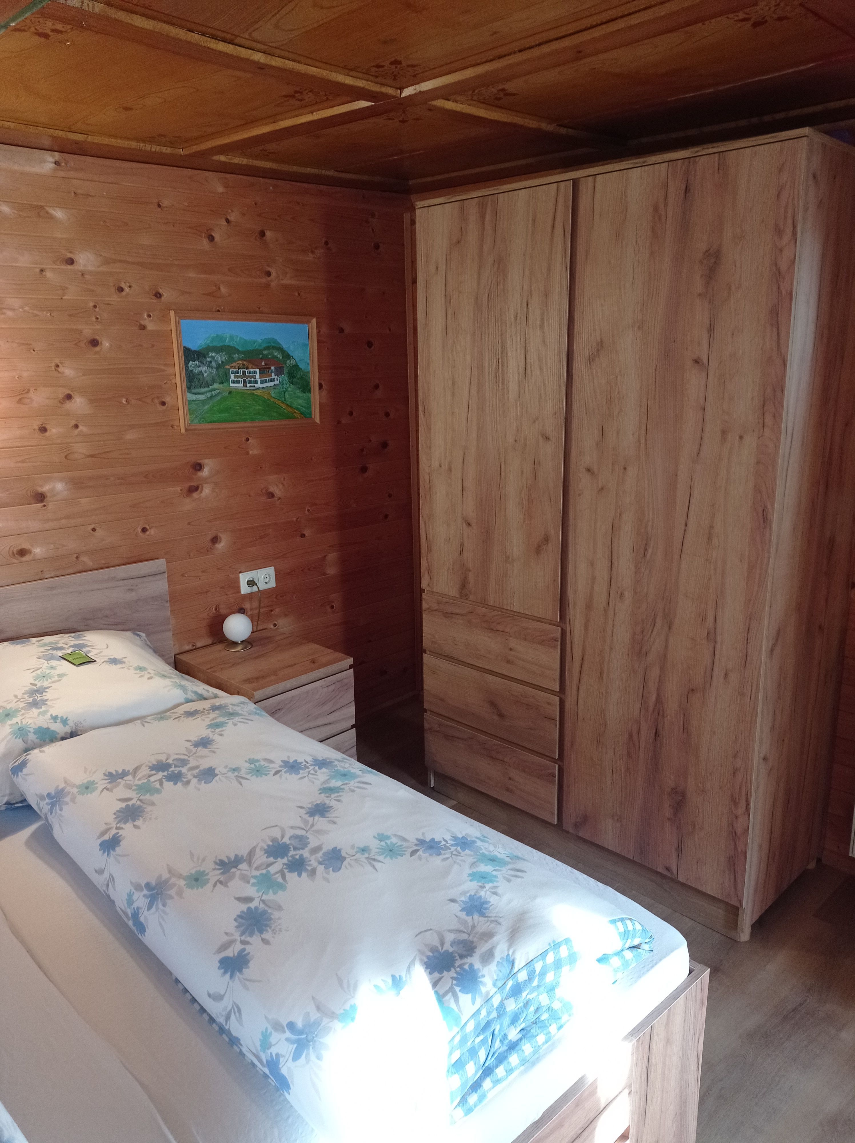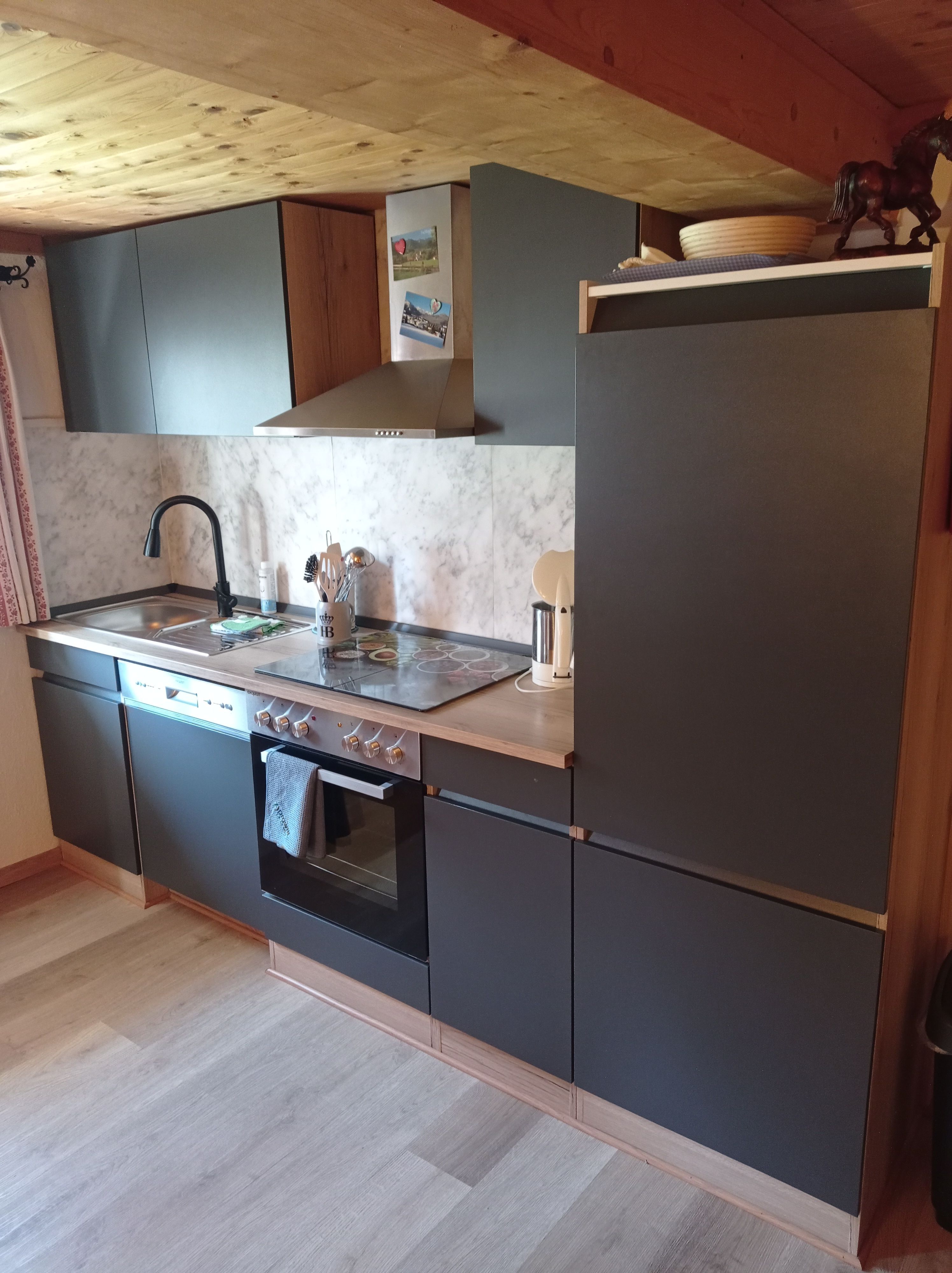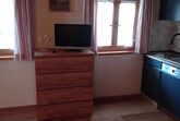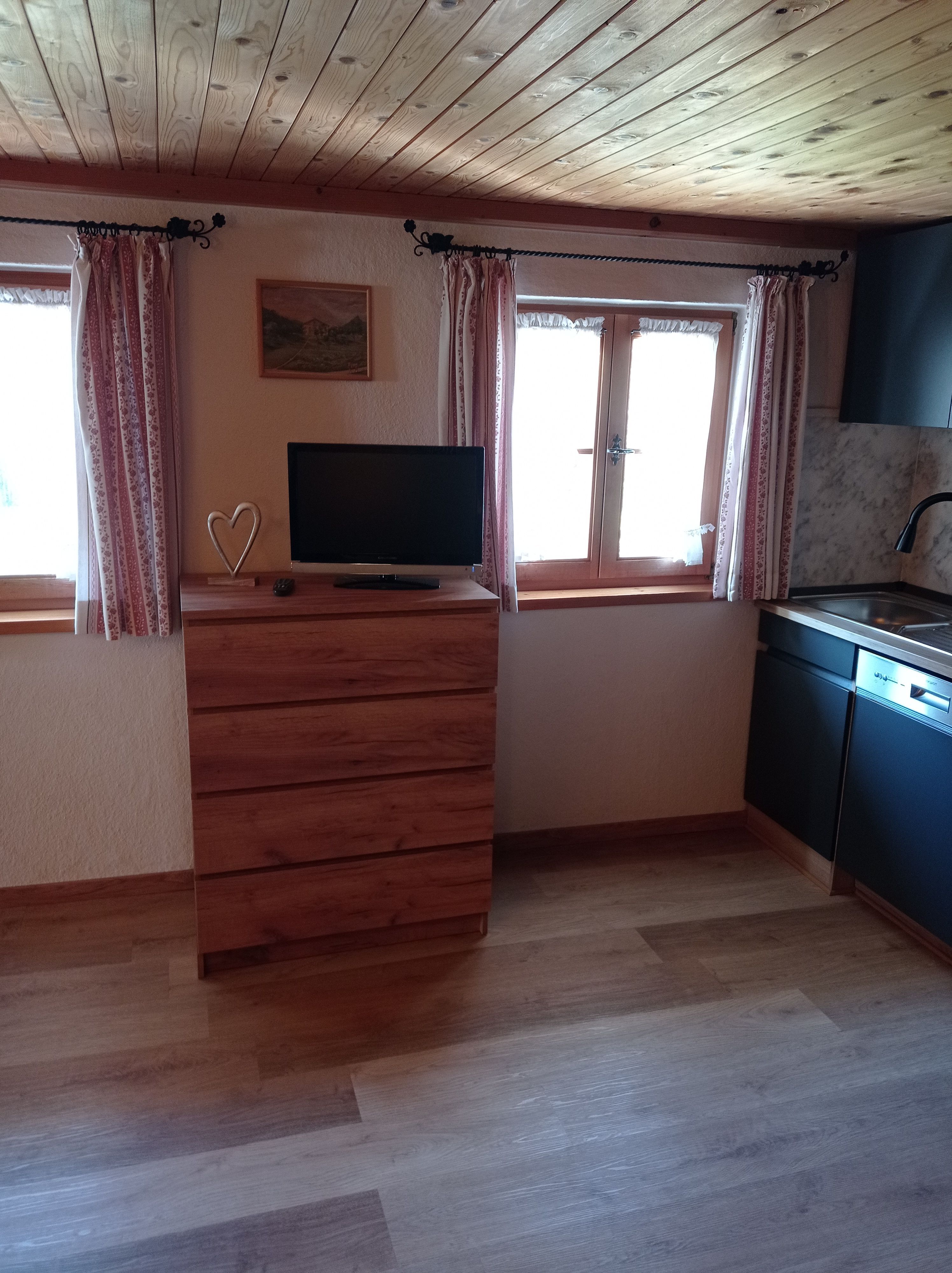 Sie verfügt über eine Wohnküche, ein Schlafzimmer und Dusche. Das WC befindet sich auch im 1. Stock, gegenüber der Ferienwohnung, wird aber ausschließlich durch die Gäste benützt.