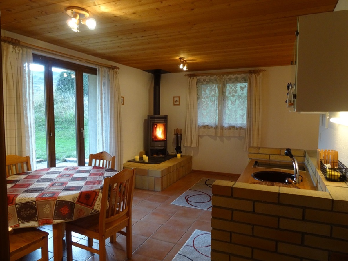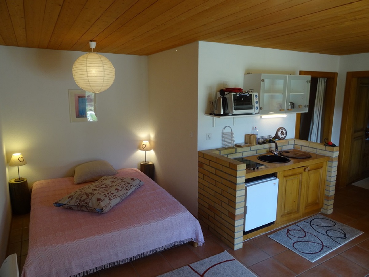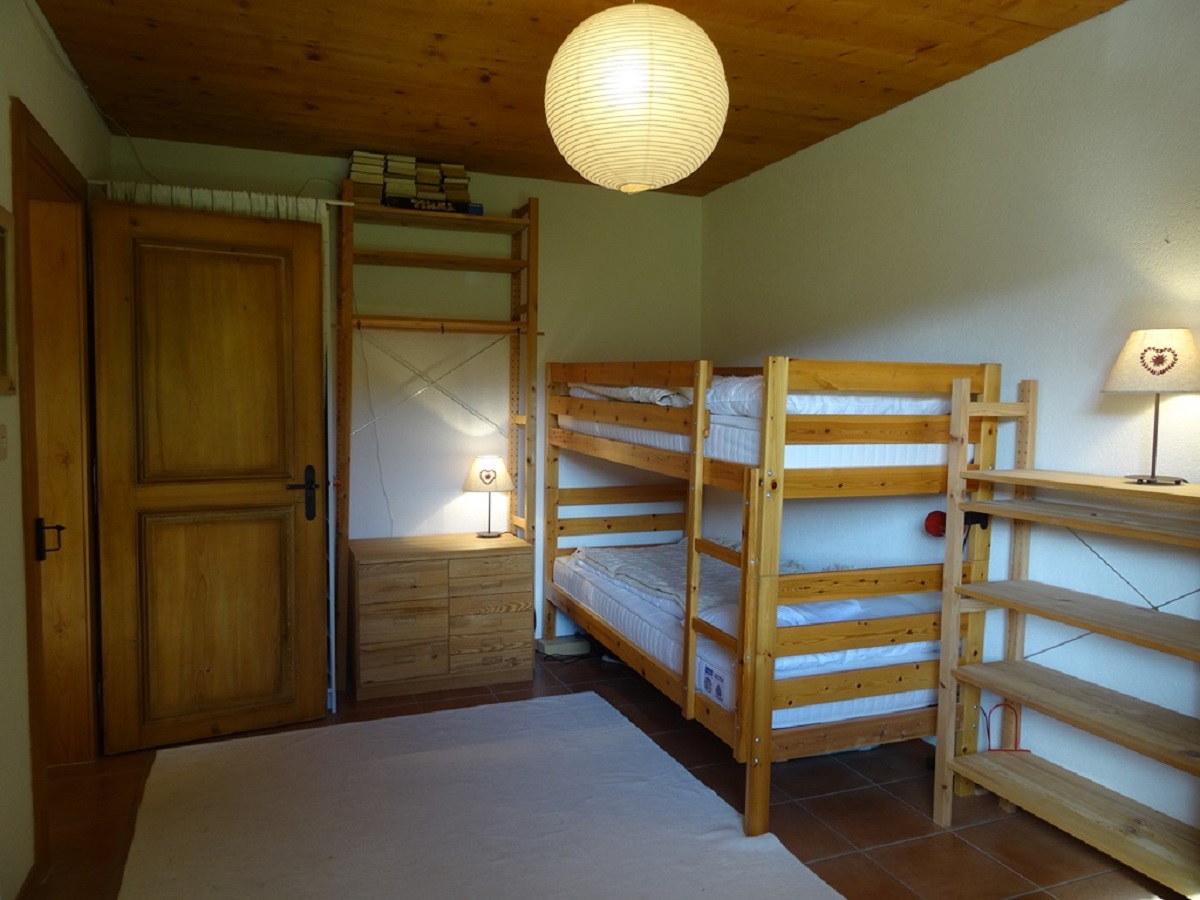 2-Zimmer-Wohnung (50 m2 im Erdgeschoss) für 4 Personen bestehend aus: Wohnzimmer mit Kingsize-Bett (TV, Wifi) und Essecke, offene Küche (2 Kochplatten, Mikrowelle, Kaffeemaschine, Fondue-Set, Raclette-Set), 1 Schlafzimmer mit 1 Etagenbett (2x90x200).Badezimmer (Dusche/WC), Terrasse.