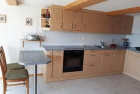 Im Innenbereich erwarten Sie eine gemütliche Wohnküche mit Sofa, Salontisch und Sessel sowie ein Schlafzimmer mit einem Doppelbett. Bei Bedarf ist ein Kinderbett erhältlich. Die Wohnung ist mit einem Fernsehgerät und einer Sitzgelegenheit dafür ausgestattet. Für zusätzlichen Komfort sorgt das Badezimmer, welches eine Dusche mit Sitzbank für Gehbehinderte Personen bietet. Eine voll ausgestattete Küche mit Geschirr, Trinkgläsern, Besteck und Pfannen steht Ihnen ebenfalls zur Verfügung.