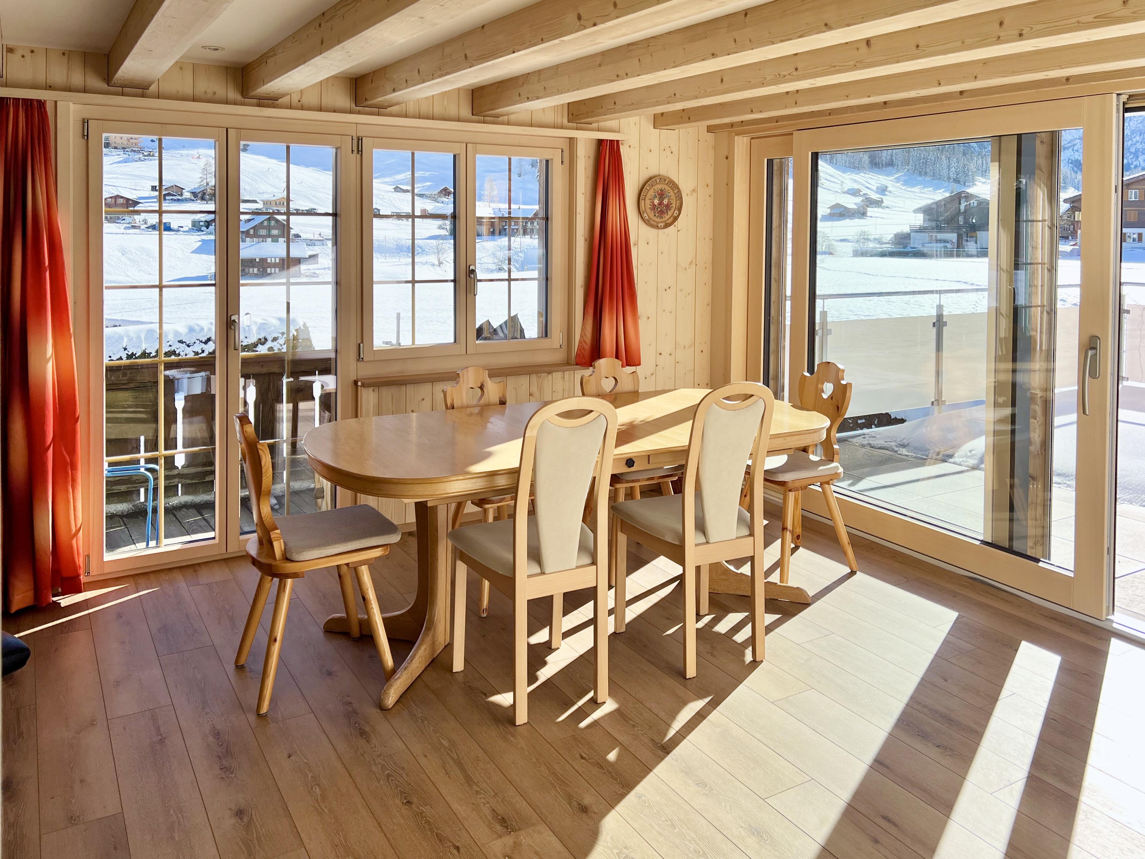 5-Zimmer im 1. und 2. Stock (100 m2), private Parkplätze. Grosse Wohnstube, TV, 25 m2 Dachterasse südseitig, Balkon, 3 heimelige Schlafzimmer, insgesamt 9 Betten, dazu Schlafcouch mit 2 Plätzen im Wohnzimmer. Grosser Garten mit gedecktem Sitzplatz + Gartencheminée, geheizter Raum für Skikleider, Balkon. 500 m vom Skilift, 50 m zum Dorfladen, ruhig und angenehm gelegen. Bushaltestelle (20m). Haustiere gestattet.
