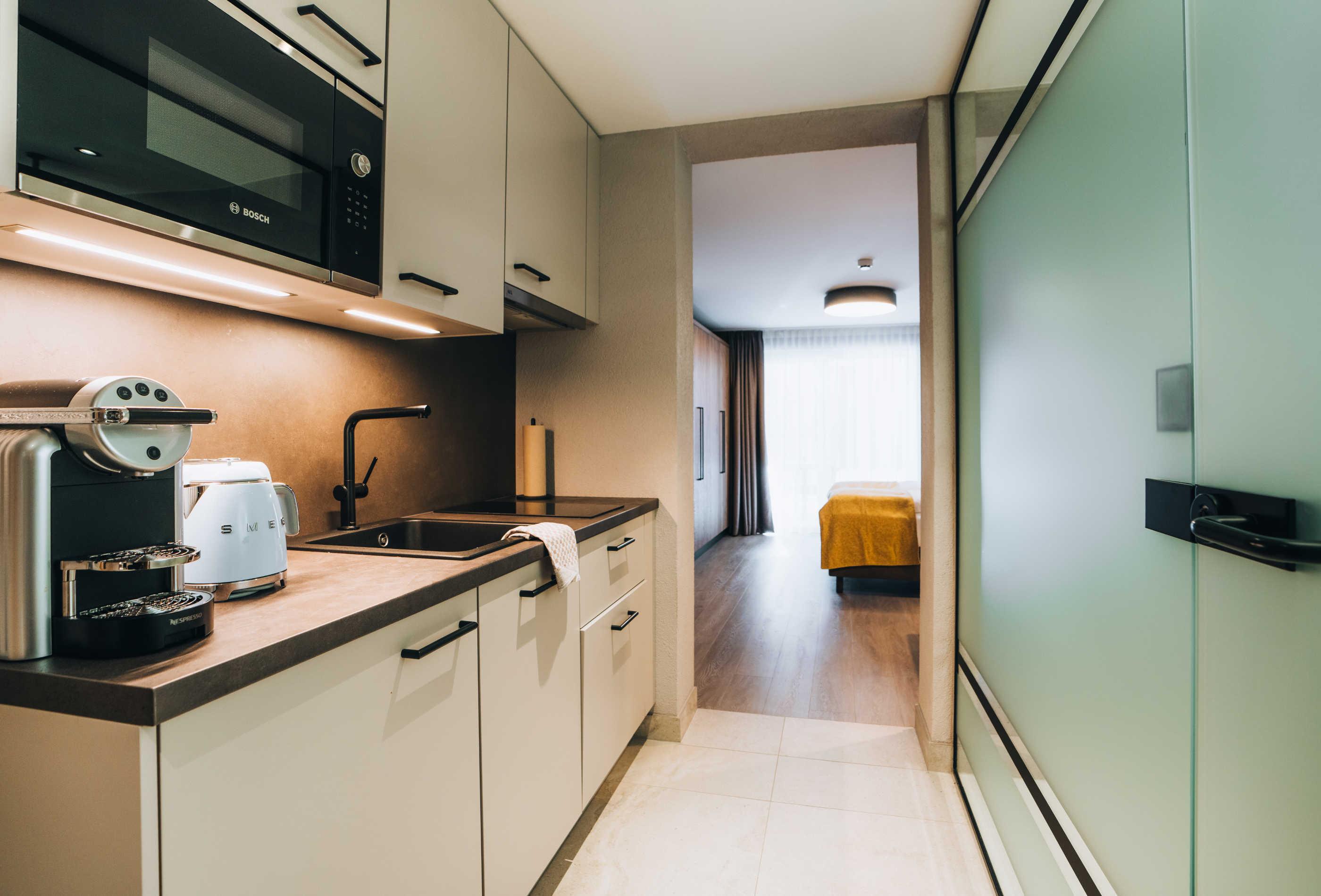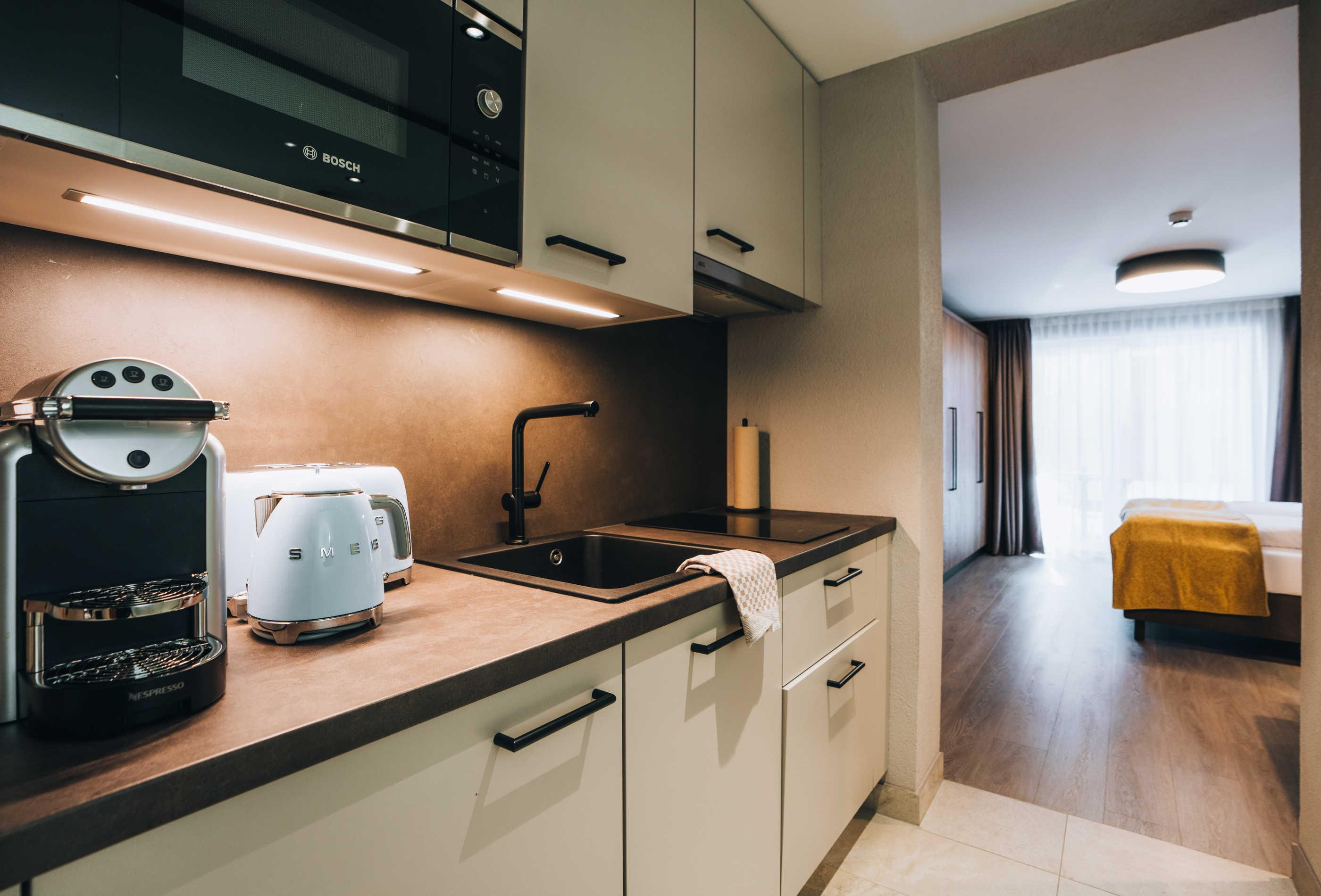 Modernes Studio S mit ca. 29 m² Wohnfläche: 1 Doppelzimmer mit Essplatz; 1 Badezimmer mit Dusche/WC; 1 vollausgestatteter Kochnische (Nespresso Business Kaffeemaschine & Kaffeevollautomat, Cerankochfeld, Küchlschrank, Mikrowelle, Geschirrspüler uvm.); Südbalkon mit eingeschränkter Sicht