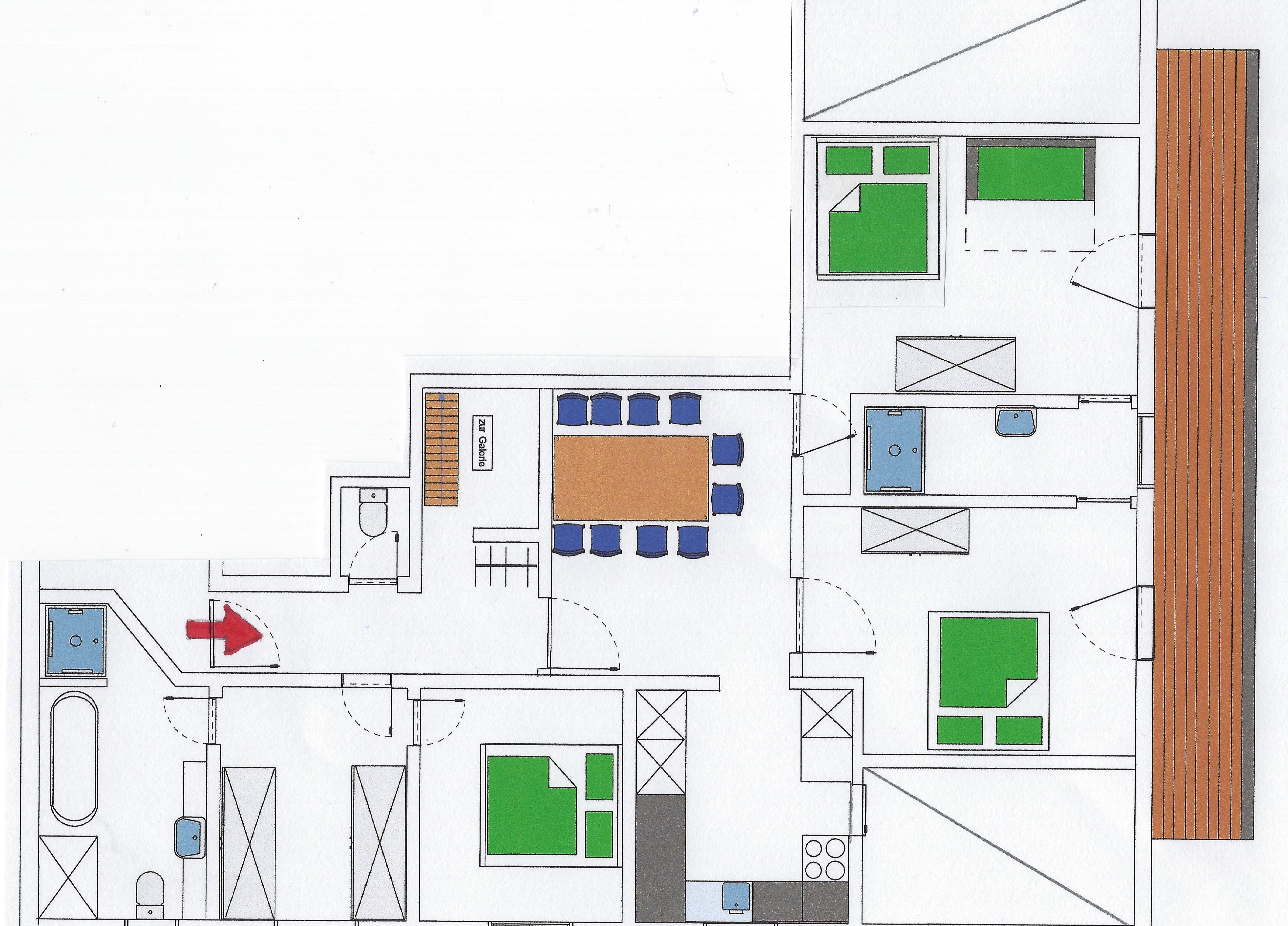 3 Schlafzimmer, 1 Bad mit großer Dusche, Badewanne und WC, 1 Bad mit großer Dusche, 1 extra WC, sehr große Küche mit Spülmaschine, gr. Kühlschrank, Mikro, Backofen, großem Esszimmer, Galerie bzw. Empore über dem Esszimmer als Lümmel/Spielecke, Balkon und eigene Infrarotkabine im Apartment
