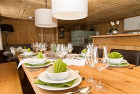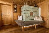 originale Walser Altholzstube mit schönem Ess- und Wohnzimmerbereich mit perfekt ausgestatteter Küche, Eckbank, Sofa, Kachelofen mit traditionellem Ofenbänkle (keine Schalfsofas!)