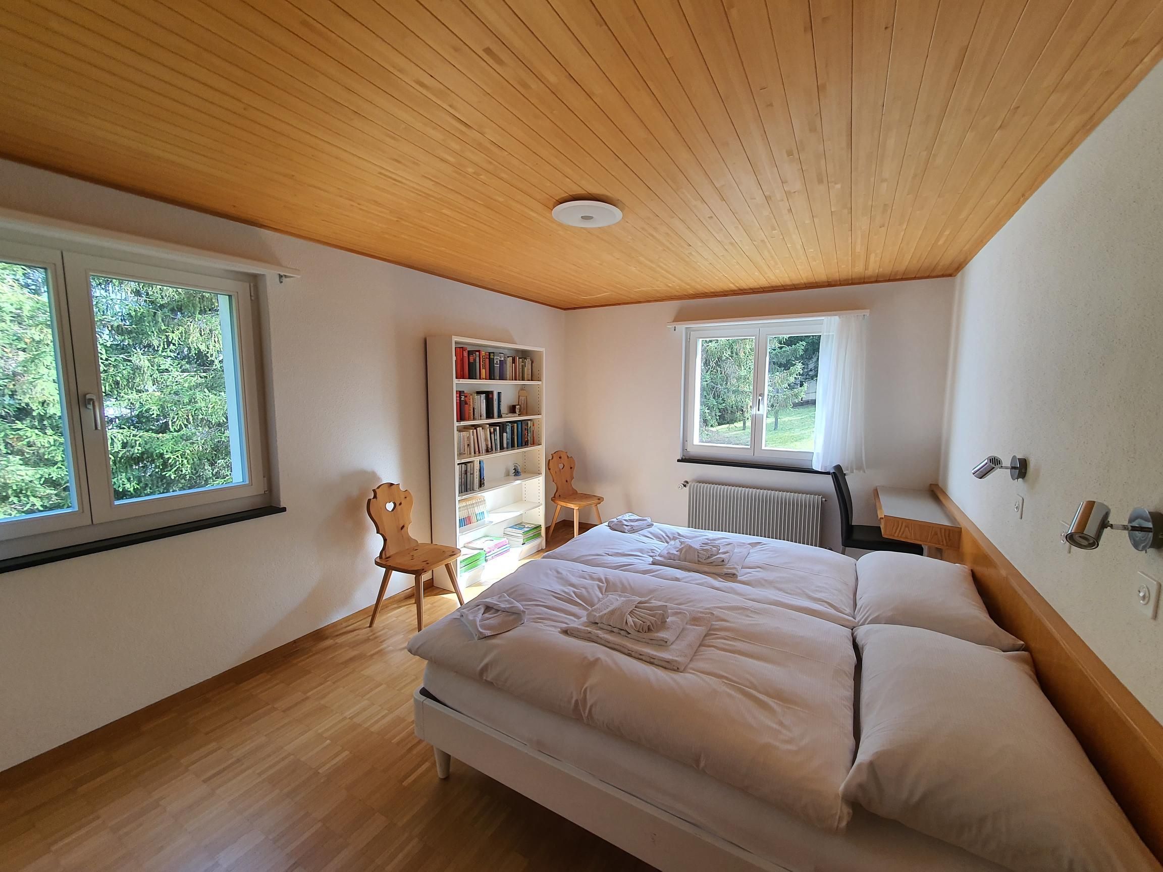 - Im oberen Geschoss befindet sich der Wohnraum mit Essbereich und Gartensitzplatz, separate Küche, Schlafzimmer mit Doppelbett, Schlafzimmer mit 2 Betten, Schlafzimmer mit 1 Bett, Bad mit Badewanne und WC, separates WC mit Waschtisch. Die Küche verfügt über alles, das man in einem gemütlichen Urlaub braucht (Nespressomaschine, Wasserkocher, Geschirrspüler, Backofen, Kühlschrank mit Gefrierfach, Raclette-Ofen, Fondue-Caquelon etc.)