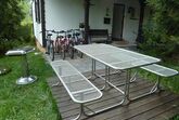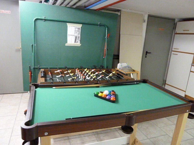 Im Keller ist eine Waschmaschine, ein Wäschetrockner, Fahrräder, ein Kickertisch und eine Tischtennisplatte.