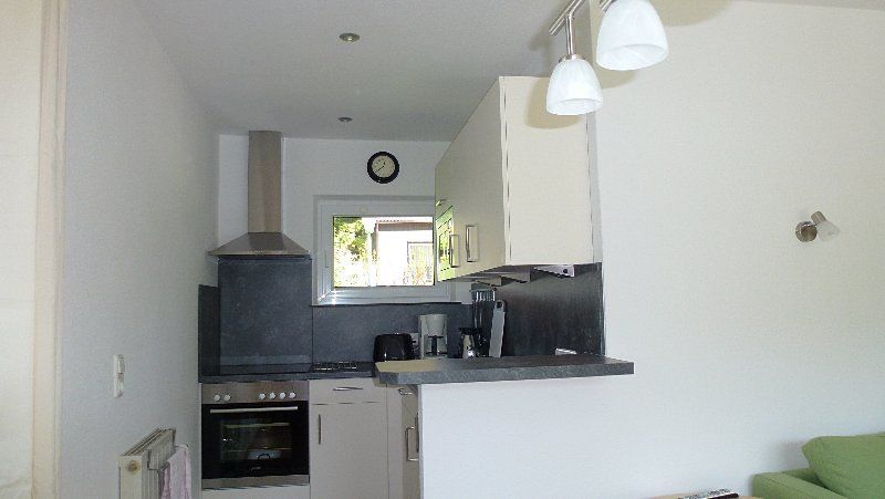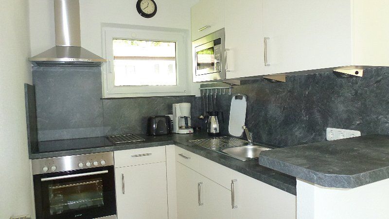 Es steht Ihnen eine moderne Küche mit allen üblichen Elektrogeräten wie Geschirrspüler, Mikrowelle, Herd mit Cerankochfeld, und ein Kühlschrank mit Gefrierfach zur Verfügung. Die Küche ist zum Wohnzimmer durch eine kleine Theke getrennt.