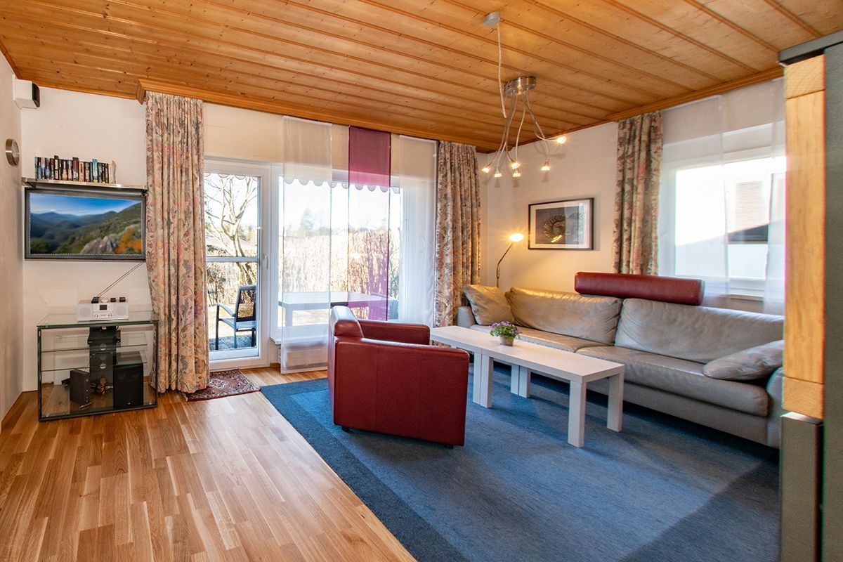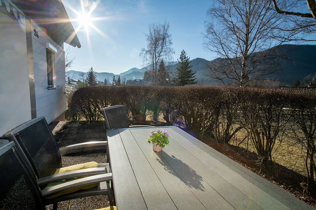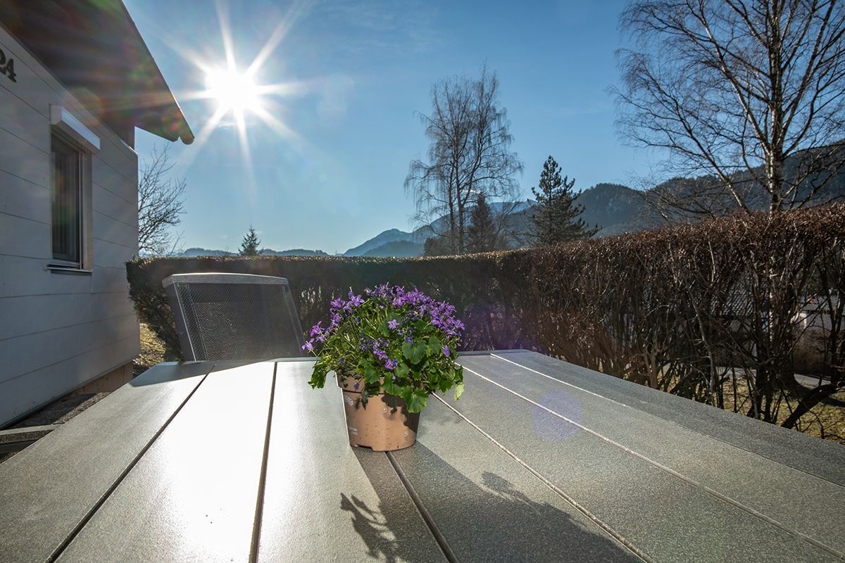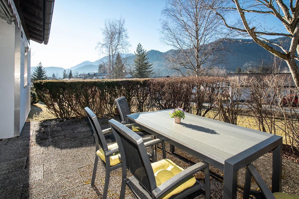Vor dem Wohnzimmer befindet sich die großzügige, weitgehend uneinsehbare Süd-West-Terrasse mit neuer Tischgruppe und herrlichem Blick auf die Berge. Markise und Gartenmöbel laden dort in der warmen Jahreszeit zum Relaxen oder einem gemütlichen Essen im Freien ein.