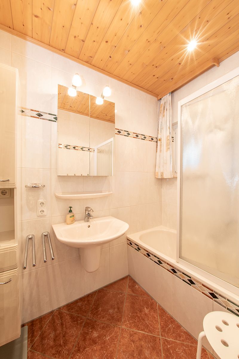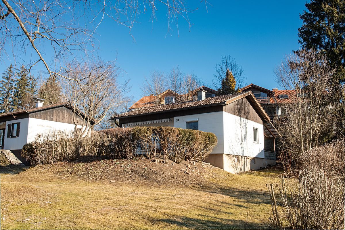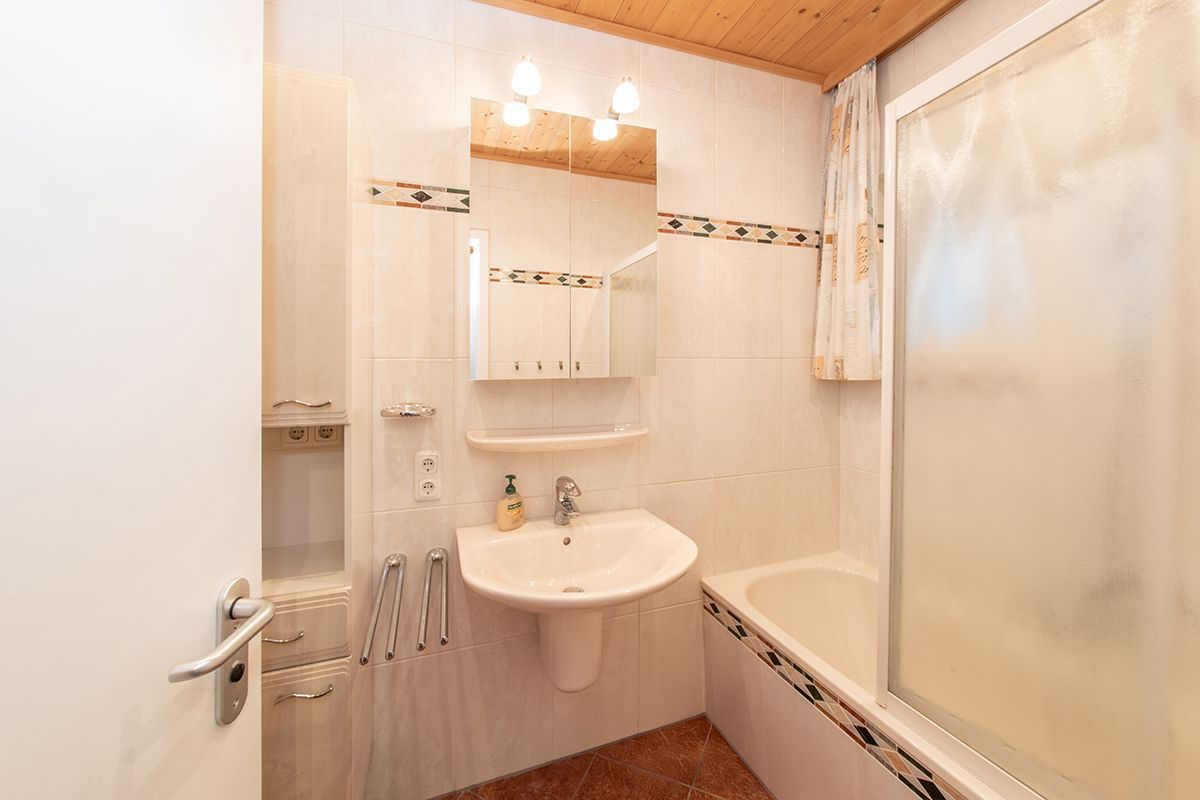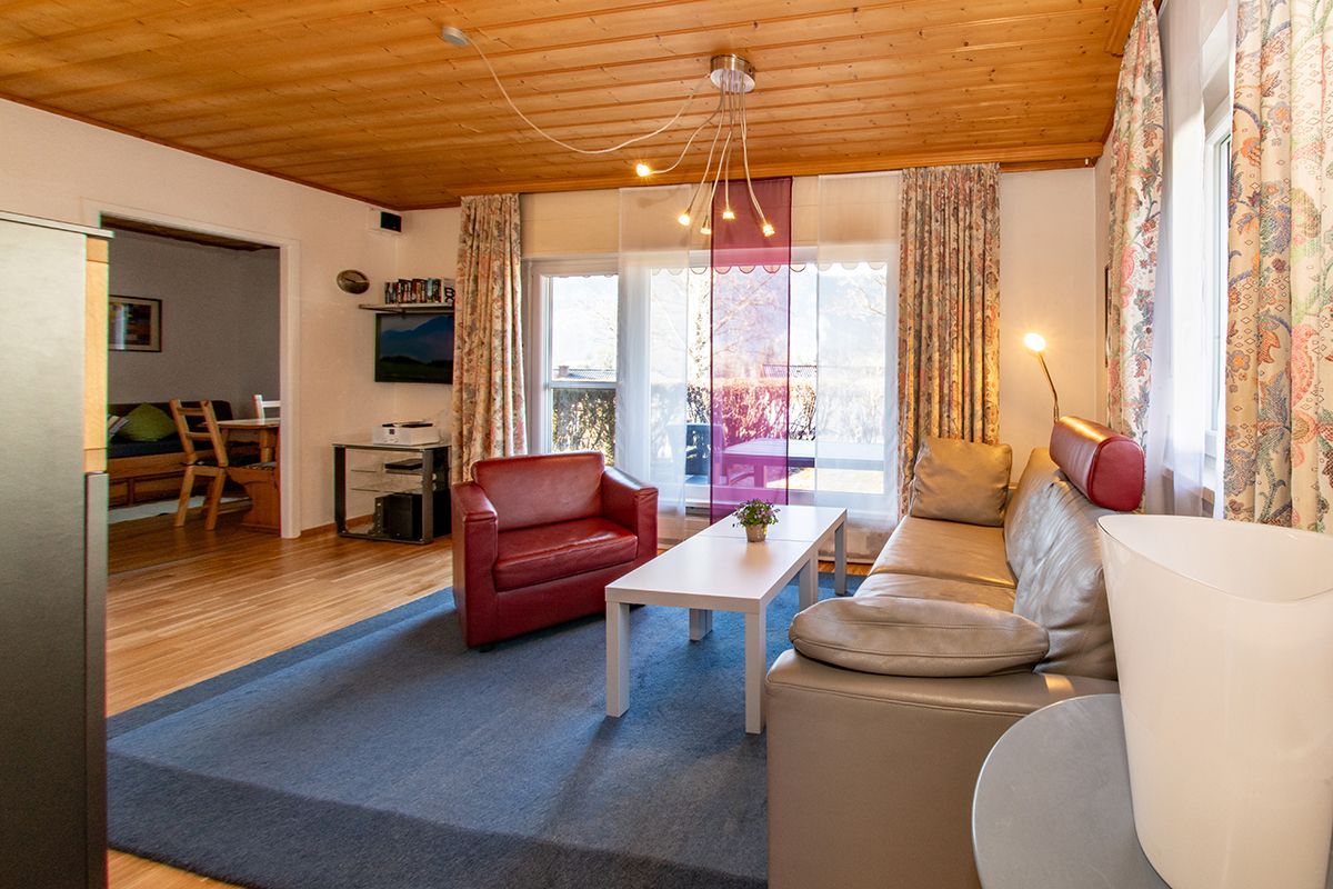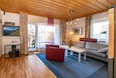 Vor dem Wohnzimmer befindet sich die großzügige, weitgehend uneinsehbare Süd-West-Terrasse mit neuer Tischgruppe und herrlichem Blick auf die Berge. Markise und Gartenmöbel laden dort in der warmen Jahreszeit zum Relaxen oder einem gemütlichen Essen im Freien ein.