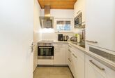 • eine Küche mit Herd, Backofen, Kühlschrank und Kaffeemaschine