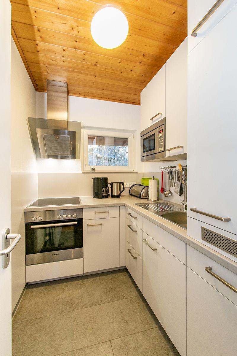 Das Haus bietet ein großes Schlafzimmer (Doppelbett) mit großzügigem Einbauschrank, ein kleines Schlafzimmer mit zwei Einzelliegen, einem weiteren Schrank und separater Essecke, ein funktionales Bad mit Badewanne/Dusche und ein separates WC. Seit Mai 2020 finden Sie eine neue, modern eingerichtete und bestens ausgestattete Küche vor. Der gesamte Wohnbereich wurde mit einem neuen, wohngesunden Eiche-Holz-Parkettboden ausgelegt.