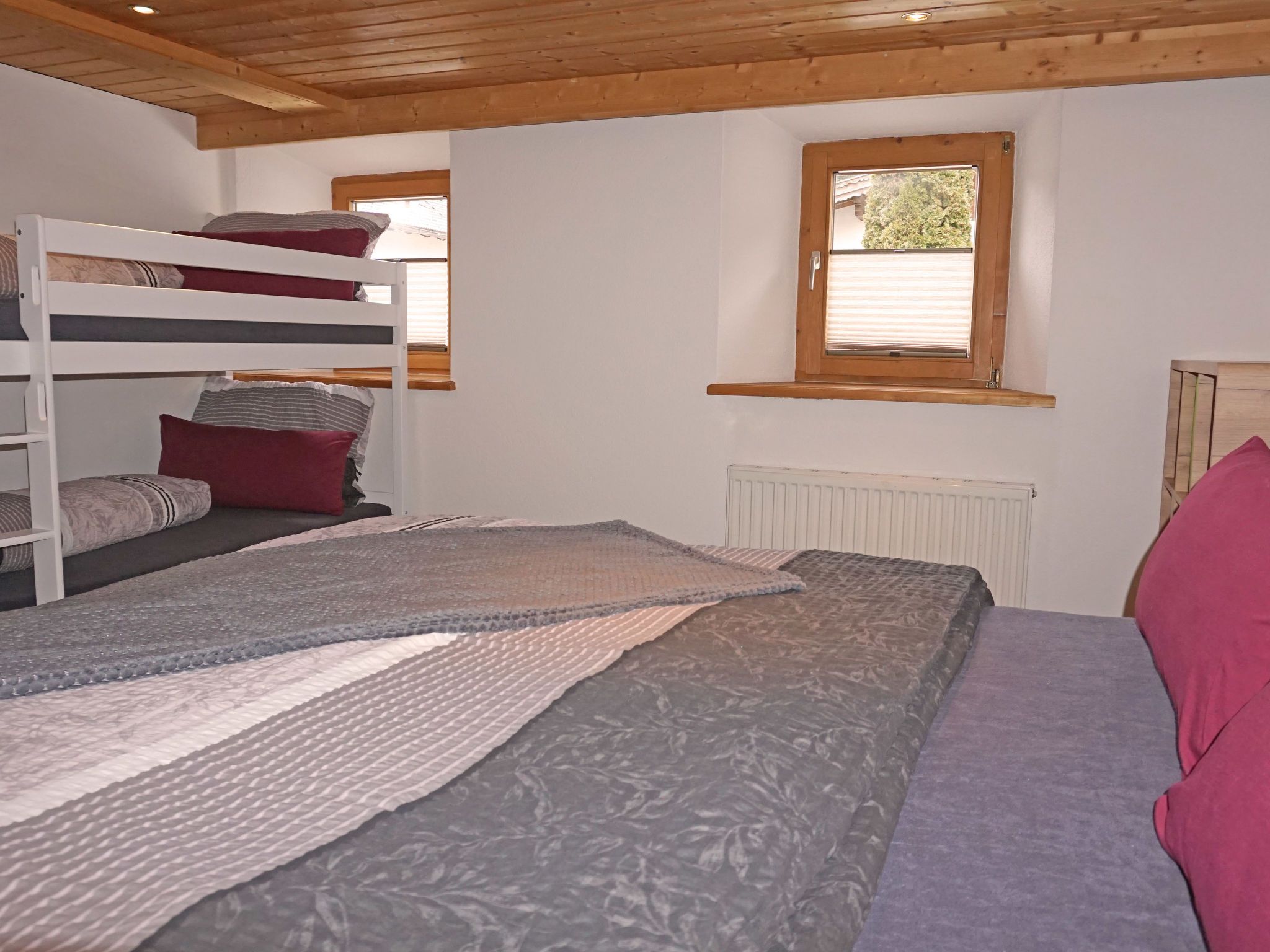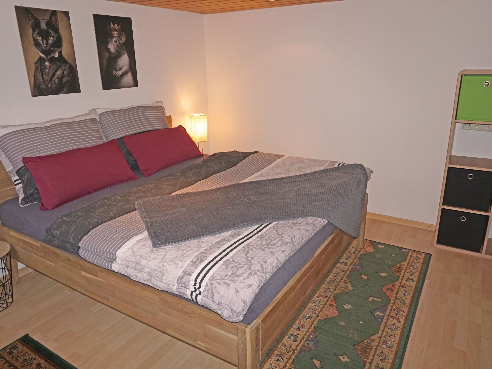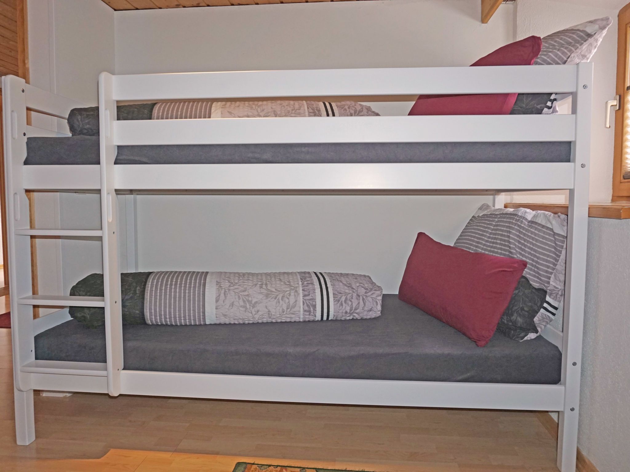 Sandra Falch, 3-Zimmer-Wohnung 65 m2 im 1. Stock. Komfortabel und gemütlich eingerichtet: Eingang. 1 Zimmer mit 1 x 2 Etagenbetten, 1 franz. Bett. Wohn-/Schlafzimmer mit 1 Diwanbett und TV (Flachbildschirm). Grosse Wohnküche (4 Glaskeramikplatten, Toaster, Wasserkocher, Mikrowelle, Tiefkühler, elektrische Kaffeemaschine, Kapseln für die Kaffeemaschine (Erstausstattung) gratis) mit Essecke. Bad/Dusche/WC mit Eckbadewanne. Heizung. Holzdielenboden. Grosse Terrasse 30 m2, Südlage und Ostlage. Terrassenmöbel. Schöne Sicht auf die Berge. Zur Verfügung: Internet (Wireless LAN, gratis). Bitte beachten: geeignet für Familien. Nichtraucher-Unterkunft. Maximal 3 Haustiere/Hunde erlaubt. Kein Fahrstuhl.